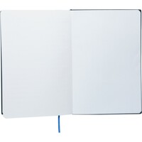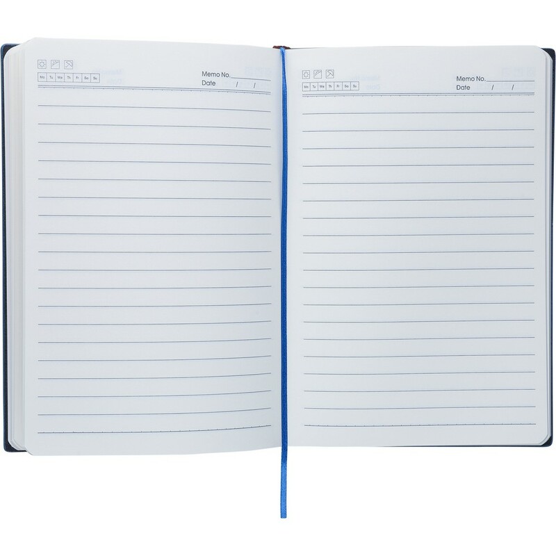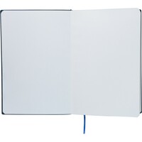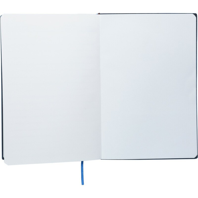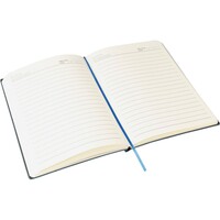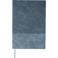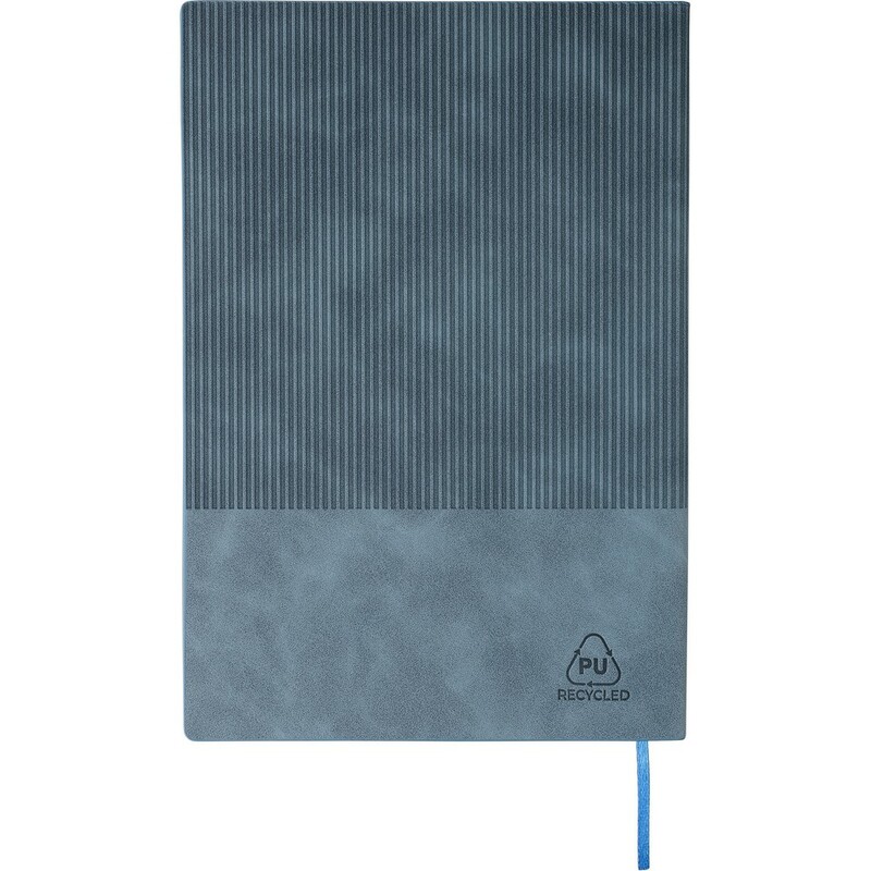 Notatnik ok. A5, 100 stron w linię (80 g/m²), twarda okładka, tasiemka zakładkowa umożliwia wygodne zaznaczanie ostatniej strony lub ważniejszych notatek, wykończenie przypominające sztruks, ikona recyklingu na produkcie, produkt wykonany z PU