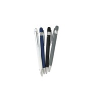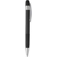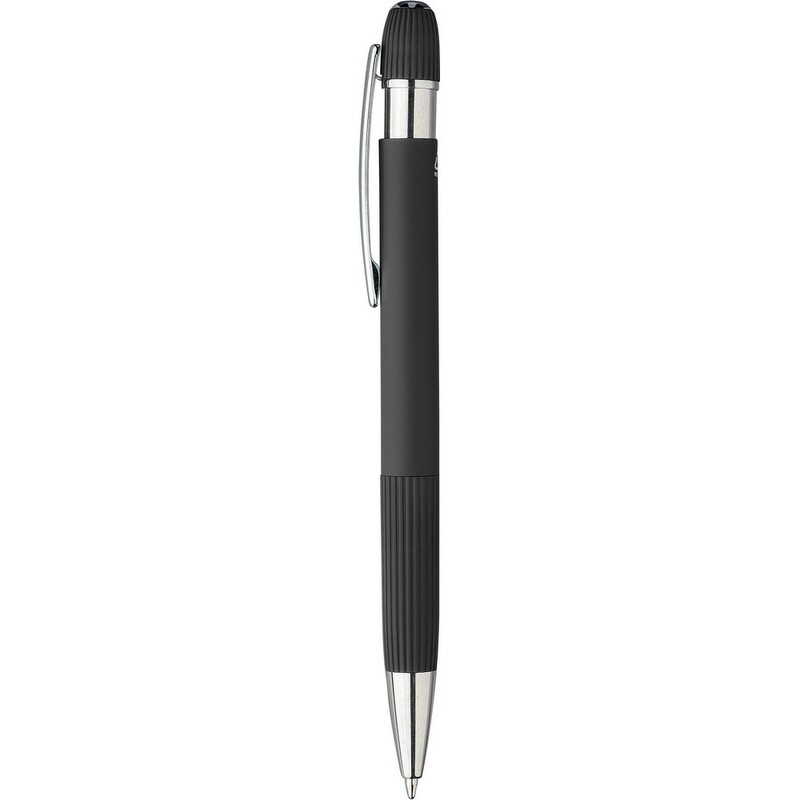 Długopis wykonany z aluminium, gumowe wykończenie, paskowane detale na trzonie i w górnej części, chromowana plastikowa końcówka, przycisk z metalowym klipsem, niebieski tusz, ikona recyklingu na produkcie