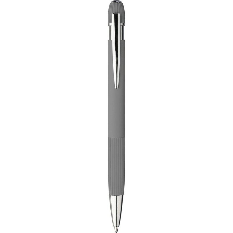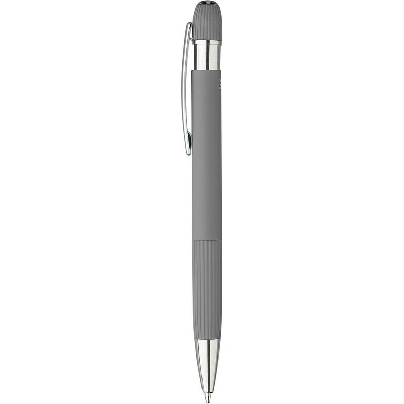Notatnik ok A5, 100 stron w linie (70 g/m²) z twardą okładką przypominającą sztruks, tasiemka zakładkowa umożliwia wygodne zaznaczanie ostatniej strony lub ważniejszych notatek, długopis w komplecie, gumowe wykończenie, paskowane detale na trzonie i w górnej części, chromowana plastikowa końcówka, ikona recyklingu na obu produktach, zapakowane w brązowe kartonowe pudełko, produkt wykonany z PU i metalu