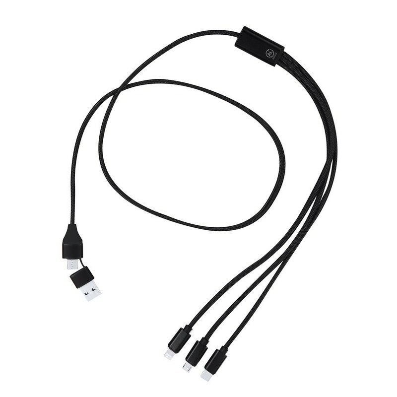 Kabel do ładowania z 5 końcówkami: 2x USB-C, USB, micro USB oraz kompatybilna z urządzeniami iOS, co umożliwia jednoczesne ładowanie kilku urządzeń o różnych złączach, produkt wykonany z aluminium z recyklingu, zgodny z certyfikatem GRS (Global RecycIed Standard)