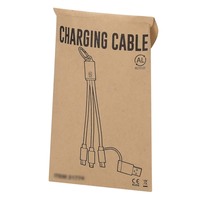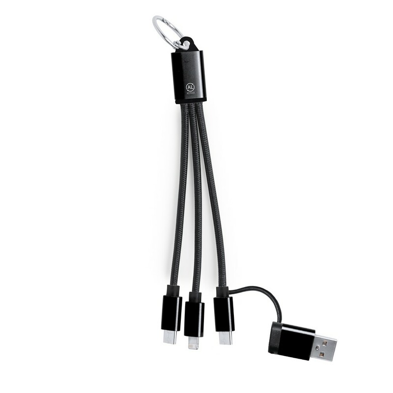 Kabel do ładowania z 4 końcówkami: USB-C, USB, micro USB oraz kompatybilna z urządzeniami iOS, co umożliwia jednoczesne ładowanie kilku urządzeń o różnych złączach, produkt wykonany z aluminium z recyklingu, zgodny z certyfikatem GRS (Global RecycIed Standard)