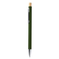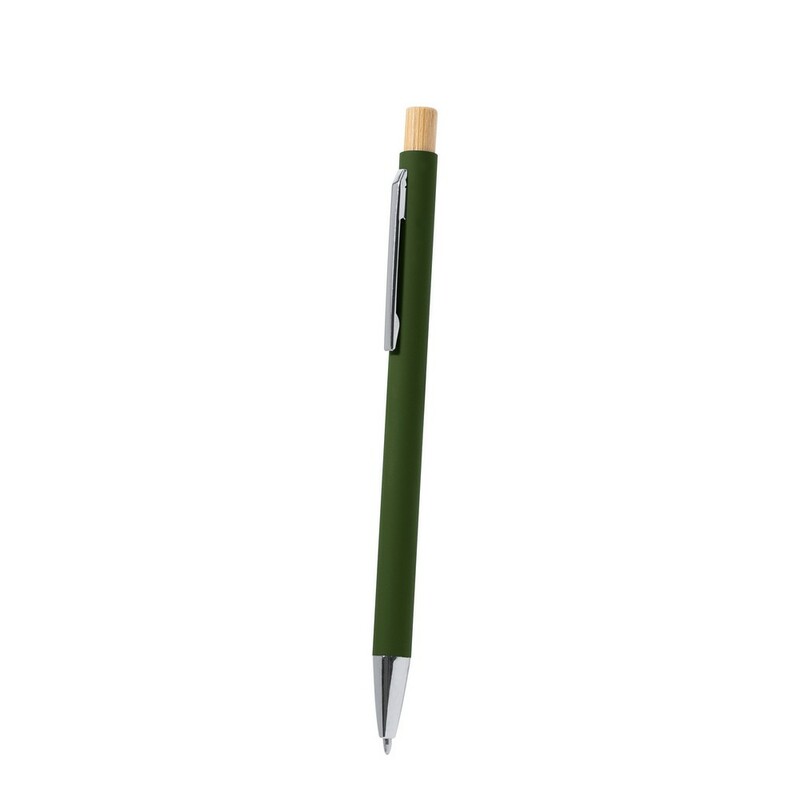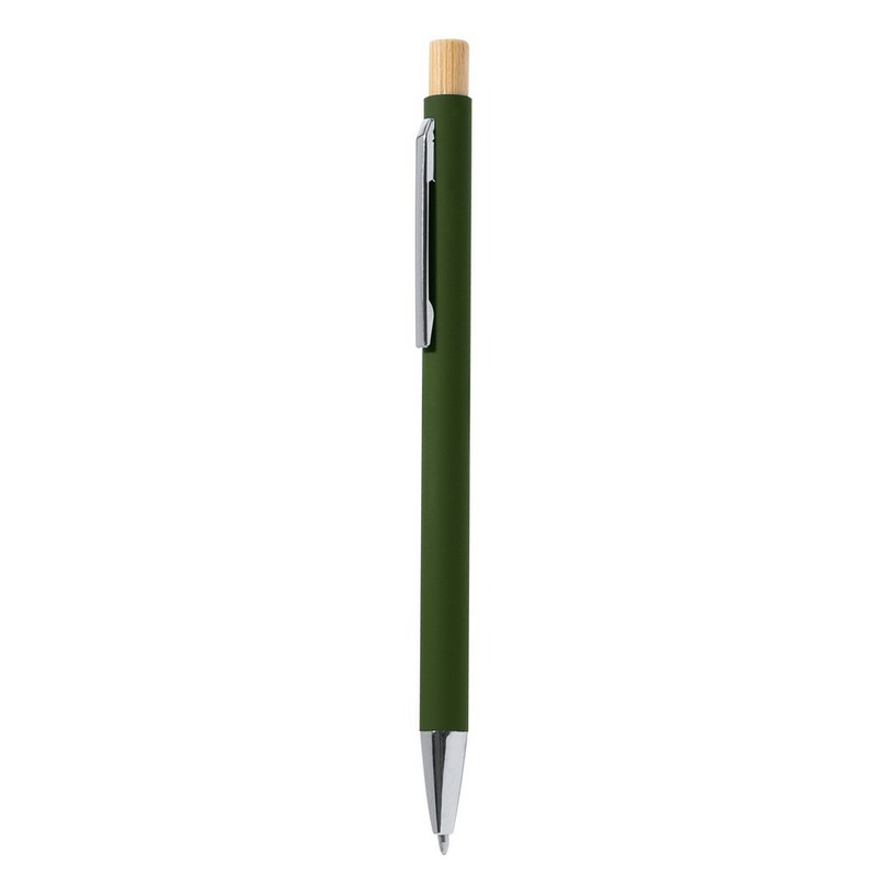 Długopis, posiada bambusowy przycisk, wkład w niebieskim kolorze, produkt wykonany z aluminium z recyklingu i bambusa, zgodny z certyfikatem GRS (Global RecycIed Standard)