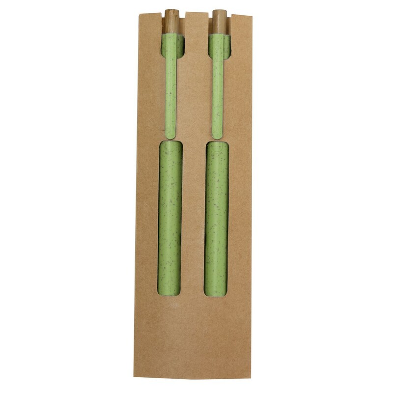 Zestaw piśmienniczy w etui z kartonu z recyklingu, długopis i "wieczny" ołówek ze specjalną wolnościerającą się końcówką, wkład długopisu w niebieskim kolorze, posiadają bambusowe przyciski, produkt wykonany ze słomy pszenicznej, ABS i bambusa