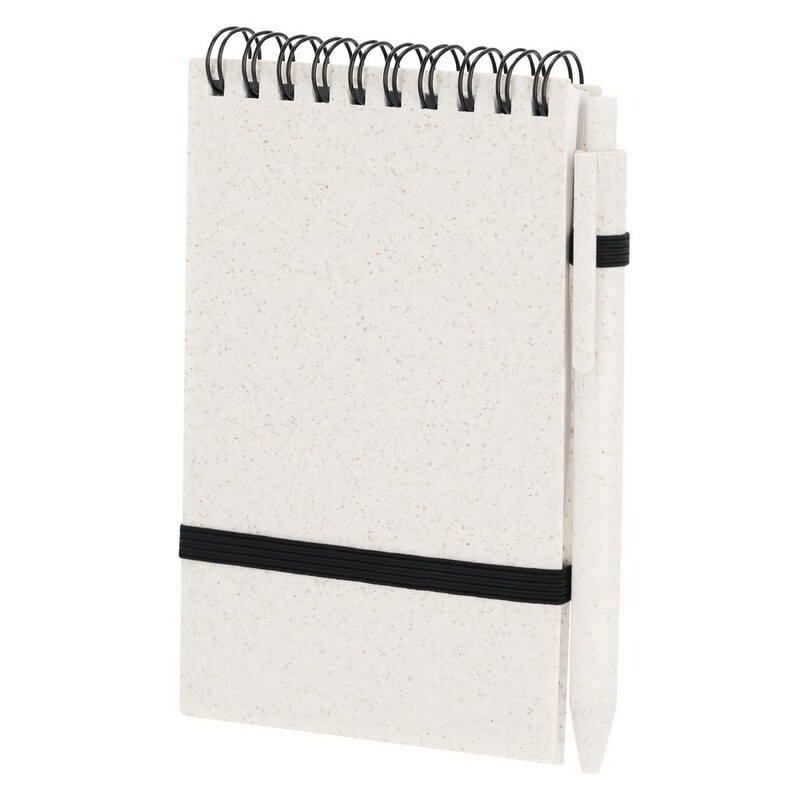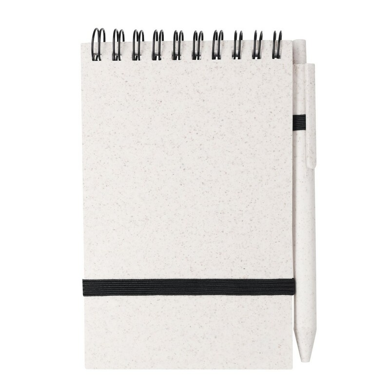 Zestaw biurowy, kubek podróżny 370 ml, notatnik, posiada 70 kartek w linie, elastyczna okładka, długopis z wkładem w niebieskim kolorze, produkt wykonany ze słomy pszenicznej i PP