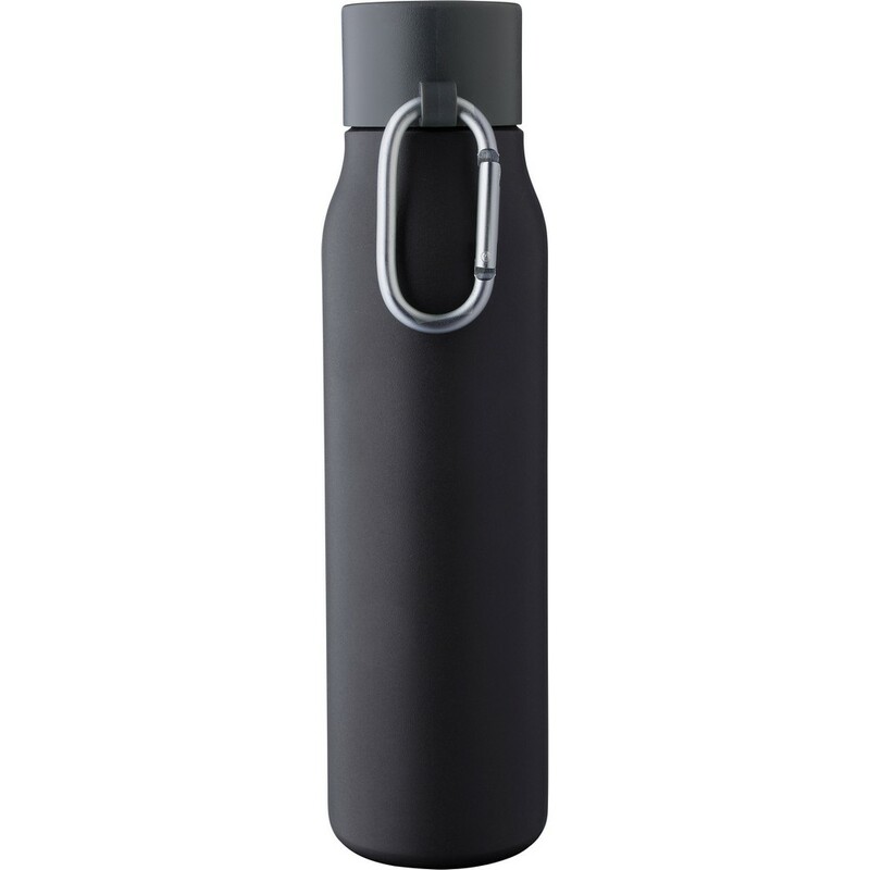 Butelka termiczna 600 ml, uchwyt ułatwiający przenoszenie, utrzymuje temperaturę napojów – ciepłych do 6 godzin, zimnych do 9 godzin, na przedniej części ikona aluminium z recyklingu na produkcie, pakowana pojedynczo w brązowe kartonowe pudełko, wnętrze wykonane ze stali nierdzewnej 304, zewnętrzna warstwa ze stali nierdzewnej 201,szczelna czarna nakrętka z PP, aluminiowy karabińczyk