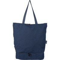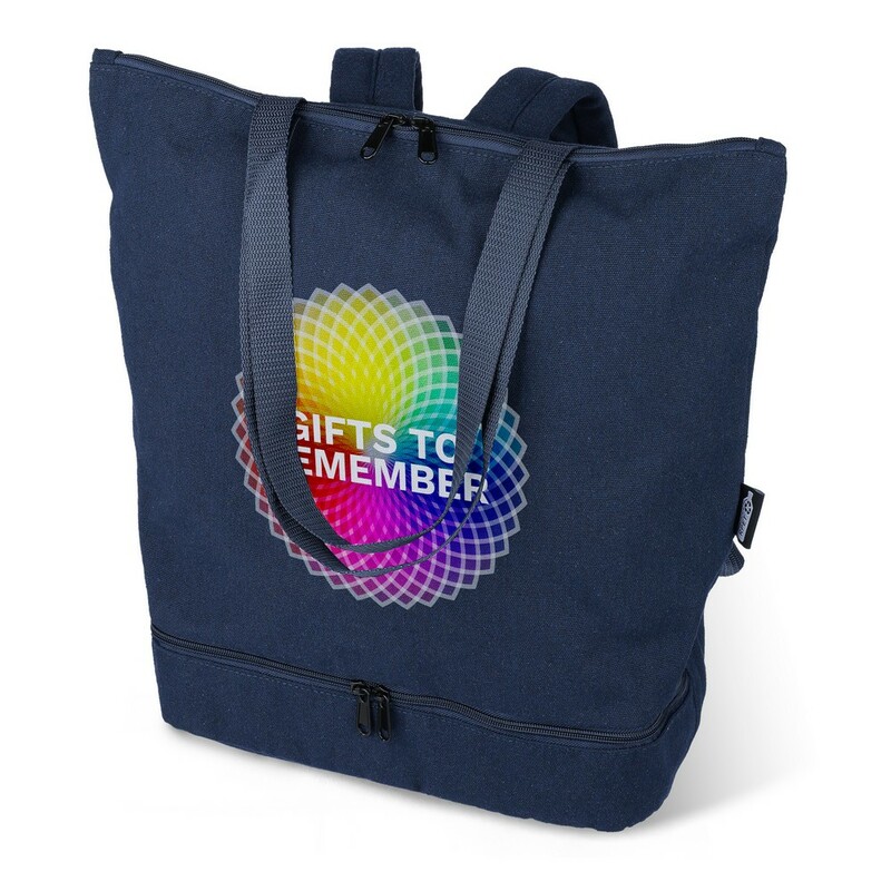 Plecak z funkcją torby na ramię, posiada dużą komorę zapinaną na zamek na górze, komorę zapinaną na zamek na dole, przegrodę na laptopa 15", dwie kieszenie wewnętrzne oraz jedną zewnętrzną kieszeń na zamek, konstrukcja obejmuje długie uchwyty do noszenia, wyściełane, regulowane szelki, pojemność: 30L, maksymalne obciążenie: 15 kg, produkt wykonany polibawełny z recyklingu (330 g/m²), podszewka z poliestru 210D