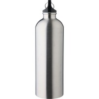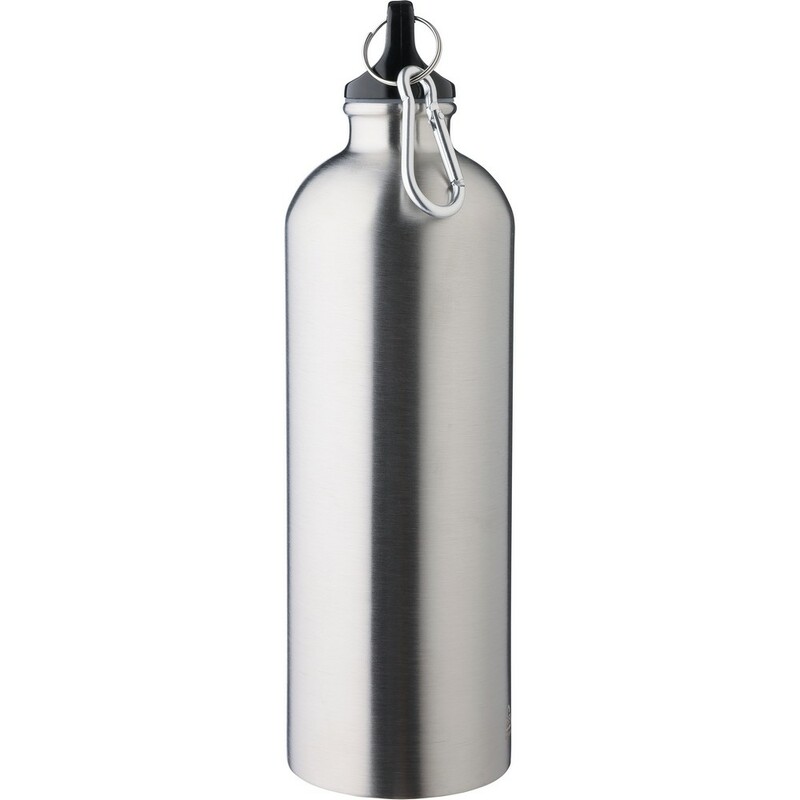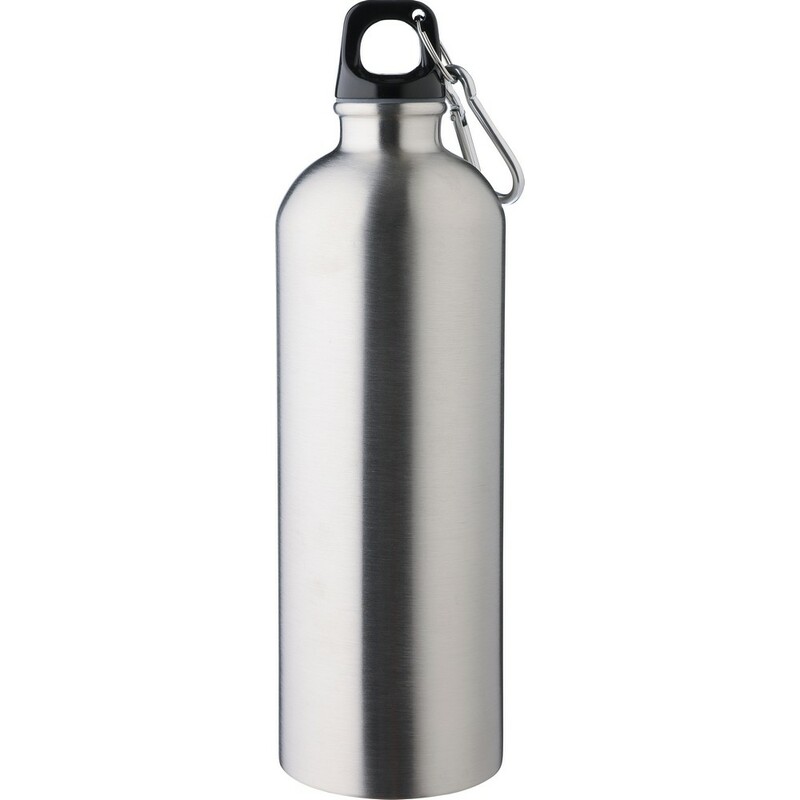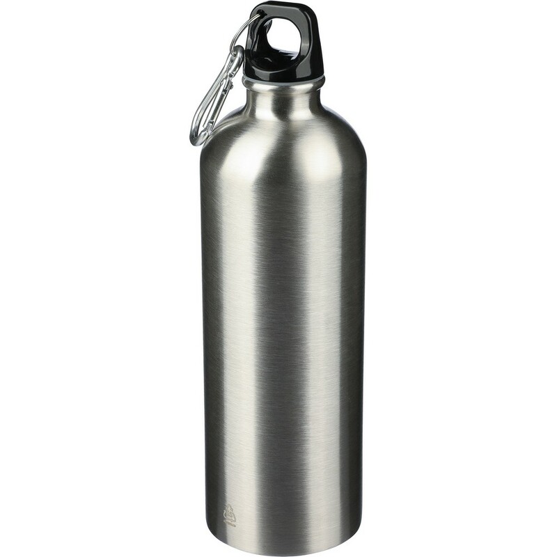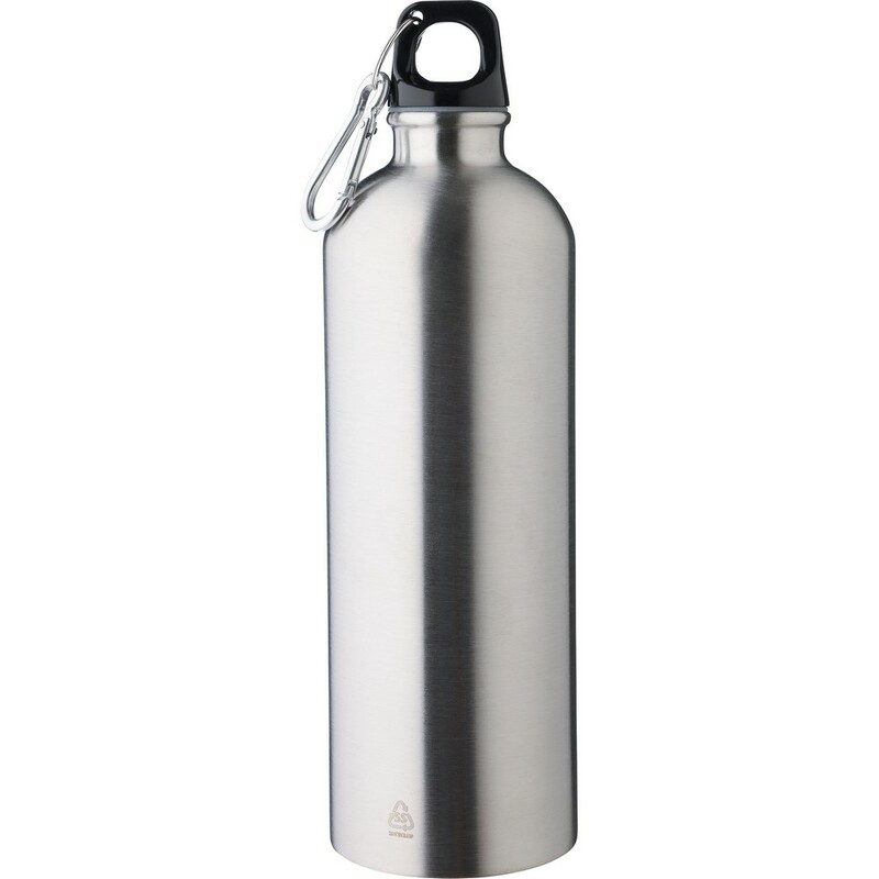 Butelka sportowa 750ml, jednowarstwowa, ikona recyklingu na produkcie, nie nadaje się do mycia w zmywarce, produkt wykonany ze stali nierdzewnej z recyklingu, nakrętka z PP, srebrny aluminiowy karabińczyk