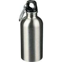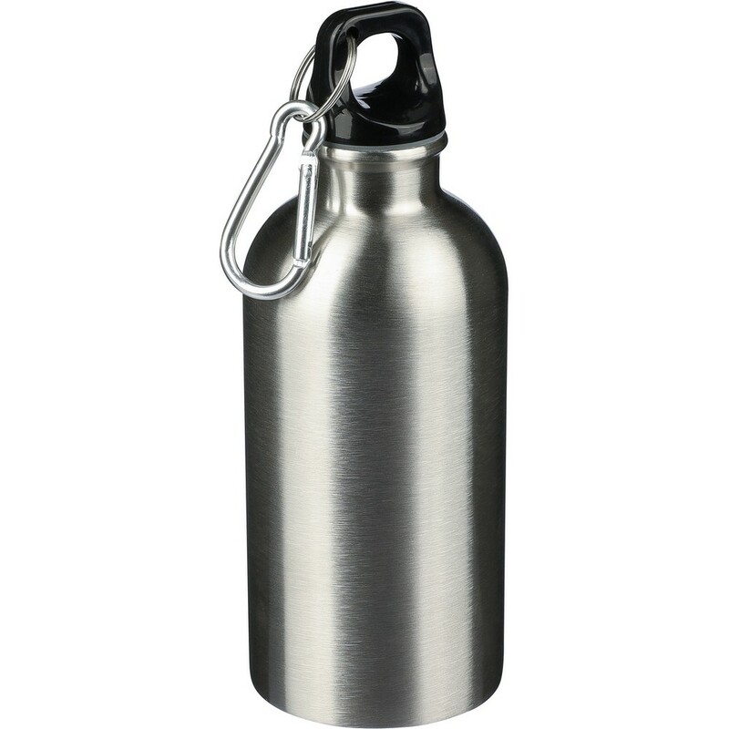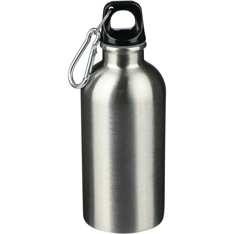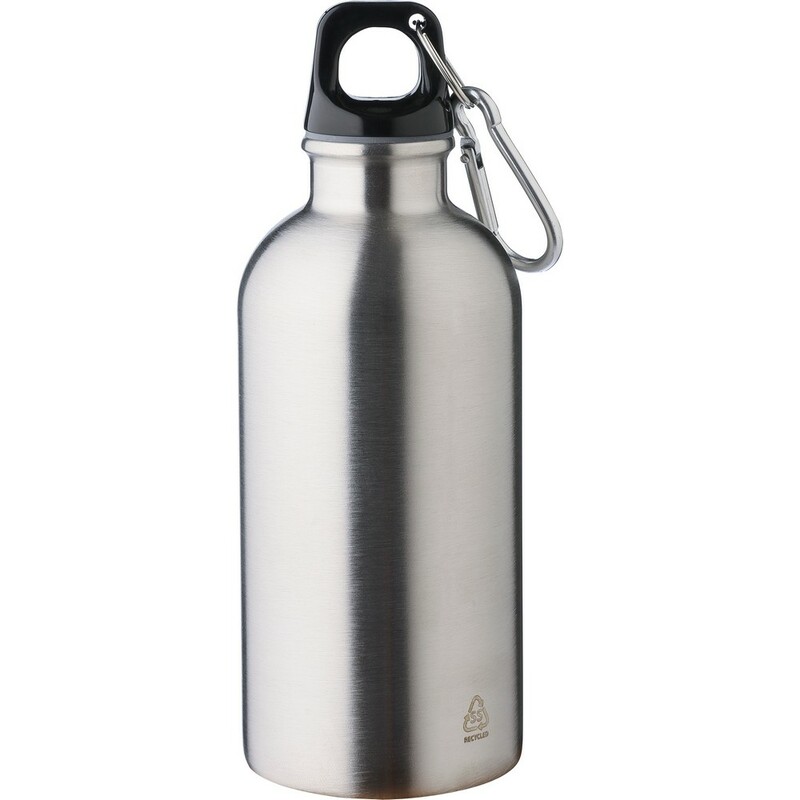 Butelka sportowa 400 ml, ikona recyklingu na produkcie, nie nadaje się do mycia w zmywarce, produkt wykonany ze stali nierdzewnej z recyklingu, nakrętka z PP, srebrny aluminiowy karabińczyk