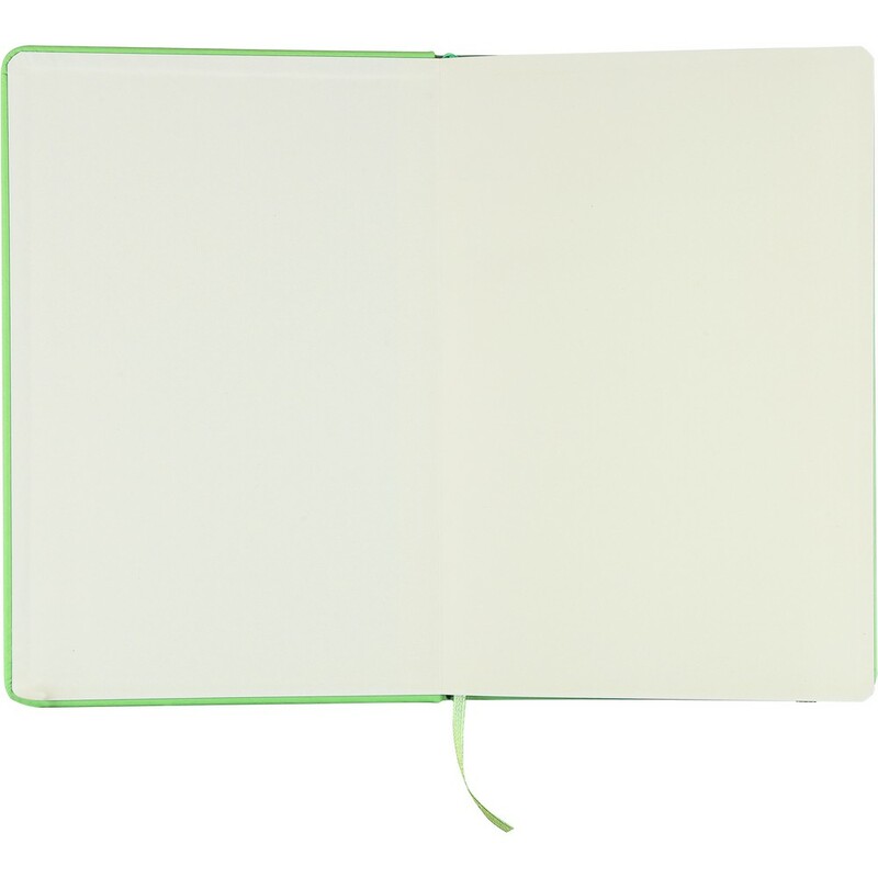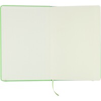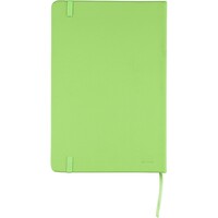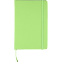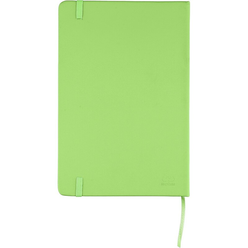 Notatnik ok. A5 RPET, z twardą okładką wykonaną z RPET PU, zawierający 80 stron w linie (70 g/m²), tasiemka zakładkowa umożliwia wygodne zaznaczanie ostatniej strony lub ważniejszych notatek, dodatkowe zamknięcie w postaci kolorowej elastycznej opaski, ikona recyklingu na tylnej stronie