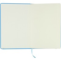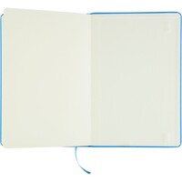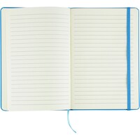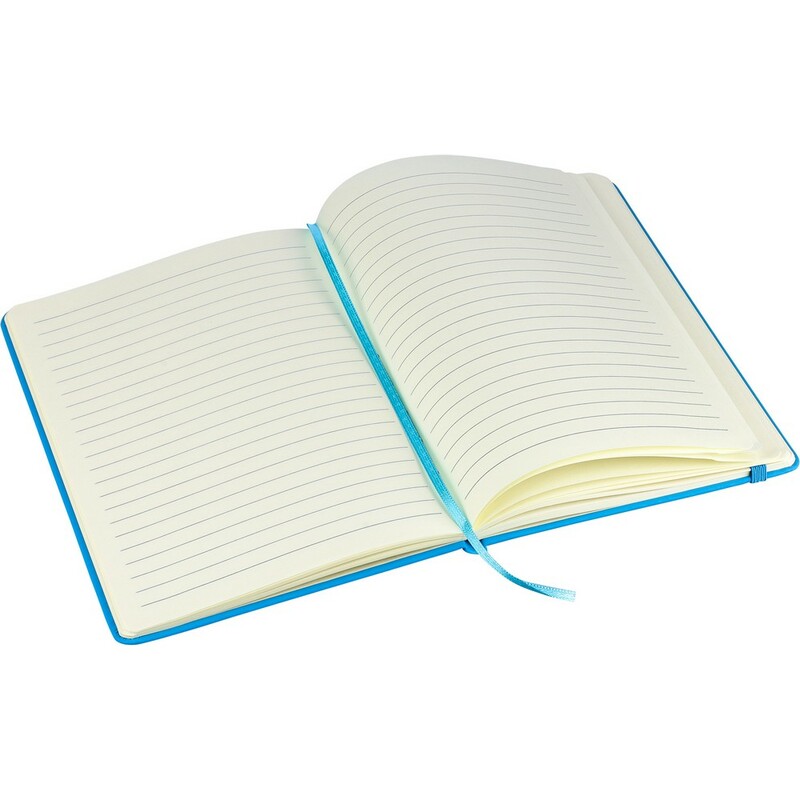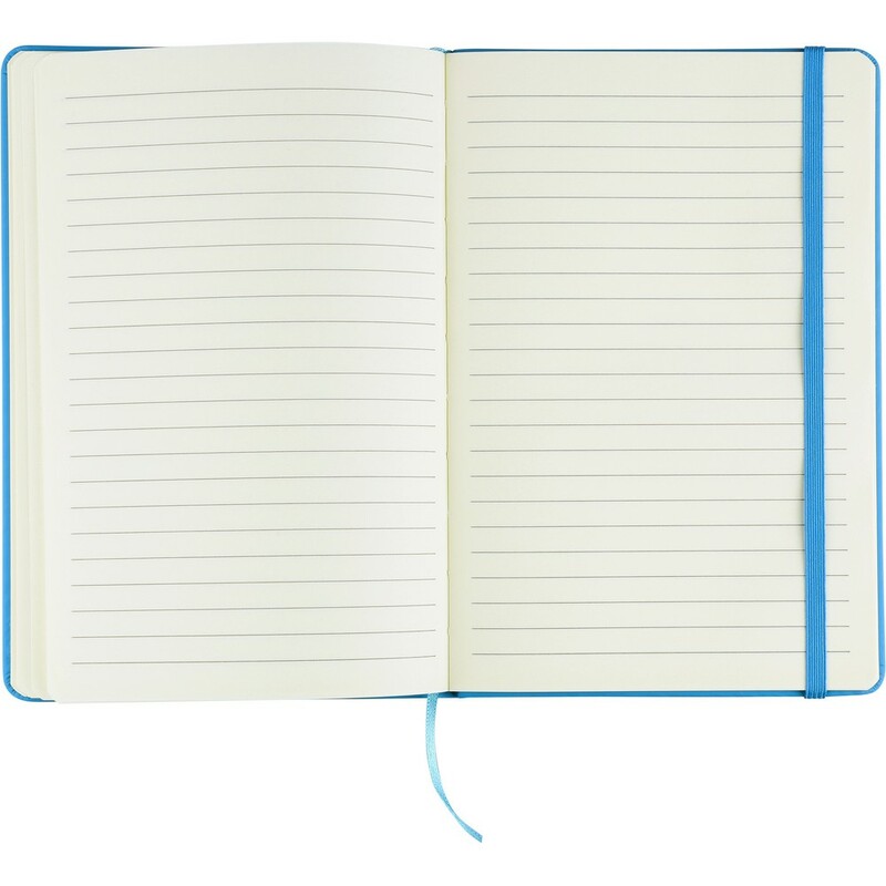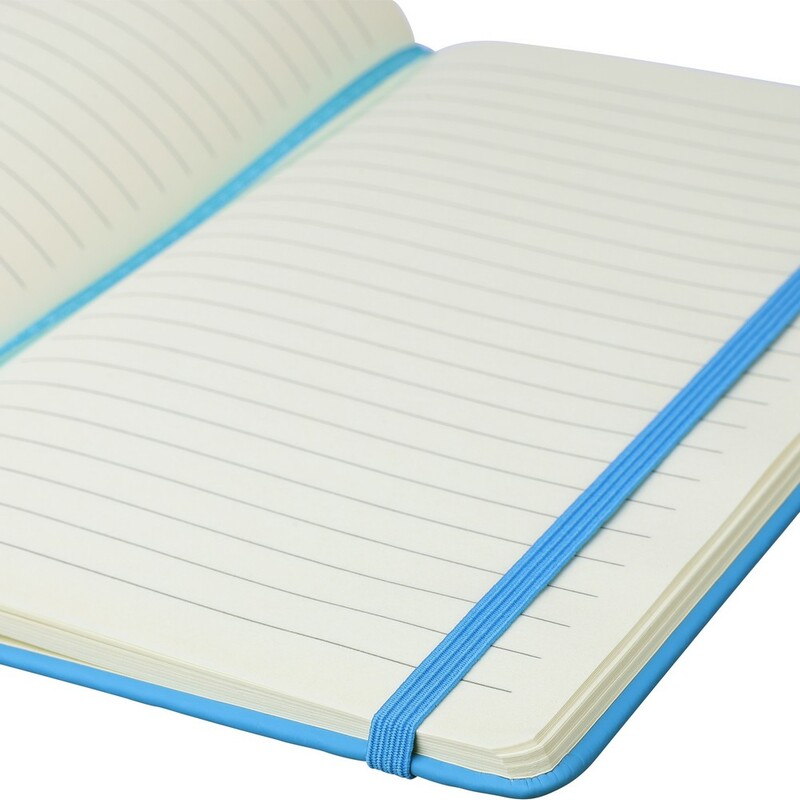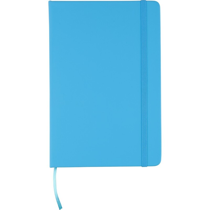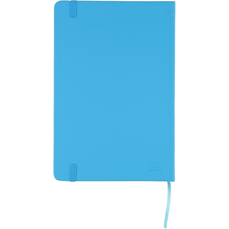 Notatnik ok. A5 RPET, z twardą okładką wykonaną z RPET PU, zawierający 80 stron w linie (70 g/m²), tasiemka zakładkowa umożliwia wygodne zaznaczanie ostatniej strony lub ważniejszych notatek, dodatkowe zamknięcie w postaci kolorowej elastycznej opaski, ikona recyklingu na tylnej stronie