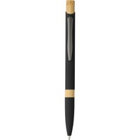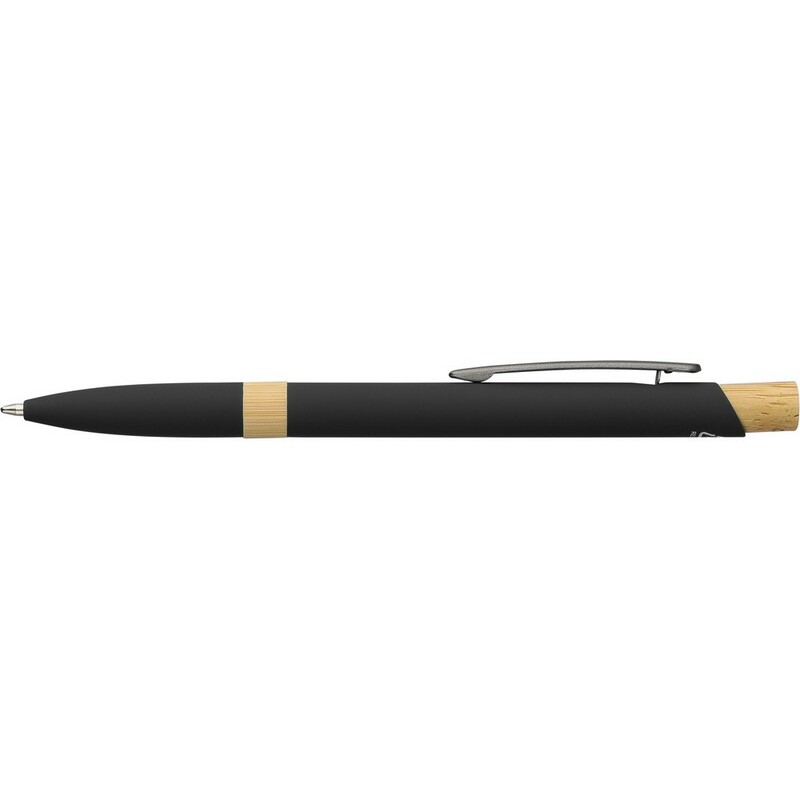 Długopis z aluminium z recyklingu, z gumowaną powłoką, bambusowym przyciskiem i bambusowym pierścieniem w korpusie, wyposażony w mechanizm przyciskowy, wkład o grubości 1,0 mm oraz niebieski tusz o szacunkowej długości pisania 800 metrów, ikona aluminium z recyklingu na produkcie