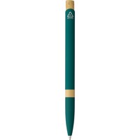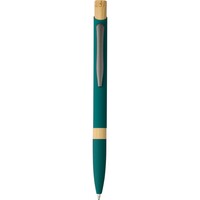 Długopis z aluminium z recyklingu, z gumowaną powłoką, bambusowym przyciskiem i bambusowym pierścieniem w korpusie, wyposażony w mechanizm przyciskowy, wkład o grubości 1,0 mm oraz niebieski tusz o szacunkowej długości pisania 800 metrów, ikona aluminium z recyklingu na produkcie
