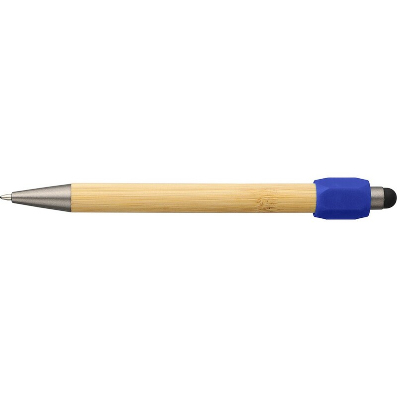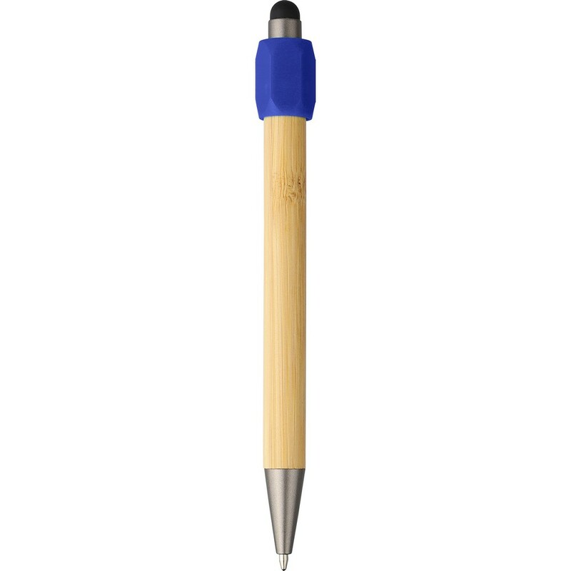 Bambusowy długopis z funkcją spinnera z ABS z recyklingu, czarna końcówka dotykowa na przycisku, wyposażony w mechanizm przyciskowy, wkład o grubości 1,0 mm oraz niebieski tusz o szacunkowej długości pisania 800 metrów, ikona ABS z recyklingu na produkcie