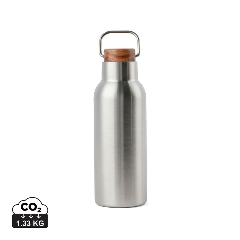 Butelka termiczna 580 ml, podwójne ścianki ze stali nierdzewnej z próżnią pomiędzy, wykonana ze stali nierdzewnej z recyklingu z certyfikatem RCS, drewniane wieczko z uchwytem, całkowita zawartość materiałów z recyklingu obliczona na podstawie wagi całkowitej przedmiotu: 75%, wyłącznie mycie ręczne, w pudełku z papieru kraftowego z certyfikatem FSC®