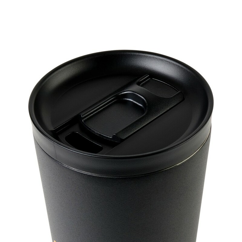 Kubek termiczny 500 ml, posiada podwójne ścianki ze stali nierdzewnej z próżnią między ściankami, co spowalnia oddawanie temperatury na zewnątrz, zachowując funkcje termosu, wykonany z materiałów z recyklingu
