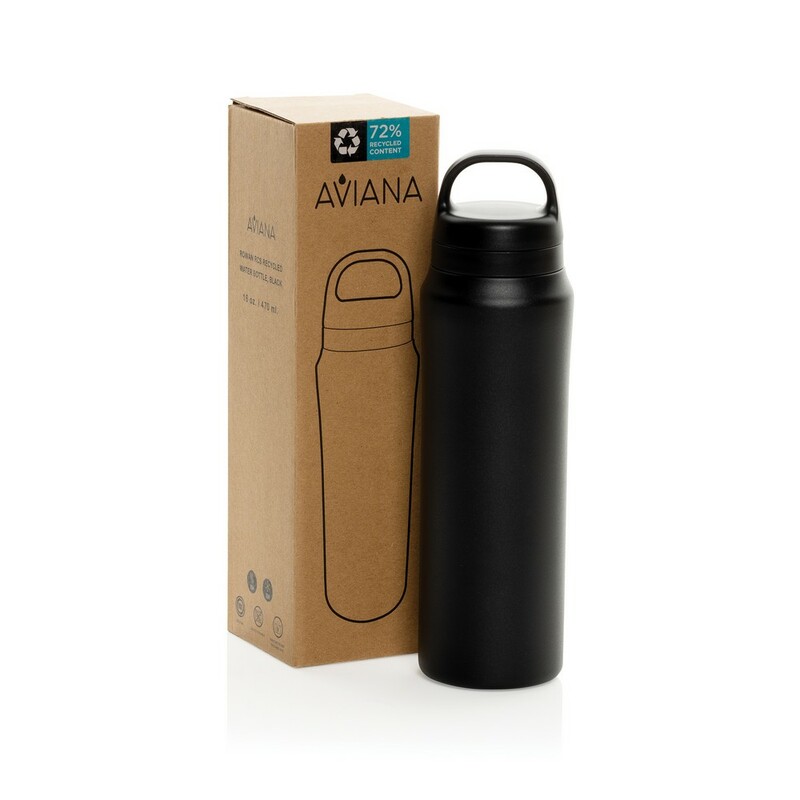Butelka termiczna 470 ml, posiada podwójne ścianki ze stali nierdzewnej z próżnią między ściankami, co spowalnia oddawanie temperatury na zewnątrz, zachowując funkcje termosu, wykonana z materiałów z recyklingu