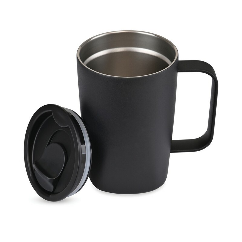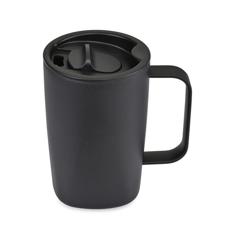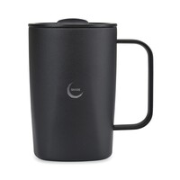 Kubek termiczny 450 ml, posiada podwójne ścianki ze stali nierdzewnej z próżnią między ściankami, co spowalnia oddawanie temperatury na zewnątrz, zachowując funkcje termosu, wykonany z materiałów z recyklingu