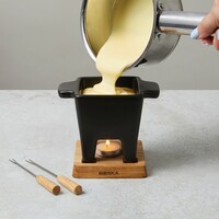 Zestaw do serwowania fondue, ceramiczne naczynie oraz drewniana podstawka na świeczkę, może zostać wykorzystany do przygotowania 175 ml fondue serowego lub 200 ml sosu, nadaje się do użycia w kuchence mikrofalowej, posiada dożywotnią gwarancję, naczynie nadaje się do mycia w zmywarce