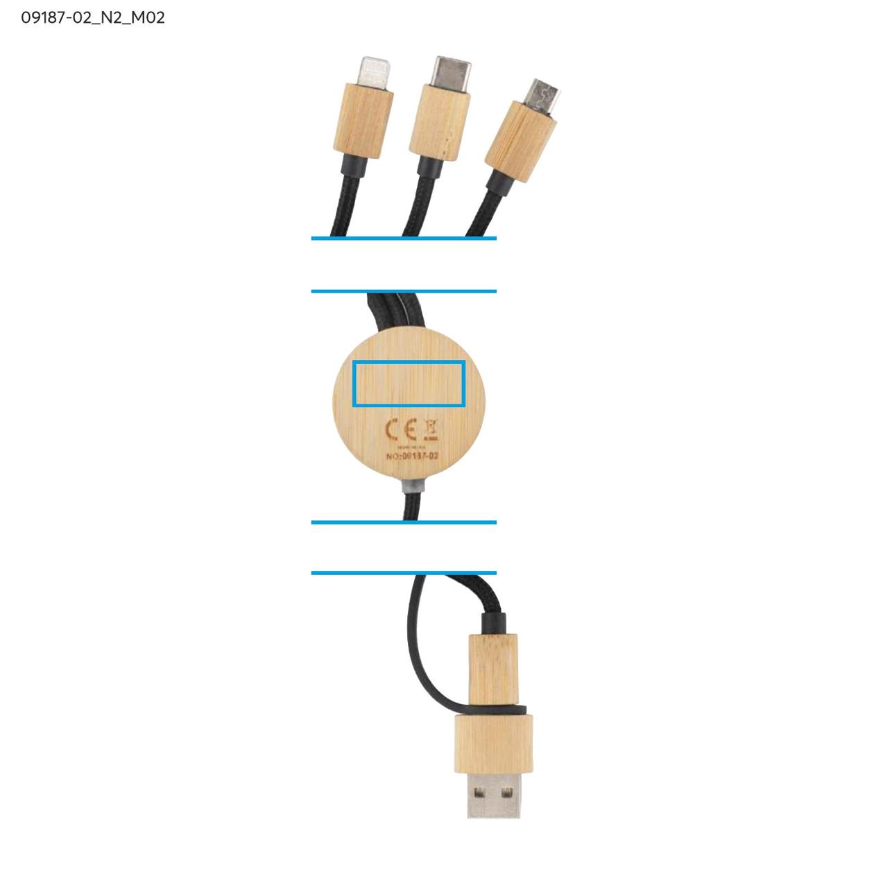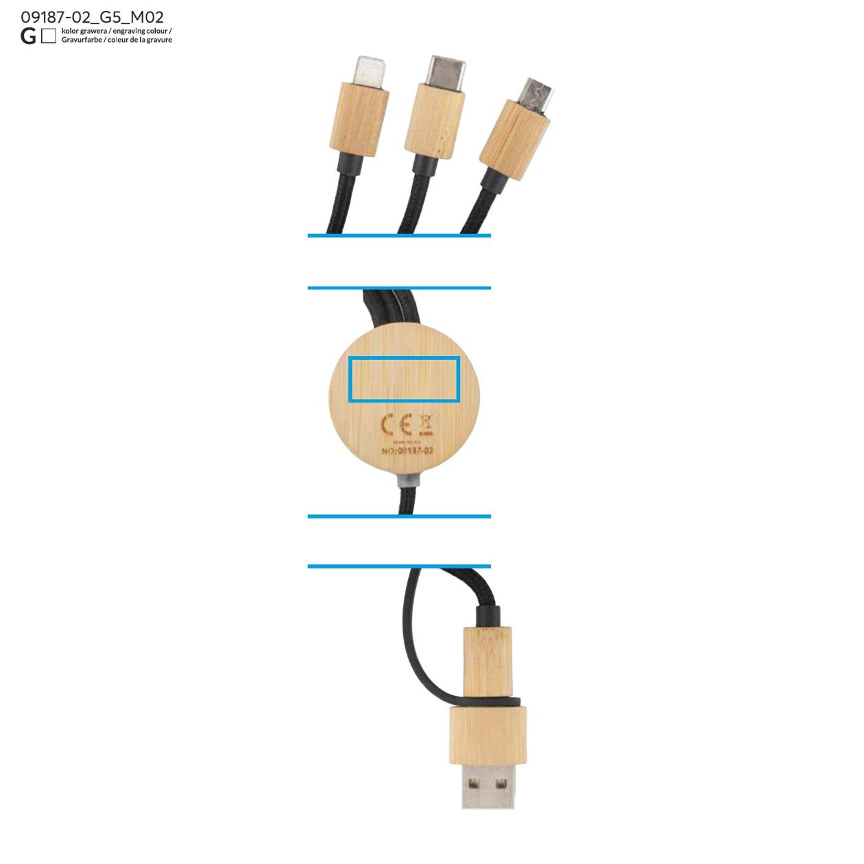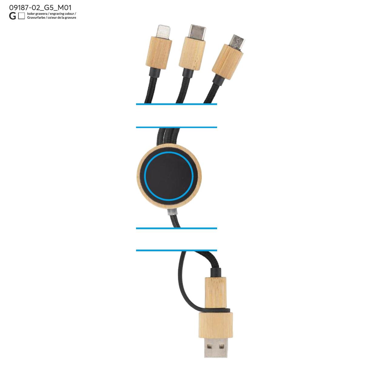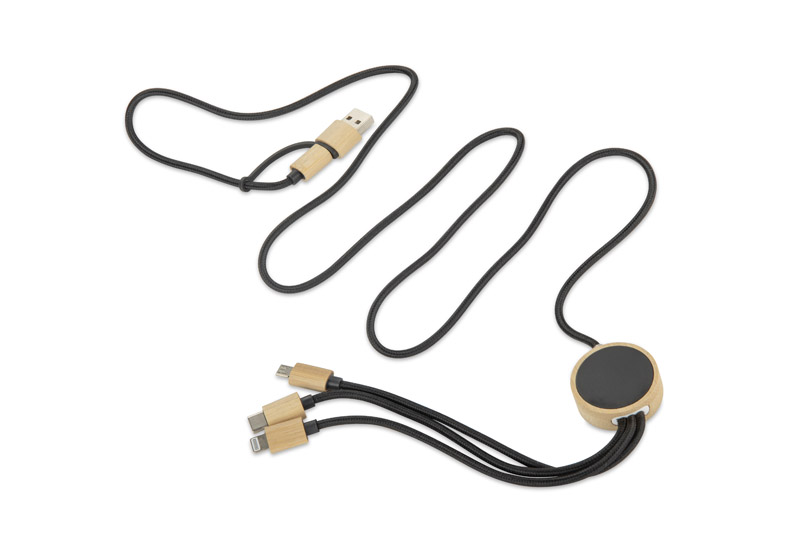 GLOWIK to uniwersalny kabel ładujący 4w1 z wykończeniem z bambusa i miejscem na znakowanie. Wyposażony w cztery złącza: USB-A, 2x USB-C, micro USB oraz Lightning, umożliwia ładowanie różnych urządzeń z mocą do 15W (5V/3A). Przewód jest pokryty trwałym oplotem, a okrągły element z bambusowym wykończeniem kryje panel do znakowania – po wykonaniu graweru logo podświetla się białym światłem LED.