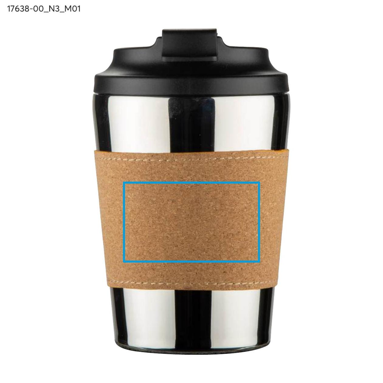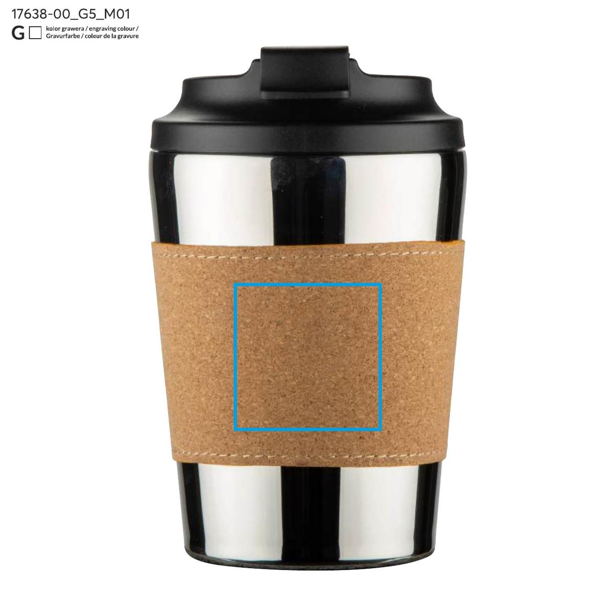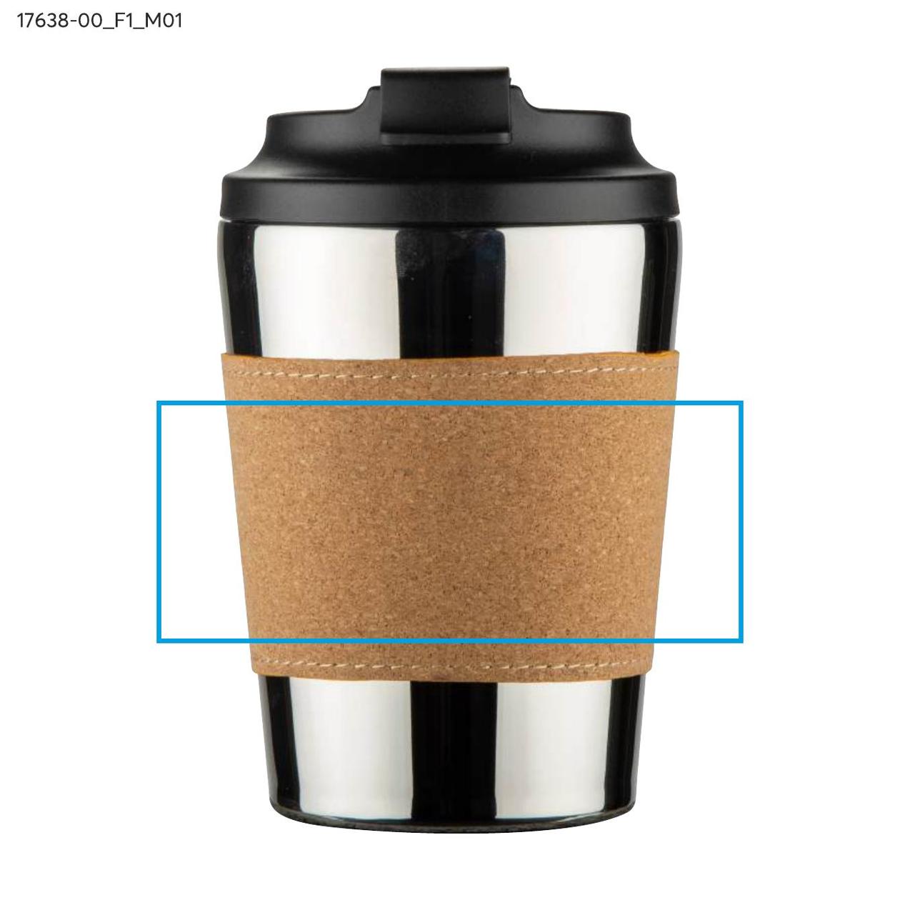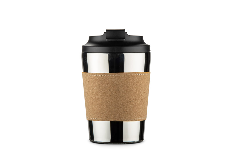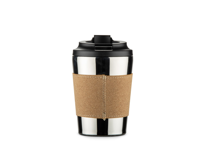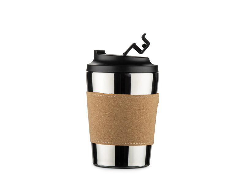 Kubek termiczny CAFFEZ o pojemności 350 ml łączy stalowe, błyszczące wykończenie z naturalną opaską z korka, tworząc elegancki i nowoczesny gadżet do kawy. Wnętrze ze stali nierdzewnej z podziałką ułatwia odmierzanie napoju, a podwójne ścianki pomagają utrzymać temperaturę do 3 godzin. Pokrywka typu flip-top z klapką otwieraną do góry zapewnia wygodne korzystanie w podróży lub w biurze. Antypoślizgowa podstawa zwiększa stabilność na gładkich powierzchniach. To propozycja dla marek, które cenią estetykę, jakość i funkcjonalność w jednym.