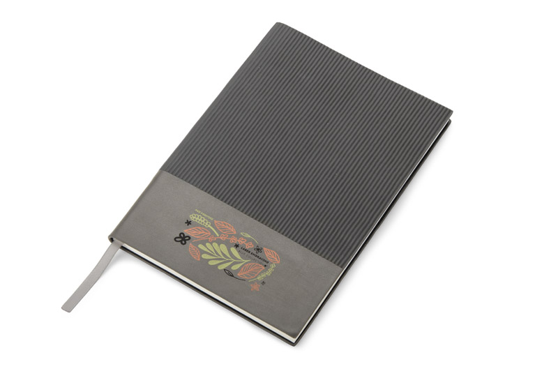Notes FLAF w formacie A5 ma miękką okładkę łączącą materiał skóropodobny (PU) z imitacją sztruksu, co nadaje mu przyjemną, tekstylną fakturę. W środku znajduje się 80 kartek w kropki oraz praktyczna wstążka pełniąca funkcję zakładki.