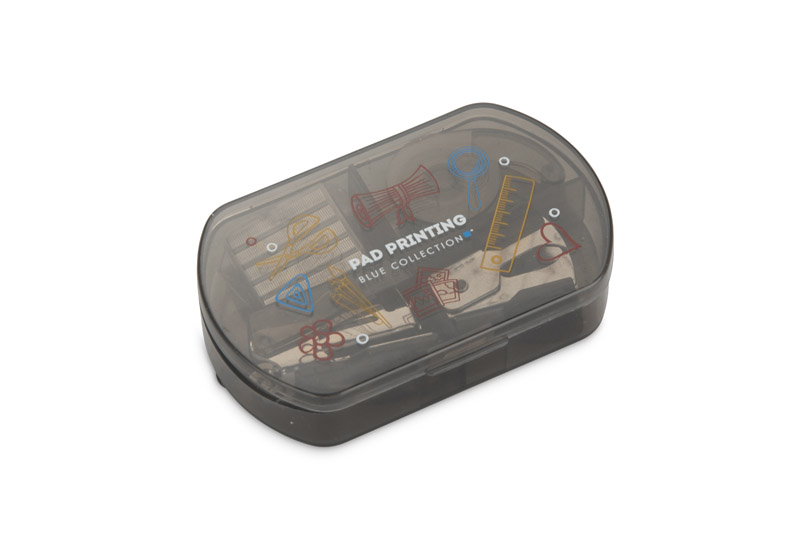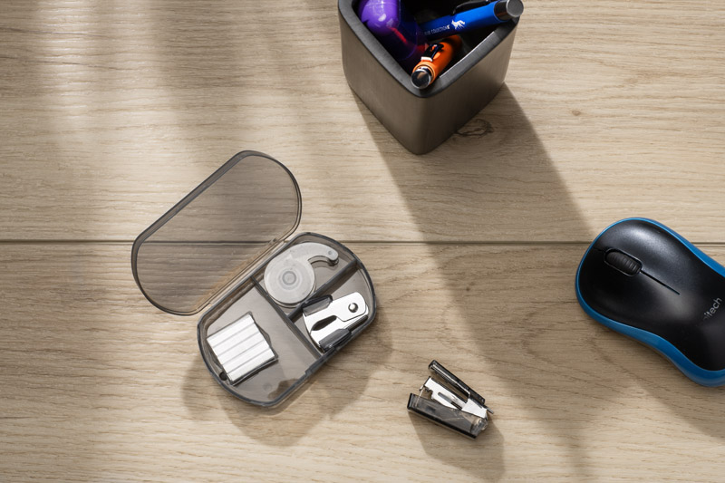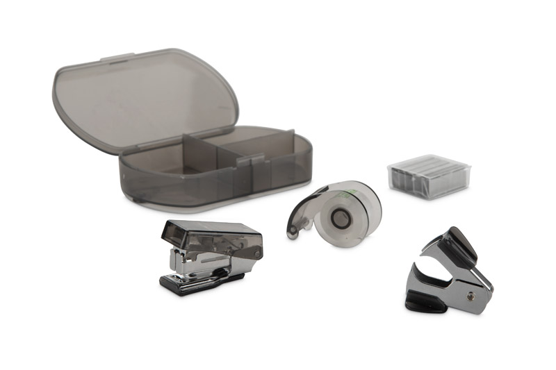 Zestaw biurowy DOCSY to kompaktowe rozwiązanie zawierające najpotrzebniejsze akcesoria: mini zszywacz, mini dziurkacz, taśmę klejącą oraz zapas zszywek – wszystko zamknięte w poręcznym etui z tworzywa. Idealny do pracy w terenie, na małym biurku lub jako praktyczny gadżet reklamowy dla branży biurowej i edukacyjnej.