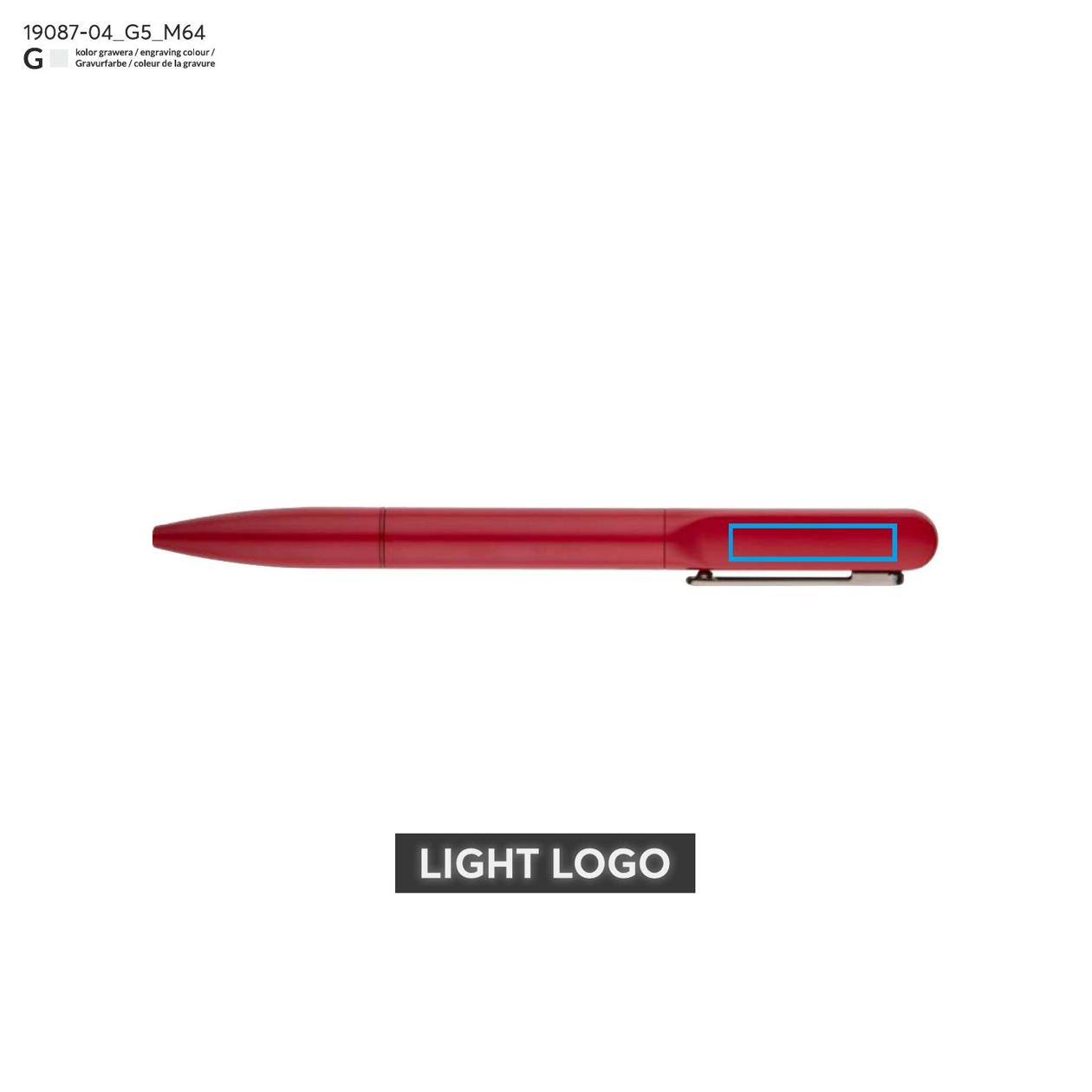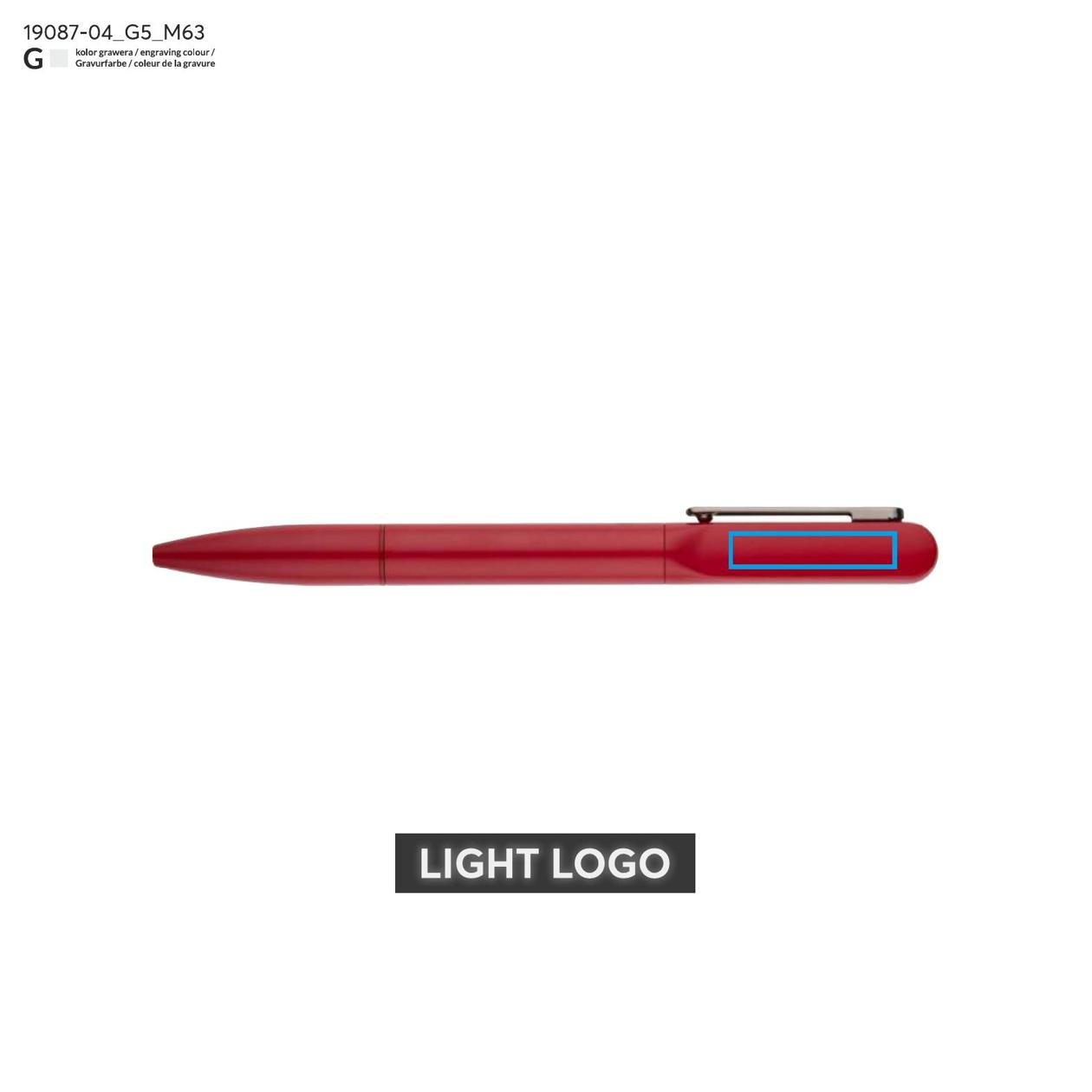 Długopis LUNNEA to nowoczesny model z podświetlanym logo – detal, który efektownie wyróżnia markę i przyciąga uwagę. Wykonany z metalu, z eleganckim, matowym wykończeniem i przekręcanym mechanizmem typu twist. Posiada metalowy klip i płaską powierzchnię do znakowania, idealną do efektu podświetlenia. Połączenie klasycznej formy i technologicznego akcentu sprawia, że LUNNEA doskonale sprawdzi się jako reprezentacyjny gadżet reklamowy.