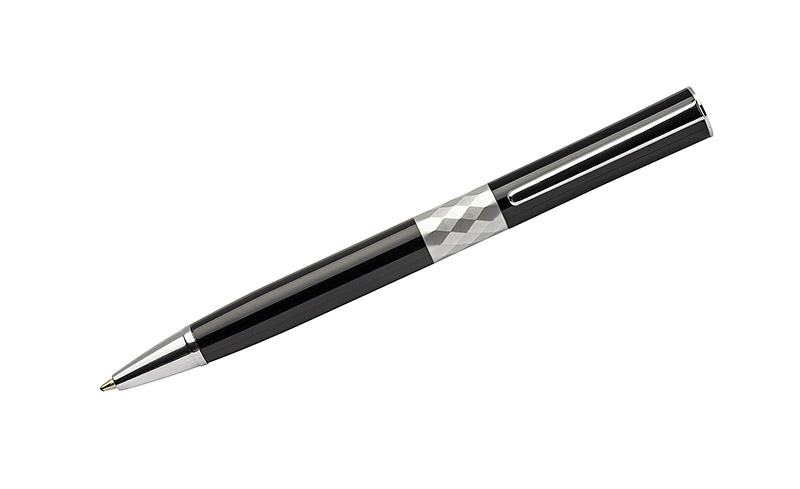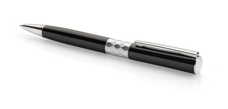 Nowoczesny długopis zaprojektowany zgodnie z najnowszymi trendami. Pośrodku metalowego korpusu znajduje się ozdobny pierścień wyglądem przypominający kryształ, dzięki czemu długopis zyskuje stylowy wygląd. Znakowanie możliwe na korpusie.