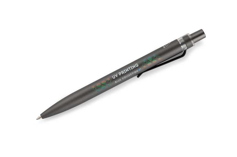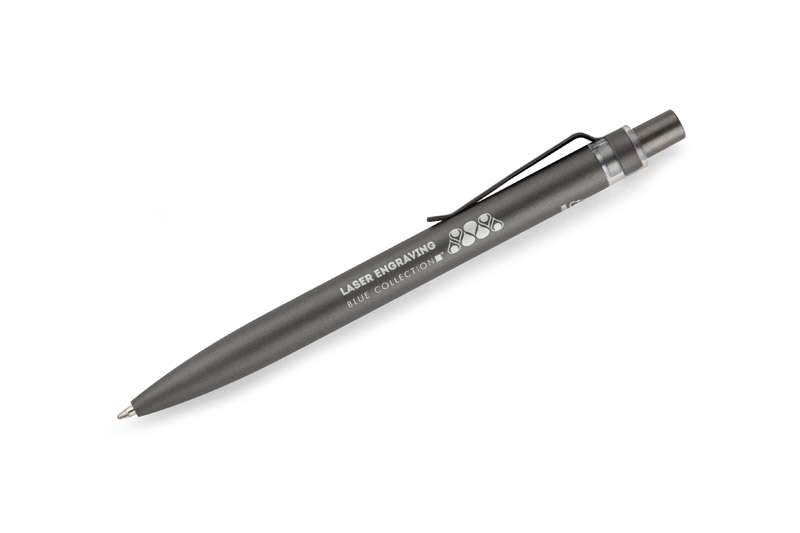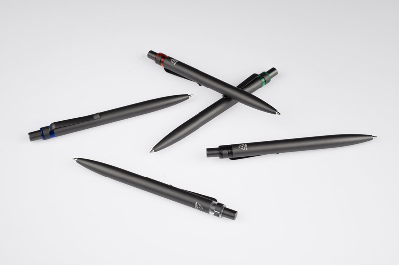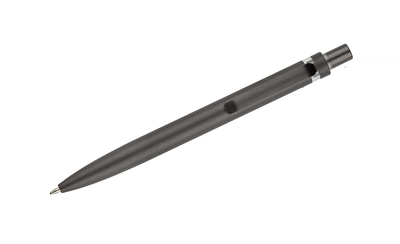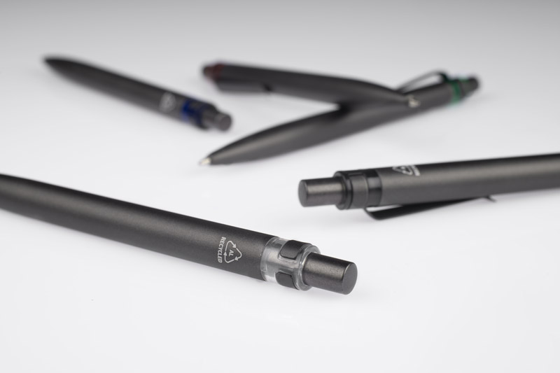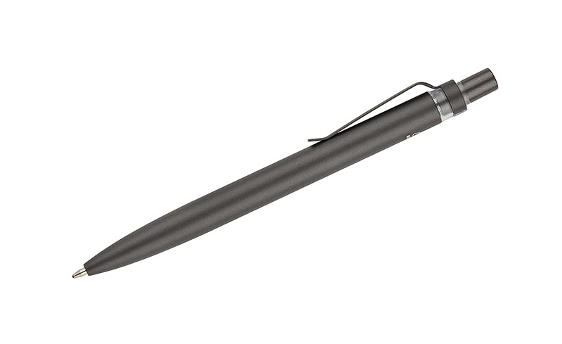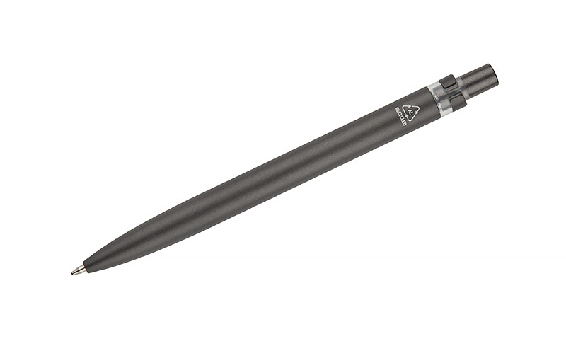 Długopis RAL wykonany jest z recyklingowanego aluminium w eleganckim, grafitowym kolorze z chromowanym wykończeniem. Aluminiowy klips zakończony kolorowym akcentem nadaje mu nowoczesny i rozpoznawalny wygląd. Mechanizm wysuwu jest automatyczny, co zapewnia wygodę i szybkie użycie w każdej sytuacji. Smukła forma oraz przyjemny w dotyku korpus gwarantują komfort pisania. Wkład typu G2 o grubości linii 1,0 mm zapewnia płynny i precyzyjny zapis. To praktyczny gadżet reklamowy, który świetnie sprawdzi się w biurze i podczas spotkań biznesowych.