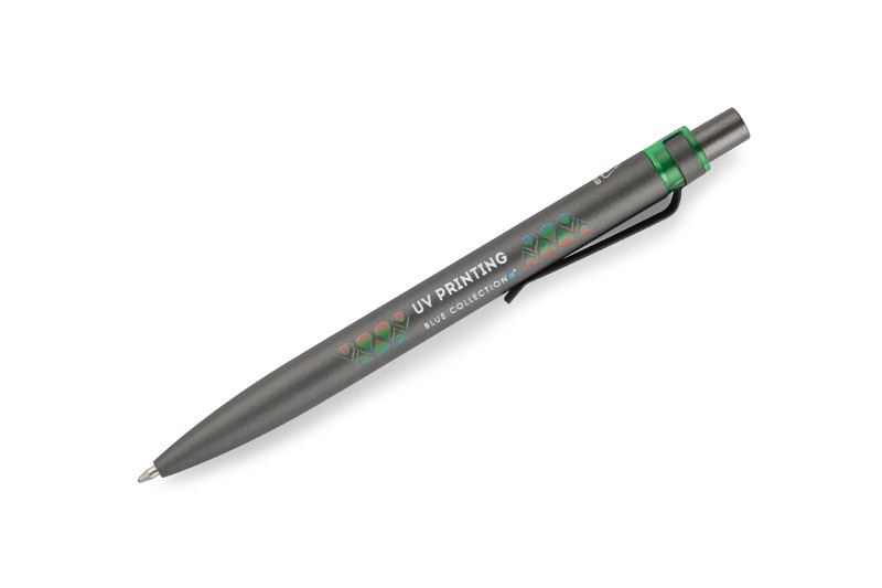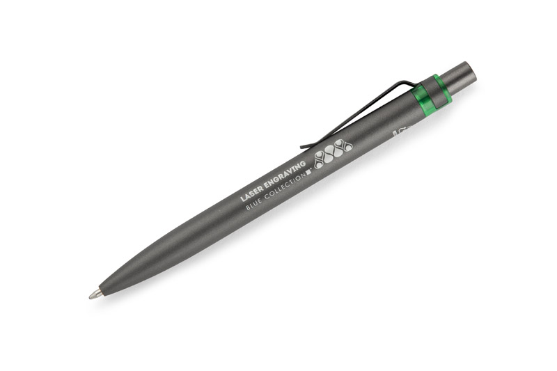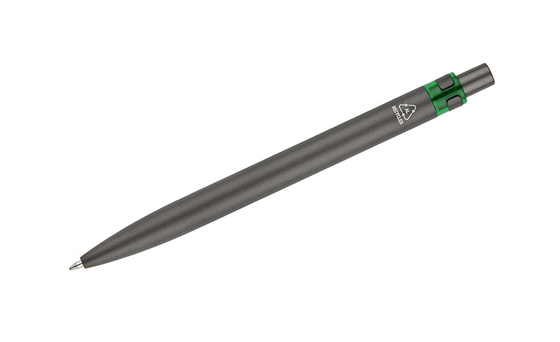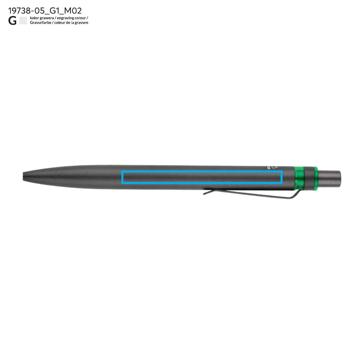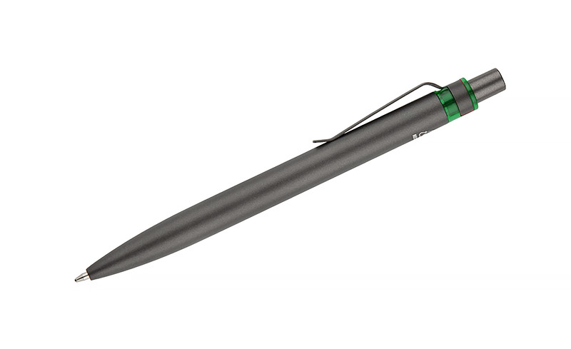 Długopis RAL wykonany jest z recyklingowanego aluminium w eleganckim, grafitowym kolorze z chromowanym wykończeniem. Aluminiowy klips zakończony kolorowym akcentem nadaje mu nowoczesny i rozpoznawalny wygląd. Mechanizm wysuwu jest automatyczny, co zapewnia wygodę i szybkie użycie w każdej sytuacji. Smukła forma oraz przyjemny w dotyku korpus gwarantują komfort pisania. Wkład typu G2 o grubości linii 1,0 mm zapewnia płynny i precyzyjny zapis. To praktyczny gadżet reklamowy, który świetnie sprawdzi się w biurze i podczas spotkań biznesowych.