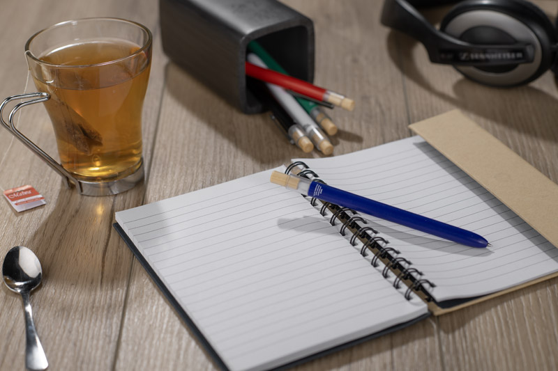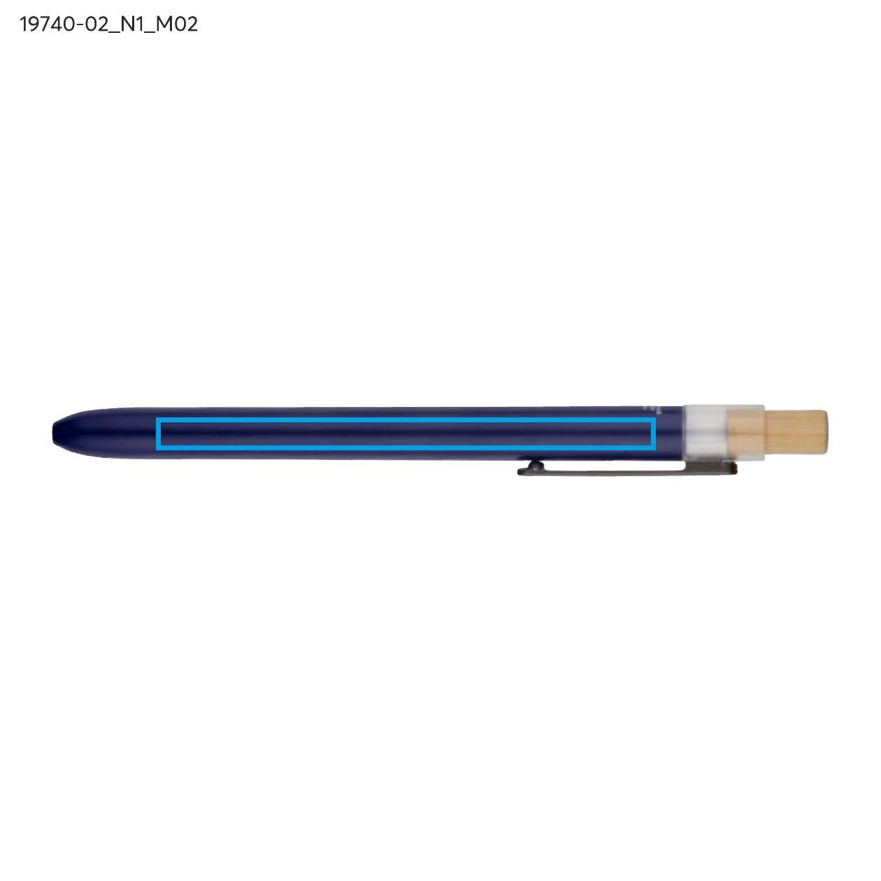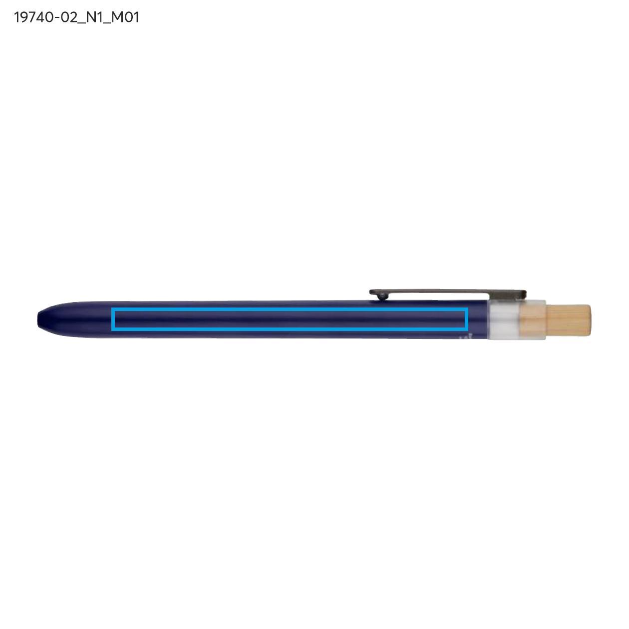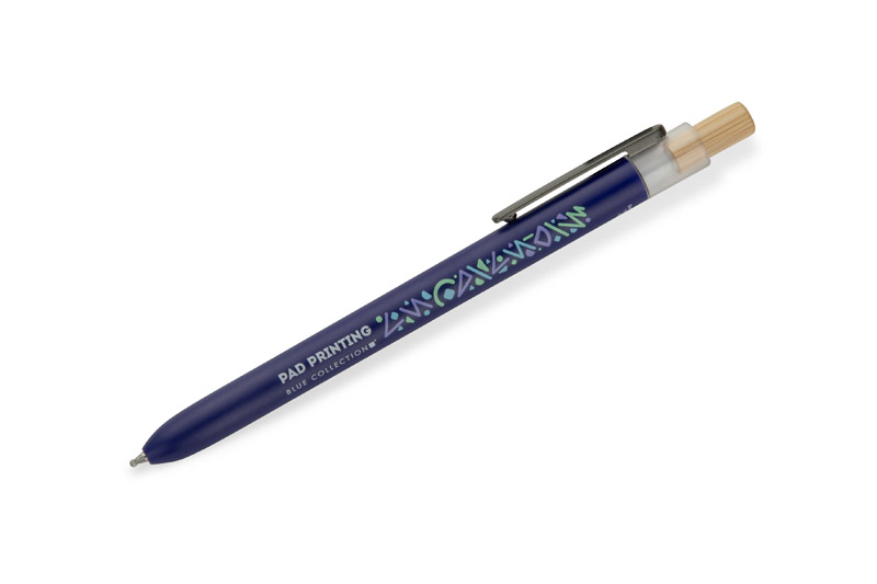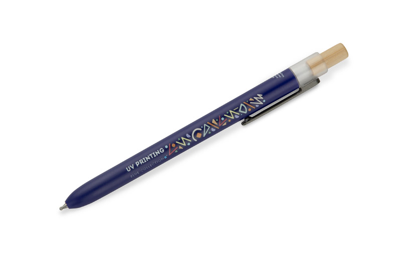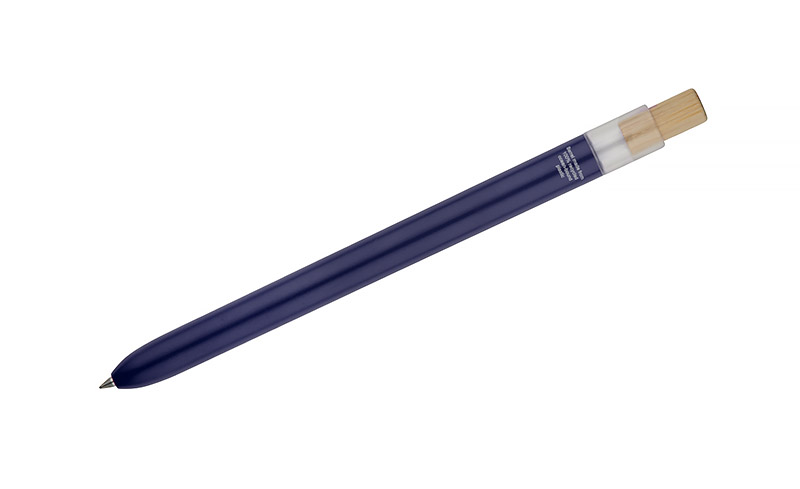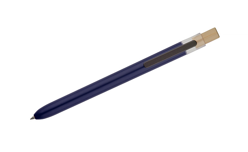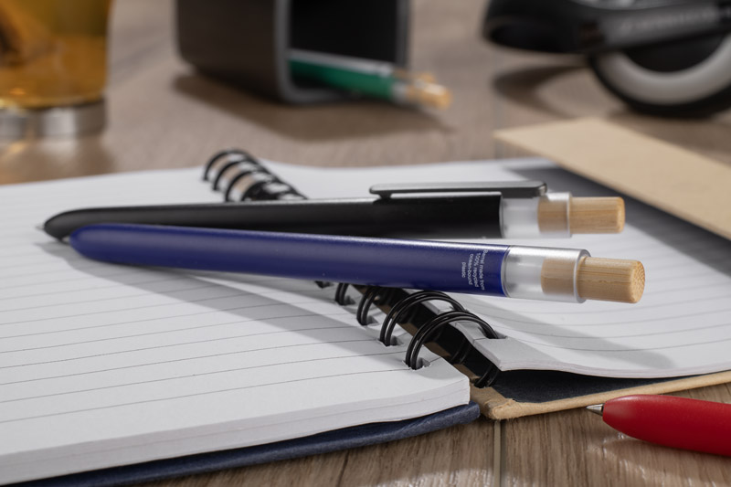 Długopis OCEANO wykonany jest z materiału pochodzącego z odpadów ocean bound – tworzyw zbieranych z terenów przybrzeżnych, zanim trafią do mórz i oceanów. Posiada lakierowany korpus, bambusowy przycisk oraz metalowy klips, co nadaje mu nowoczesny wygląd i przyjemne w użytkowaniu wykończenie. Automatyczny mechanizm ułatwia codzienną obsługę, a wkład typu G2 z żelowym tuszem o grubości pisania 0,5 mm zapewnia płynny i precyzyjny zapis.