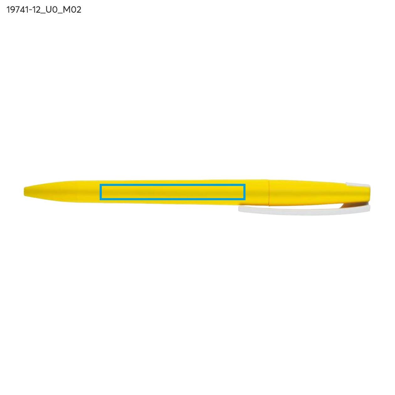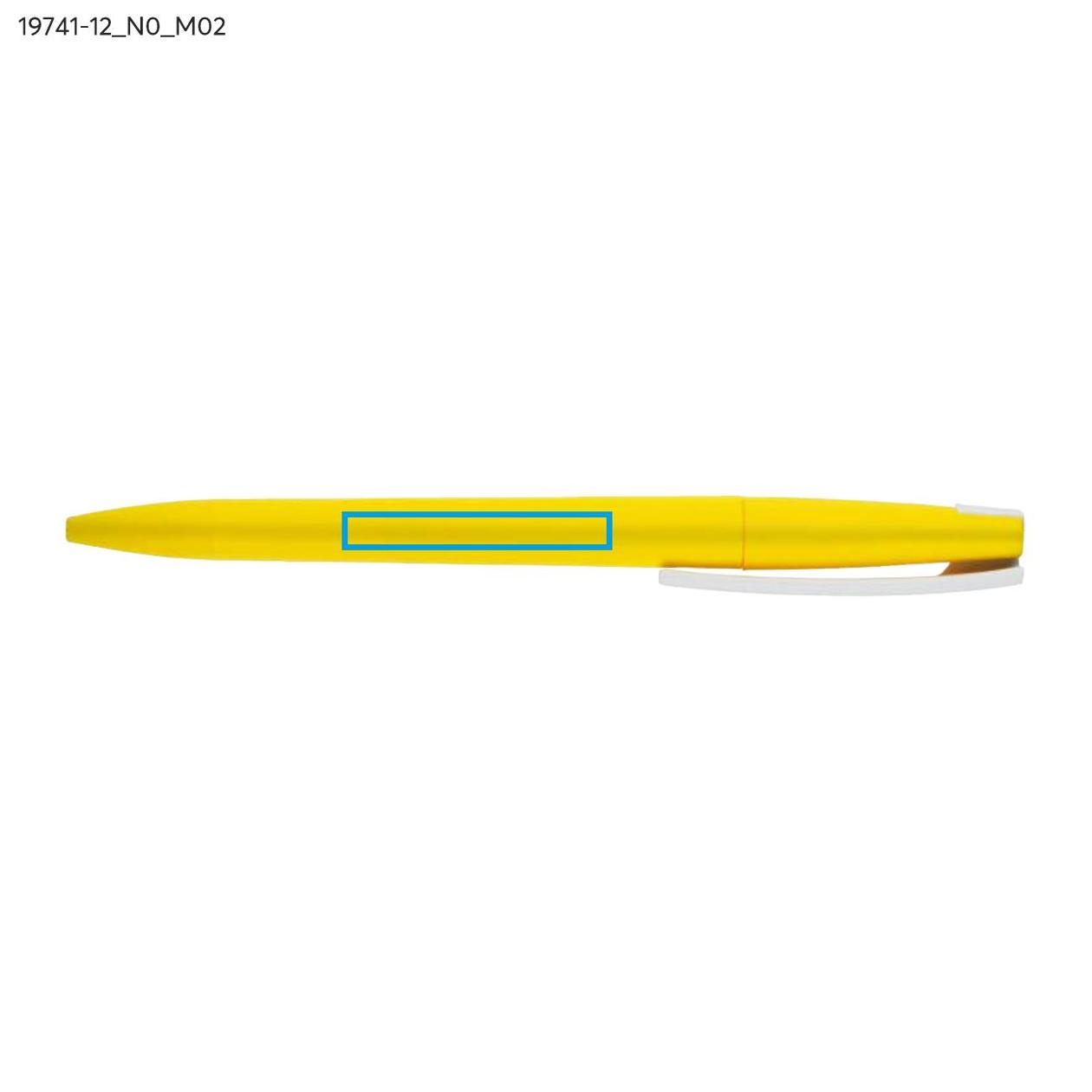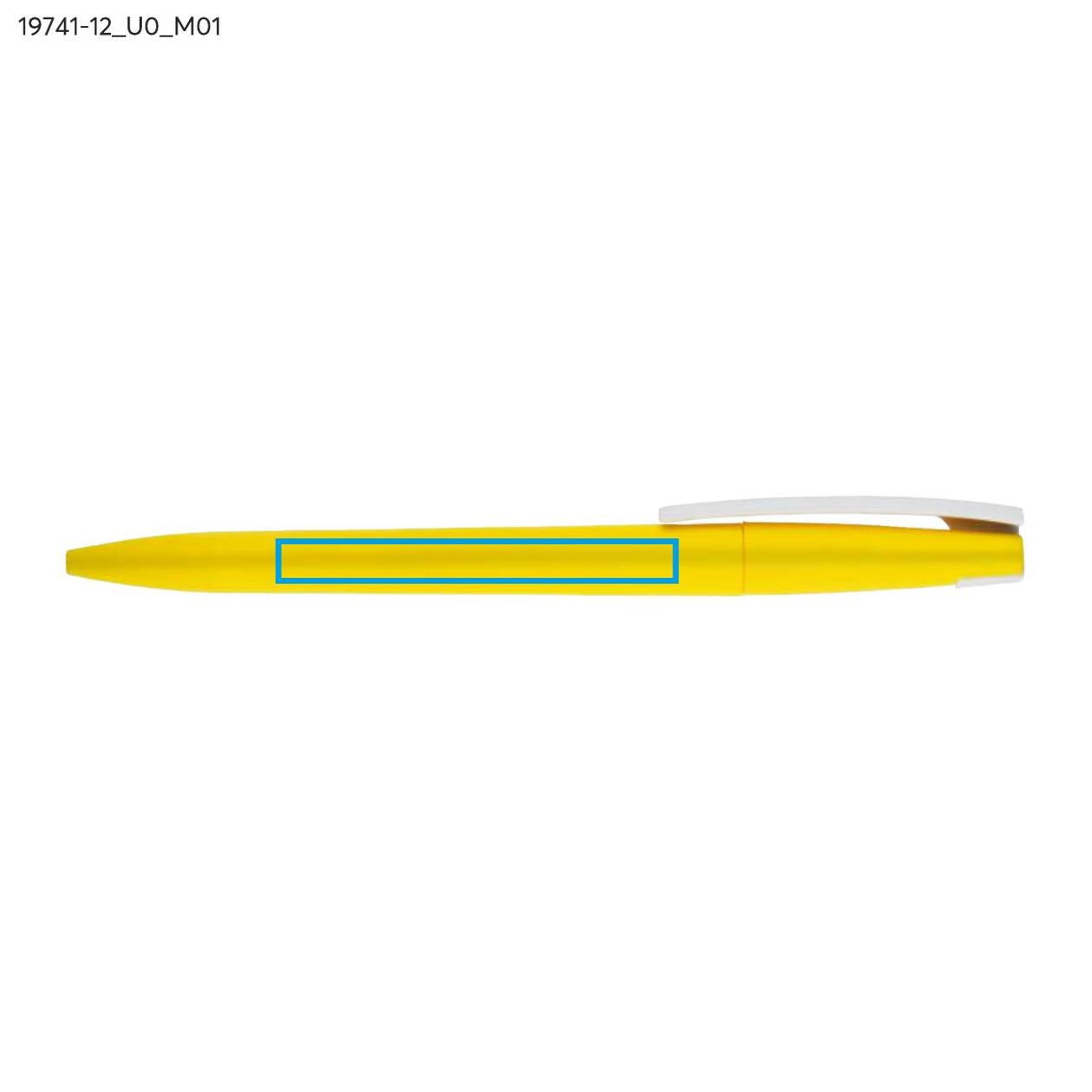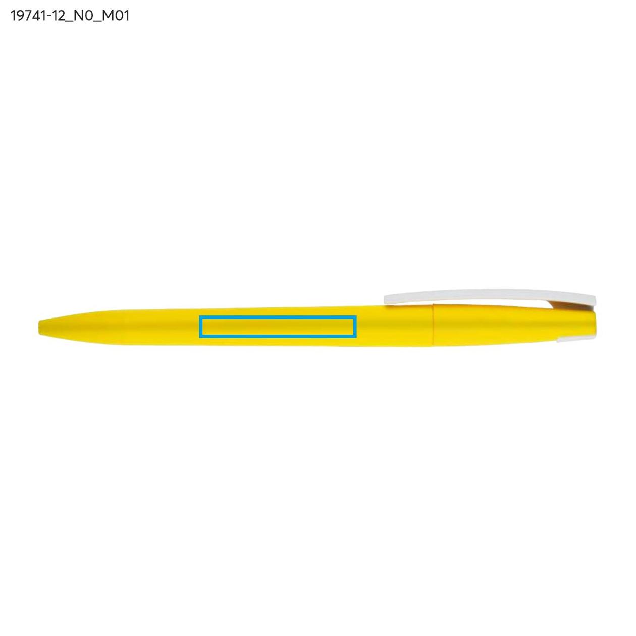Długopis ZENO wykonany jest z tworzywa o matowym, przyjemnym w dotyku wykończeniu typu soft touch. Jego nowoczesna forma i kontrastujący biały klip nadają mu rozpoznawalny wygląd. Mechanizm przekręcany typu twist umożliwia wygodne wysuwanie wkładu X20 o grubości pisania 1,0 mm. Lekki i poręczny, sprawdzi się w codziennym użytkowaniu, a także jako praktyczny nośnik reklamy z miejscem na logo.