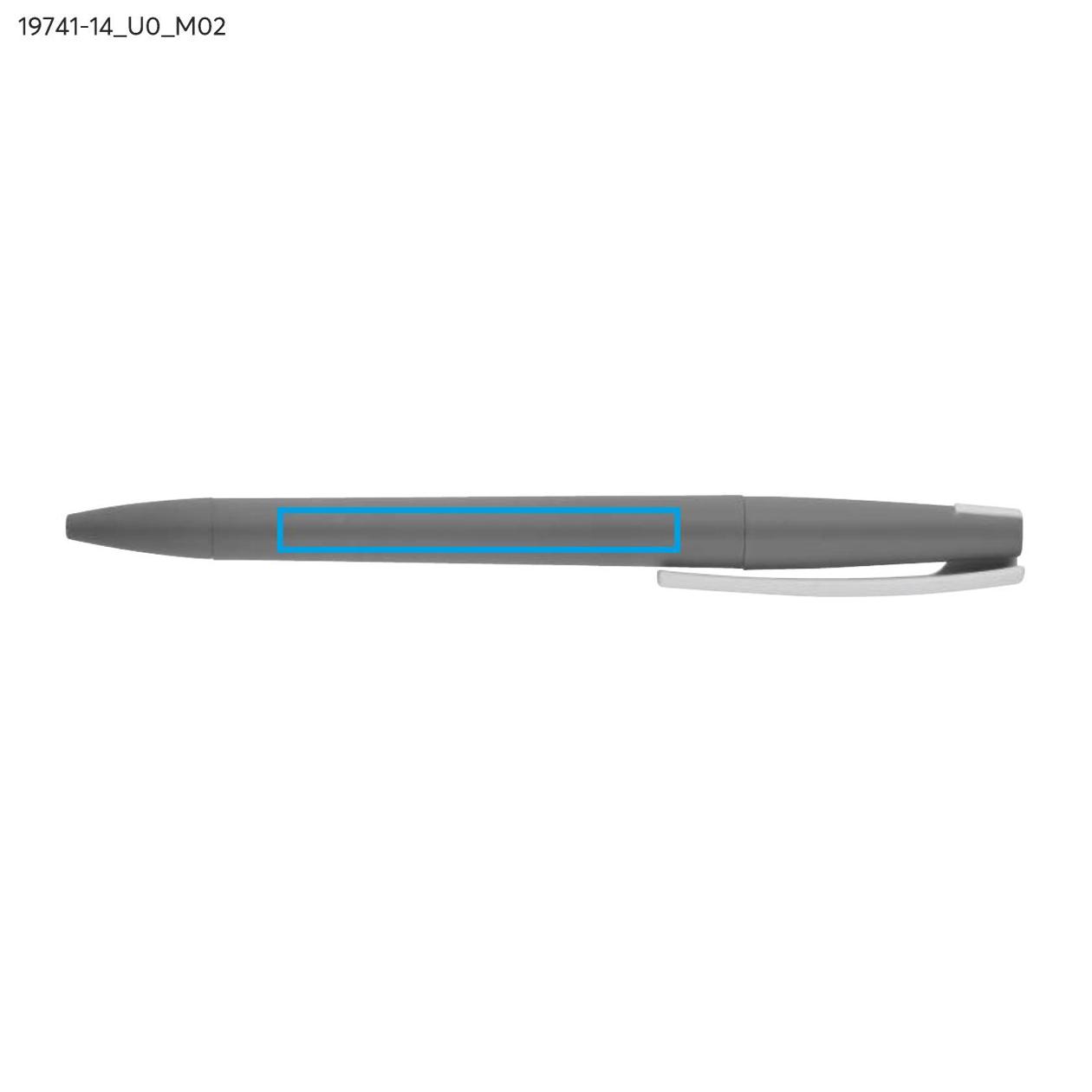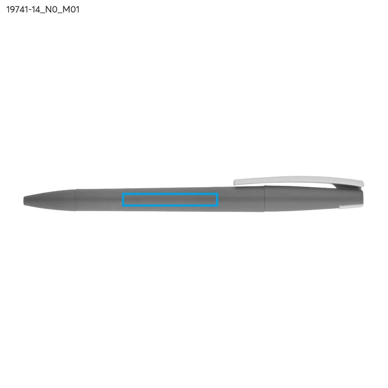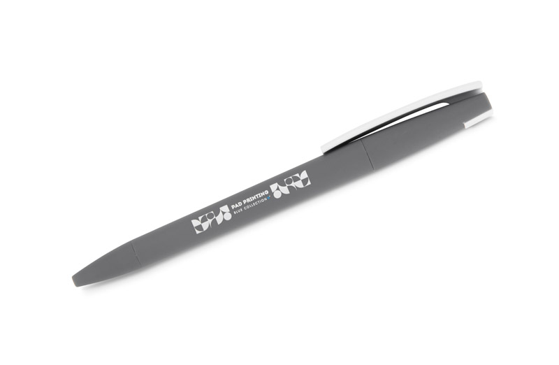 Długopis ZENO wykonany jest z tworzywa o matowym, przyjemnym w dotyku wykończeniu typu soft touch. Jego nowoczesna forma i kontrastujący biały klip nadają mu rozpoznawalny wygląd. Mechanizm przekręcany typu twist umożliwia wygodne wysuwanie wkładu X20 o grubości pisania 1,0 mm. Lekki i poręczny, sprawdzi się w codziennym użytkowaniu, a także jako praktyczny nośnik reklamy z miejscem na logo.