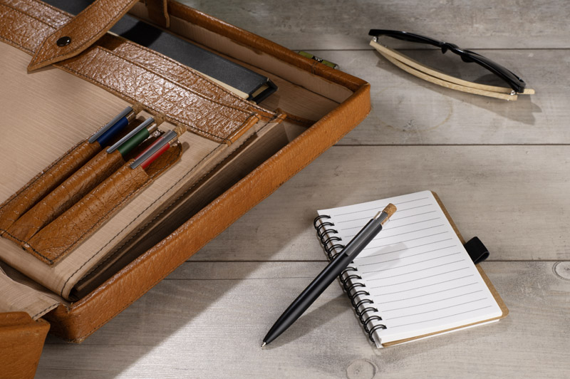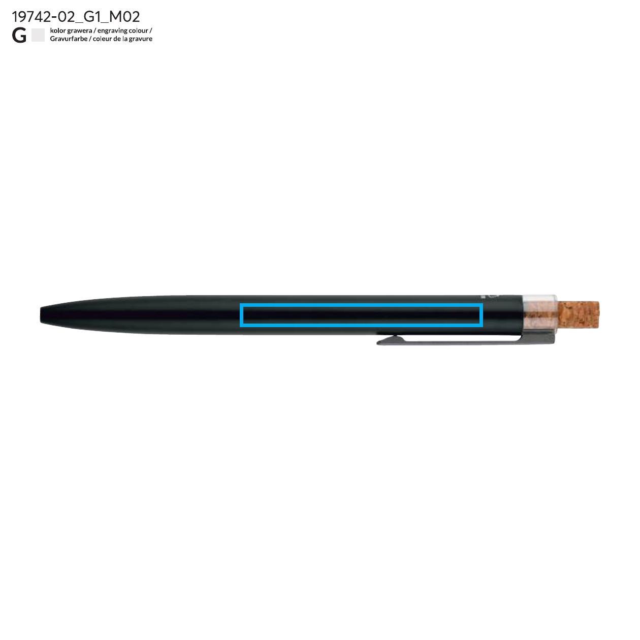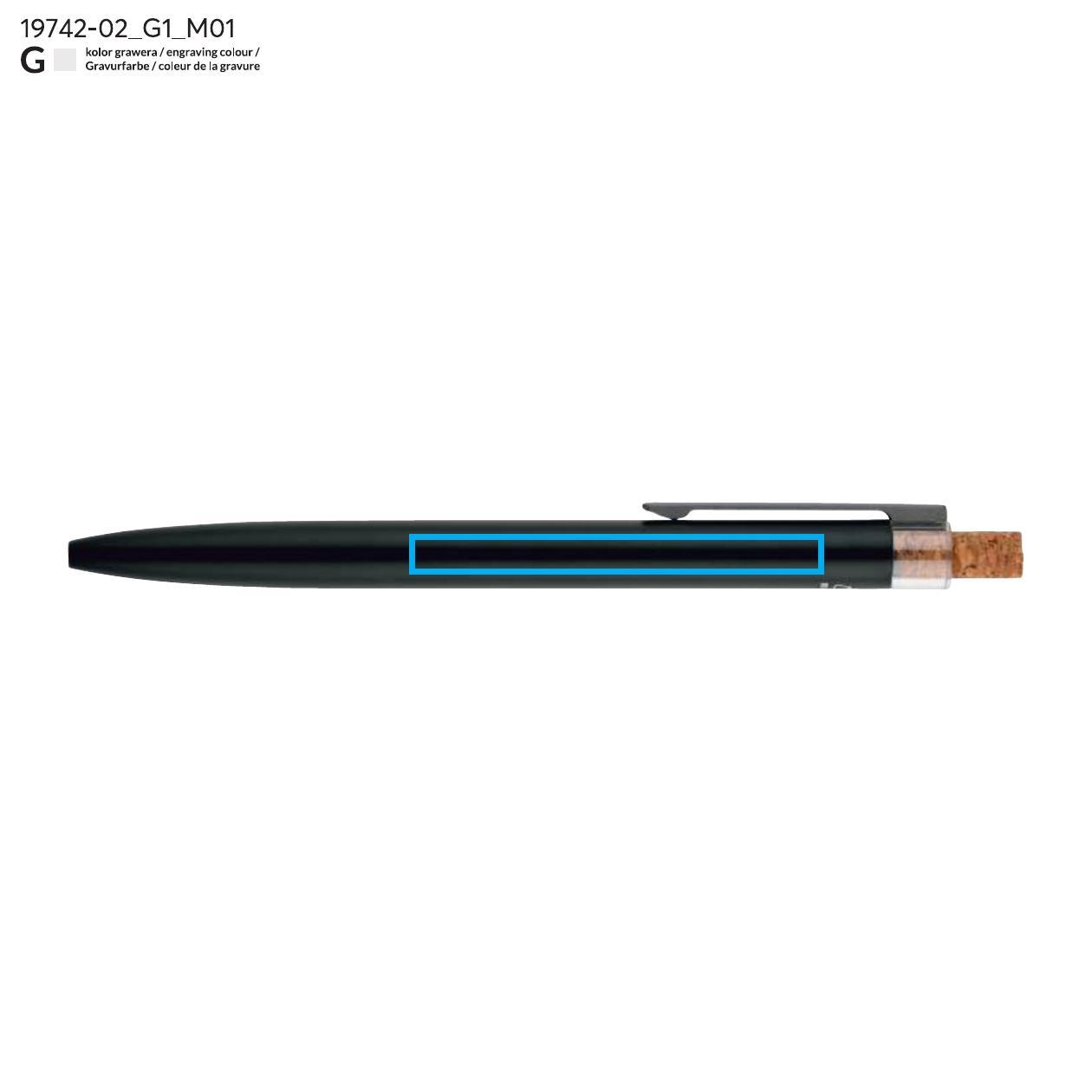 Długopis KORIN wykonany jest z recyklingowanego aluminium i pokryty lakierowanym wykończeniem, które nadaje mu gładką, satynową powierzchnię. Wyposażony w automatyczny mechanizm, wkład typu G2 o grubości pisania 1,0 mm oraz metalowy klips w kolorze grafitowym. Korkowy przycisk stanowi ciekawy akcent, podkreślający nowoczesny charakter długopisu. KORIN jest lekki, solidny i wygodny w codziennym użytkowaniu.