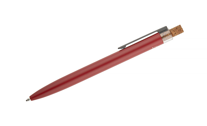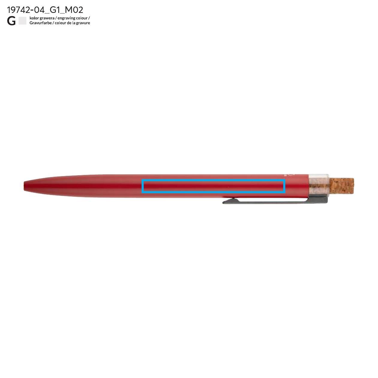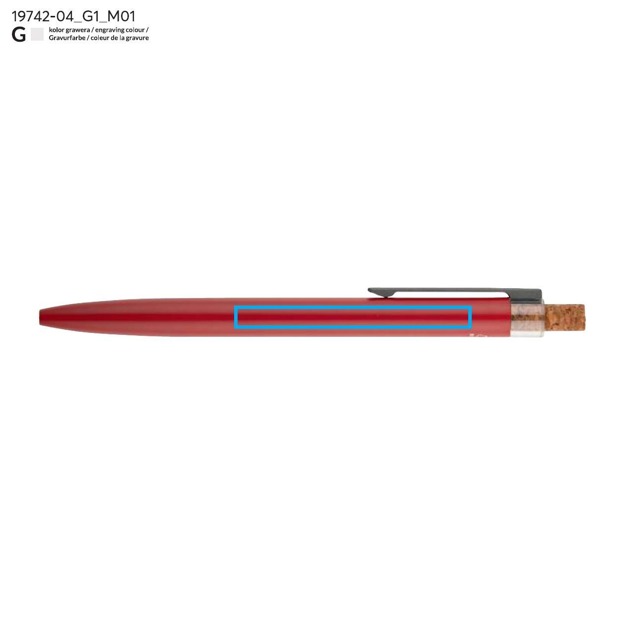 Długopis KORIN wykonany jest z recyklingowanego aluminium i pokryty lakierowanym wykończeniem, które nadaje mu gładką, satynową powierzchnię. Wyposażony w automatyczny mechanizm, wkład typu G2 o grubości pisania 1,0 mm oraz metalowy klips w kolorze grafitowym. Korkowy przycisk stanowi ciekawy akcent, podkreślający nowoczesny charakter długopisu. KORIN jest lekki, solidny i wygodny w codziennym użytkowaniu.