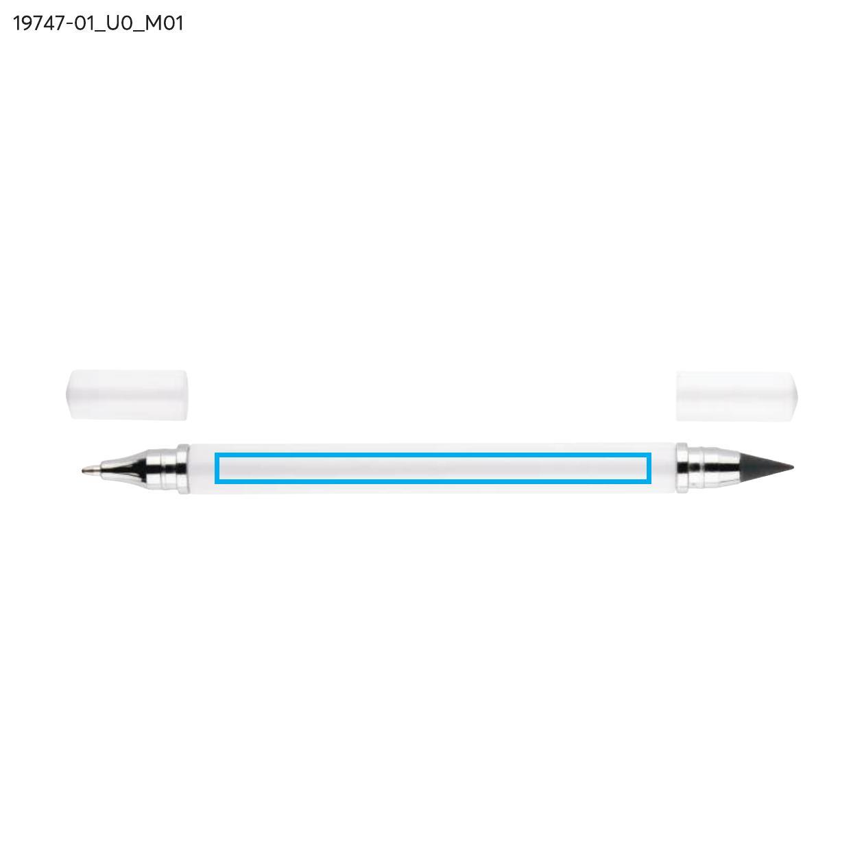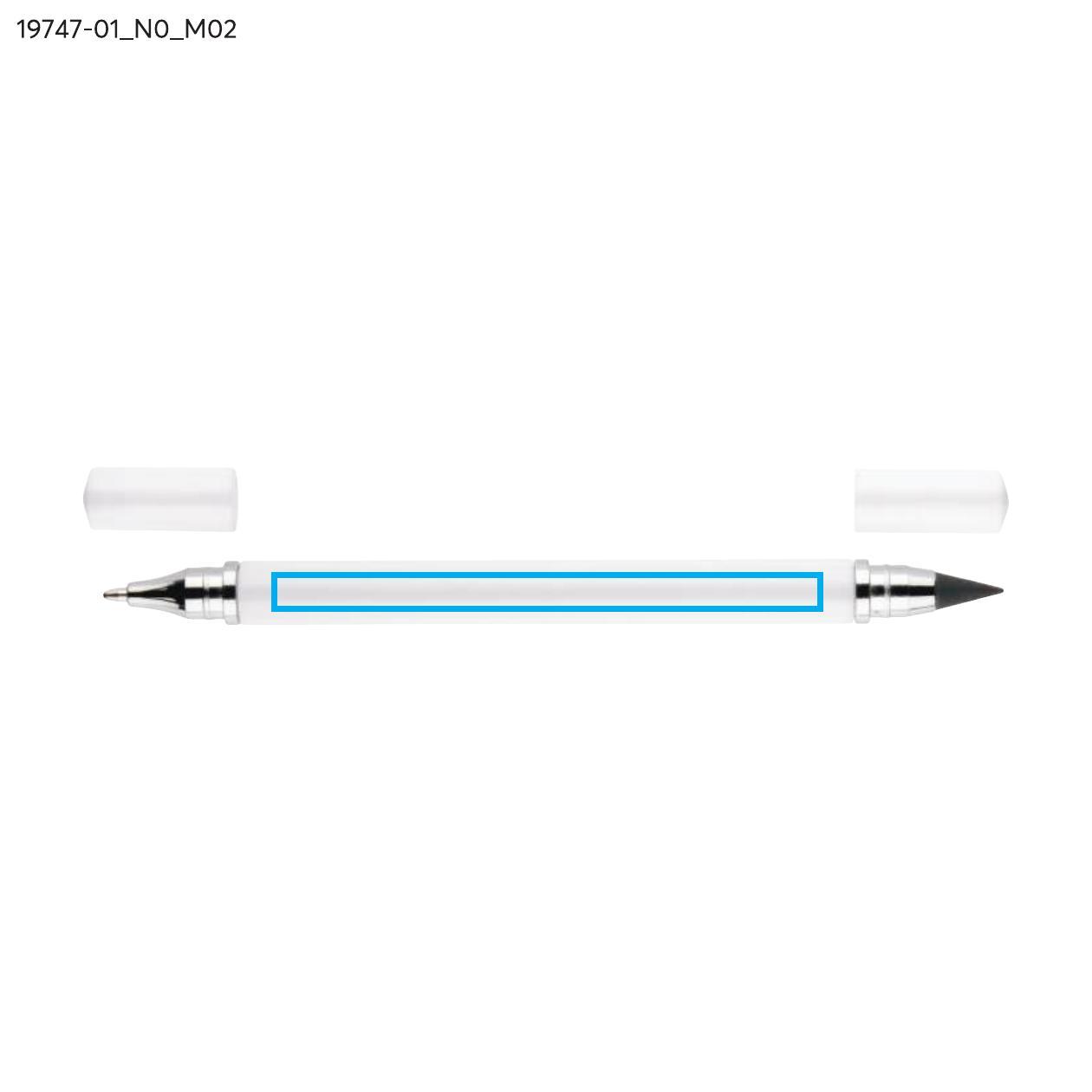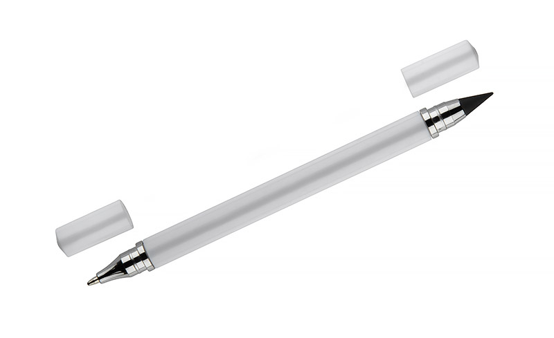 Długopis TWINO 2 w 1 łączy w jednym korpusie klasyczny długopis i wieczny ołówek, tworząc praktyczne narzędzie do codziennego użytku. Z jednej strony znajduje się długopis z zatyczką i wkładem o grubości pisania 1,0 mm, z drugiej – ołówek wieczny, który nie wymaga ostrzenia. Korpus wykonany jest z tworzywa o satynowym wykończeniu i ozdobiony srebrnymi pierścieniami podkreślającymi jego dopracowany wygląd. TWINO jest lekki, poręczny i wygodny, idealny do biura, szkoły lub jako funkcjonalny gadżet reklamowy.