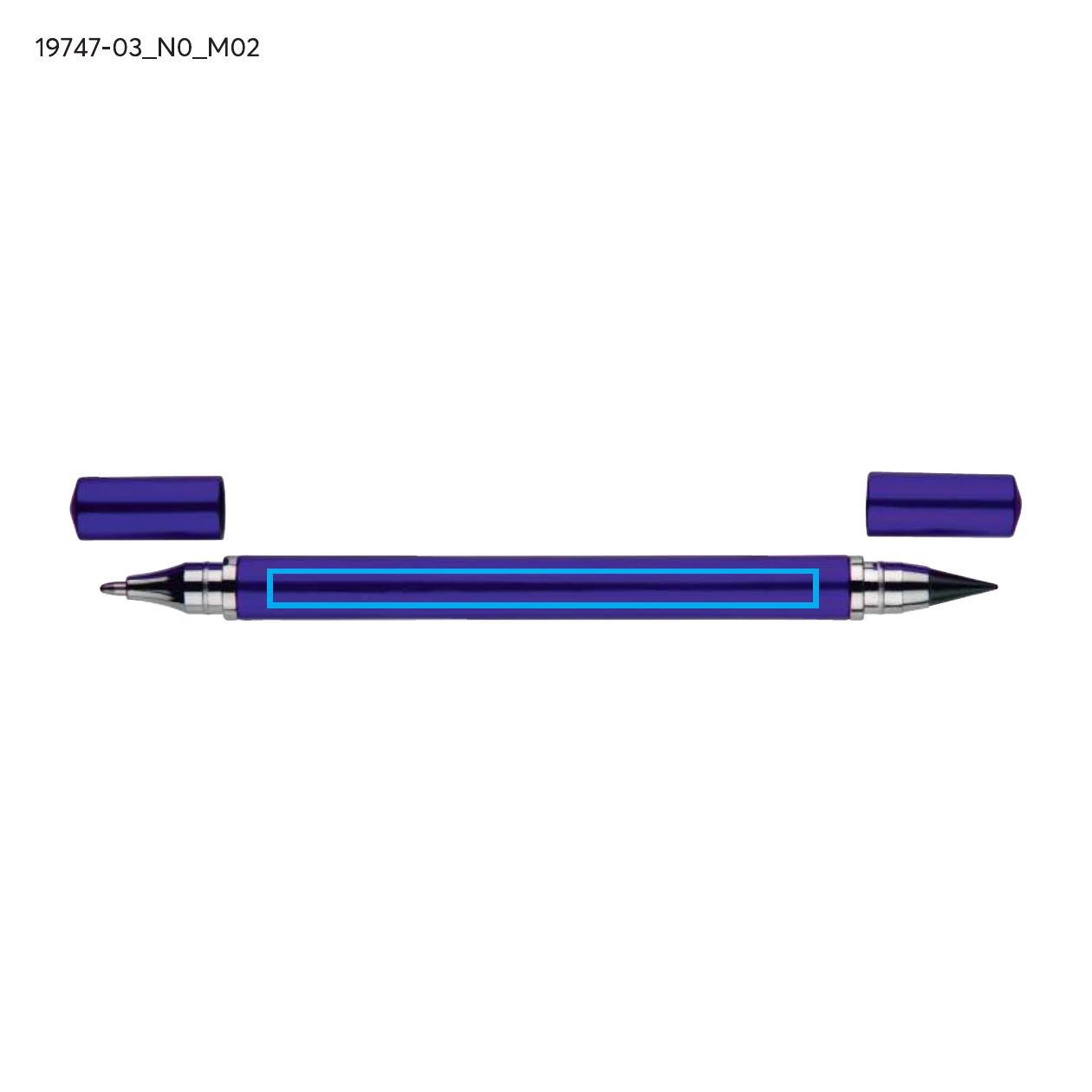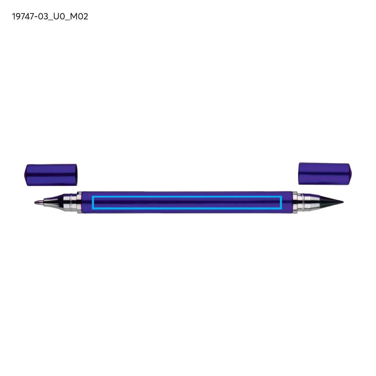 Długopis TWINO 2 w 1 łączy w jednym korpusie klasyczny długopis i wieczny ołówek, tworząc praktyczne narzędzie do codziennego użytku. Z jednej strony znajduje się długopis z zatyczką i wkładem o grubości pisania 1,0 mm, z drugiej – ołówek wieczny, który nie wymaga ostrzenia. Korpus wykonany jest z tworzywa o satynowym wykończeniu i ozdobiony srebrnymi pierścieniami podkreślającymi jego dopracowany wygląd. TWINO jest lekki, poręczny i wygodny, idealny do biura, szkoły lub jako funkcjonalny gadżet reklamowy.
