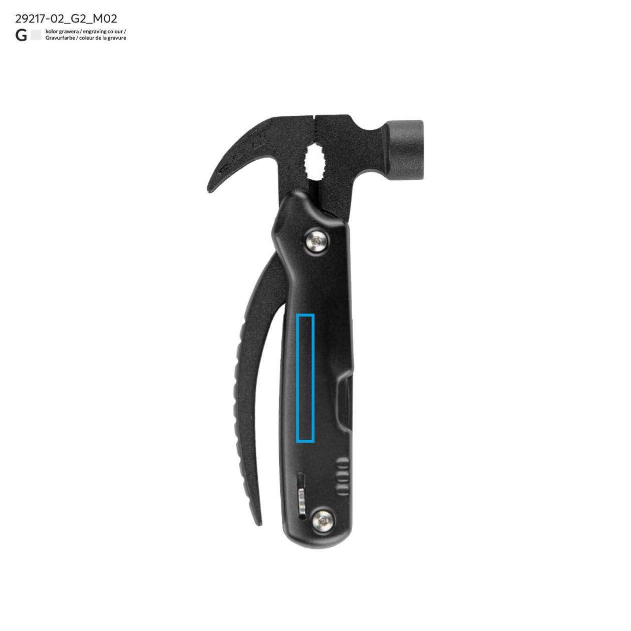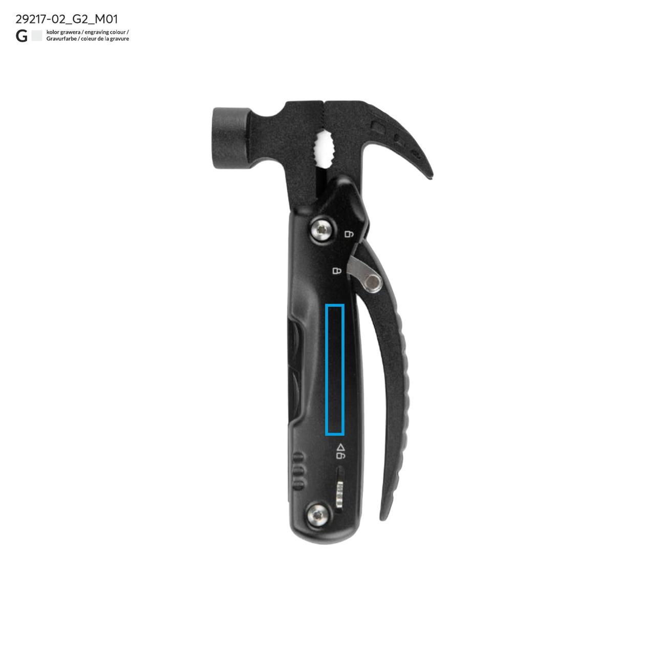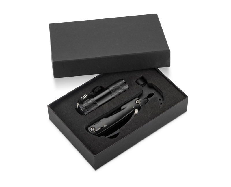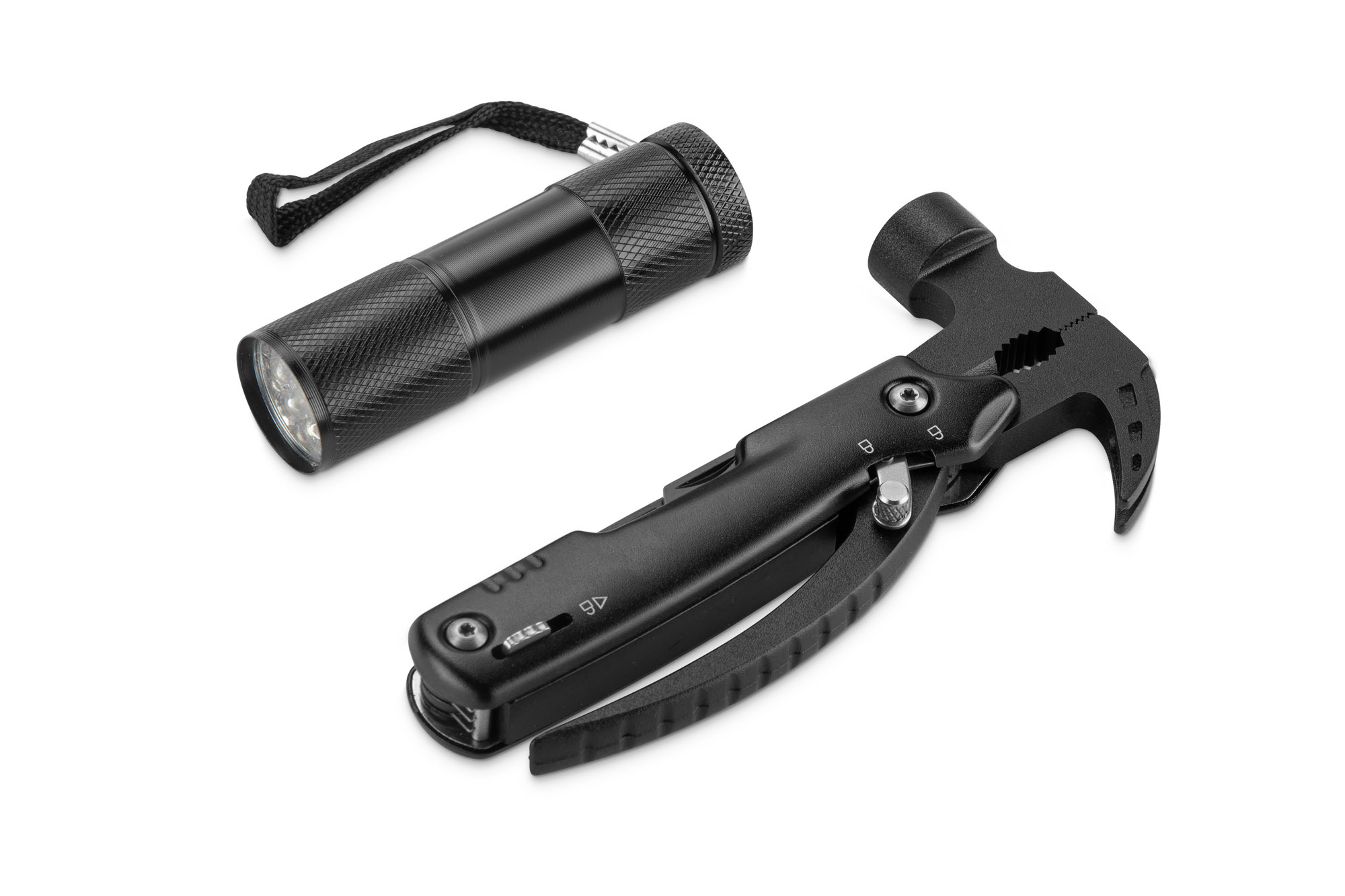 Zestaw narzędzi ZAXO to praktyczne połączenie latarki i wielofunkcyjnego multitoola, które sprawdzi się w różnych sytuacjach – w domu, warsztacie czy podczas podróży. Multitool wyposażony jest w niezbędne akcesoria: młotek, piłę, nóż, śrubokręt krzyżakowy, otwieracz do piwa, piłę dwurzędową oraz kombinerki. Dzięki kompaktowej formie wszystkie narzędzia są zawsze pod ręką. Latarka stanowi przydatne uzupełnienie zestawu, zwiększając jego uniwersalność. Całość zapakowana w kartonik, co czyni ZAXO także dobrym wyborem na praktyczny upominek reklamowy.