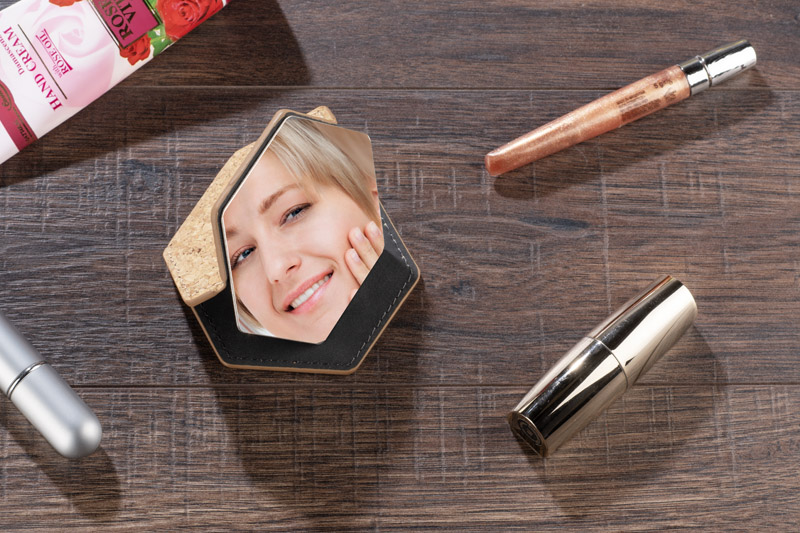 Odkryj kieszonkowe lusterko SARI. Korkowa obudowa w kształcie heksagonu nadaje lusterku nowoczesny, ekologiczny charakter, wyróżniając je spośród innych akcesoriów. SARI możesz postawić na płaskiej powierzchni i wygodnie poprawić makijaż czy wygląd, gdziekolwiek jesteś. Kompaktowy rozmiar sprawia, że lusterko SARI mieści się w każdej torebce.
