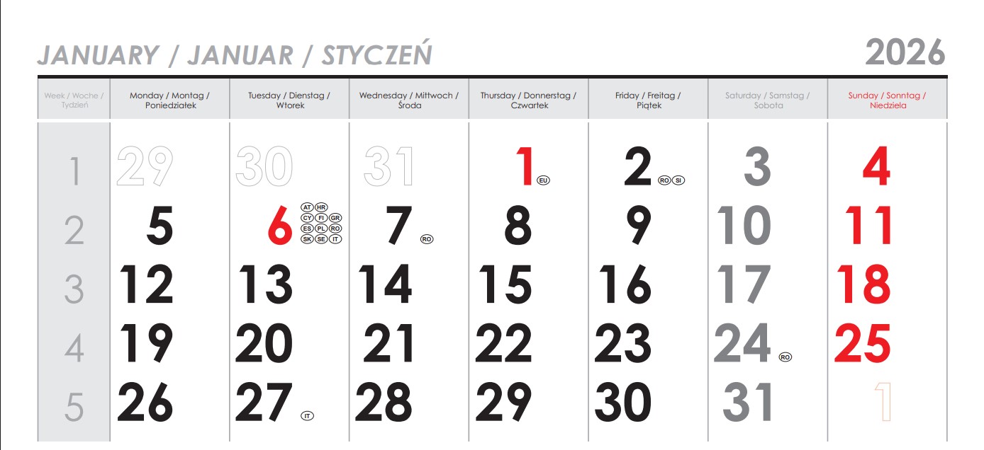 | Kalendaria: | 295 x 135 mm, międzynarodowe, język: polski, niemiecki i angielski święta europejskie |