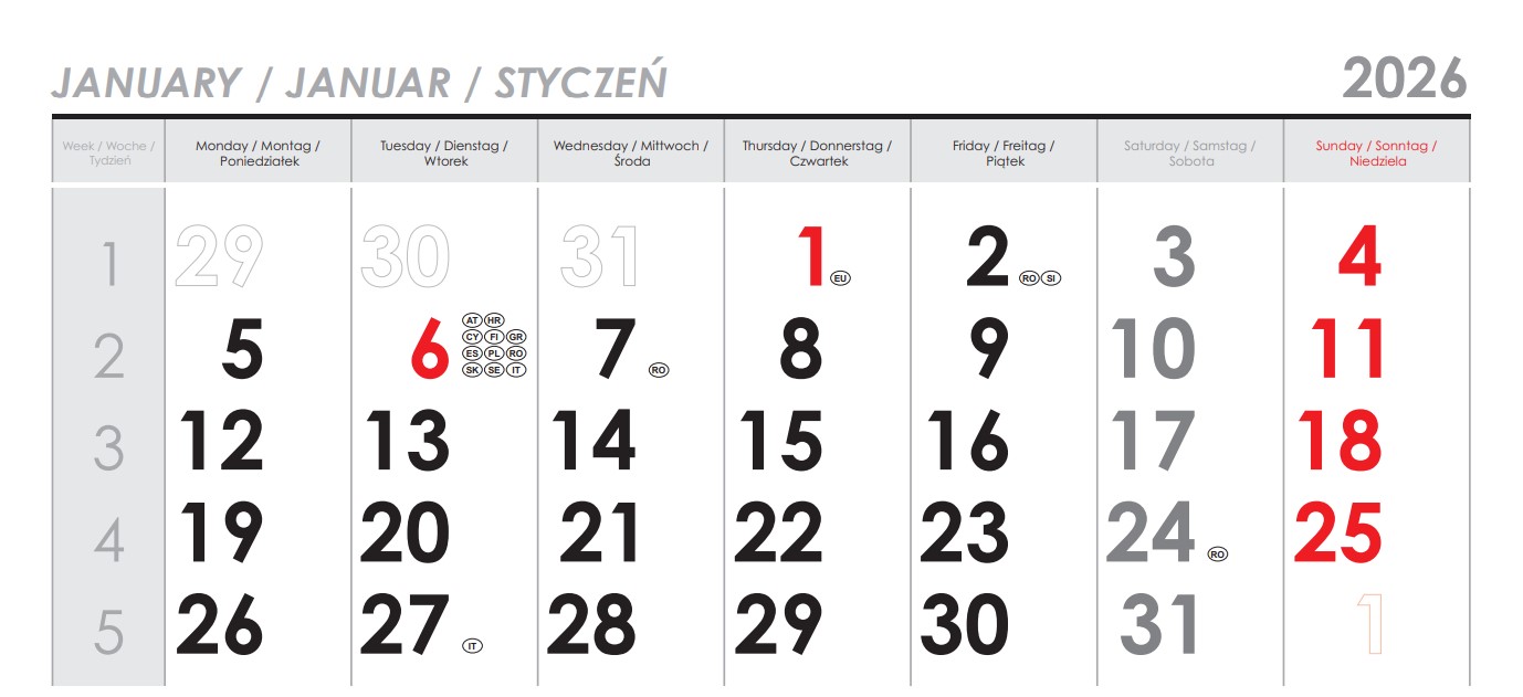 | Kalendaria: | 295x135 mm - międzynarodowe, język: polski, niemiecki i angielski święta europejskie |