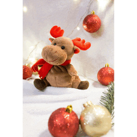 Renifer z możliwością nadruku na brzuchu, obciążenie w postaci drobnych kulek ułatwia utrzymanie równowagi w pozycji siedzącej, produkt wykonany z pluszu