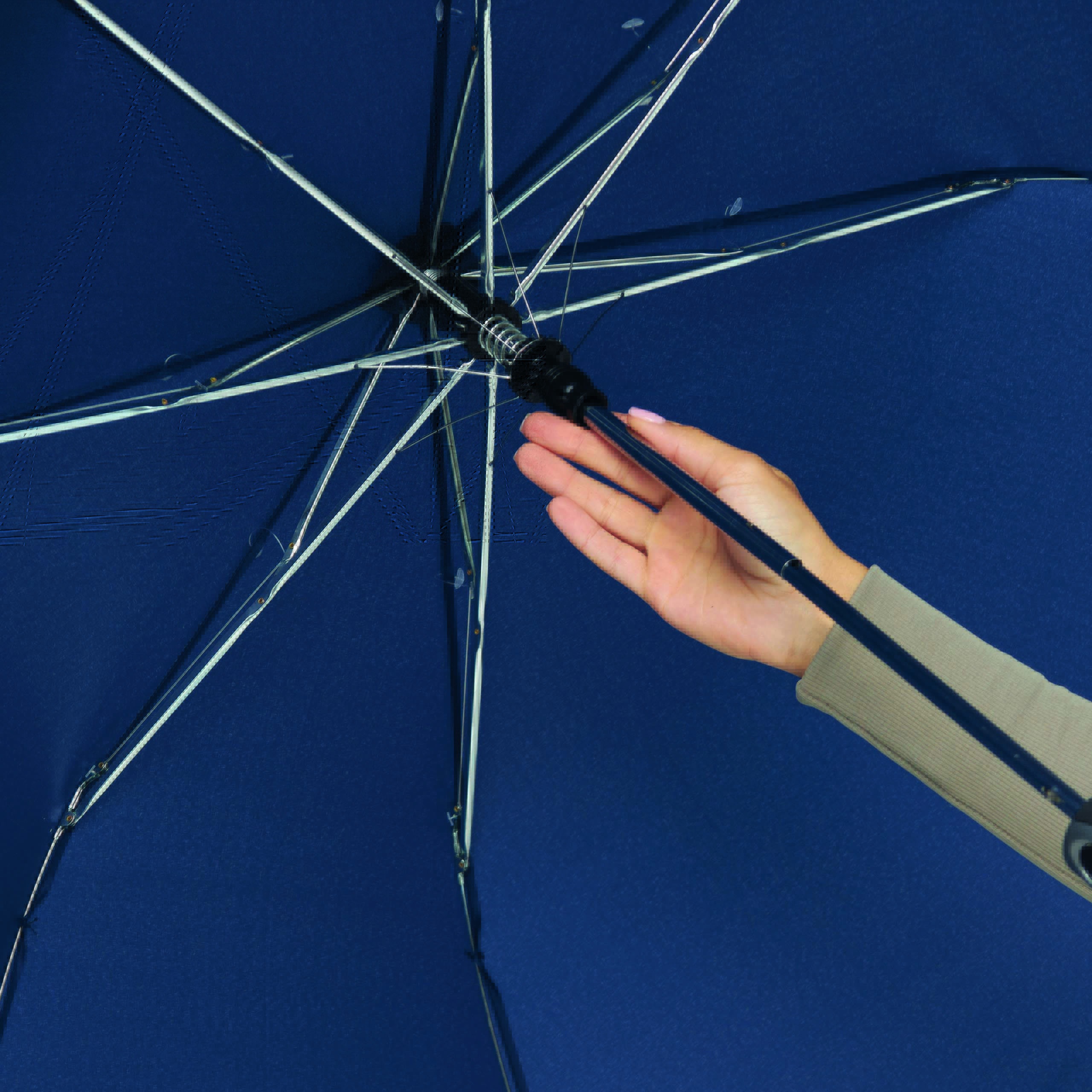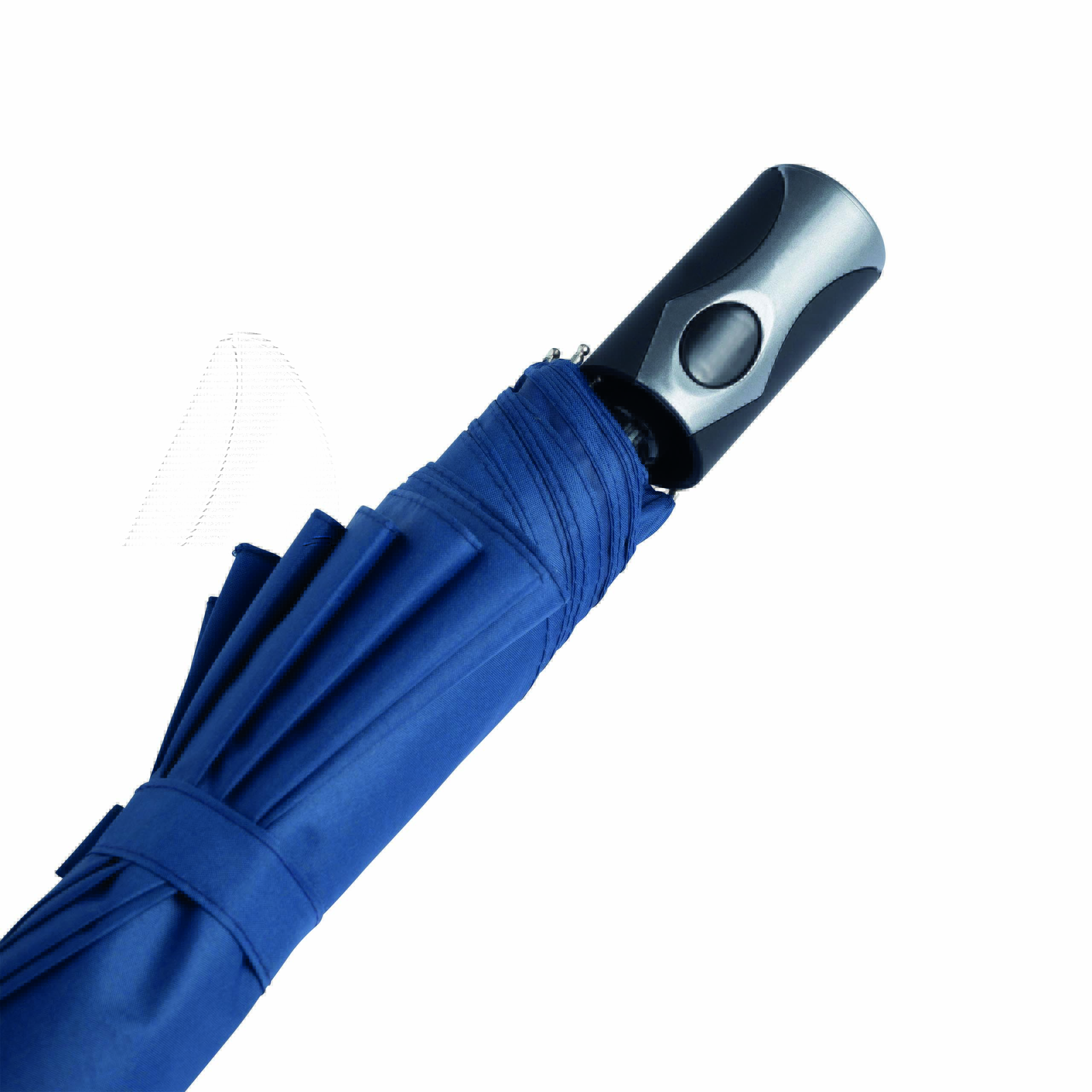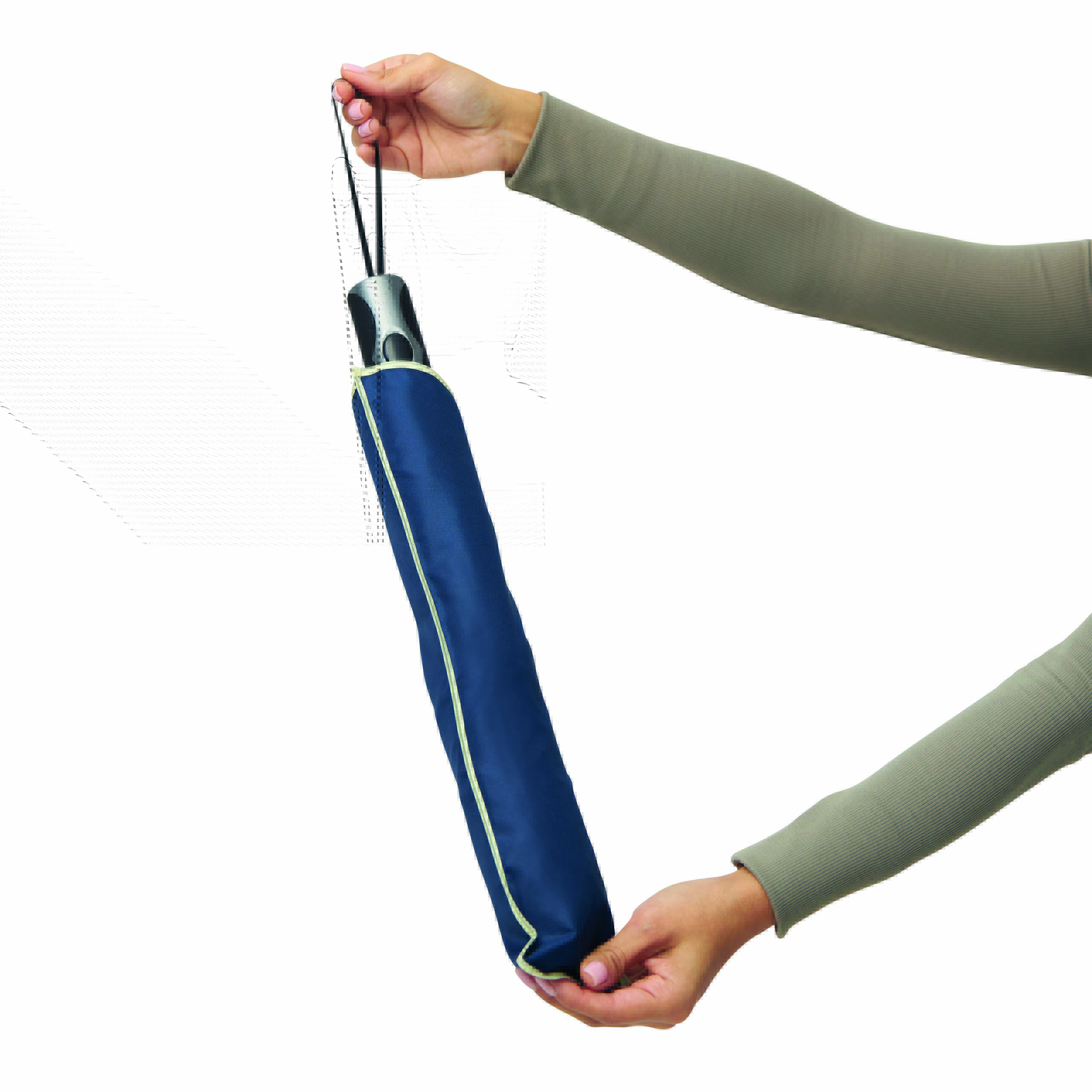 Automatyczny mini parasol męski MISTER. Poszycie poliester-pongee, pokrowiec z jasną lamówką, metalowe szyny, 2 x składana metalowa laska, plastikowy uchwyt.