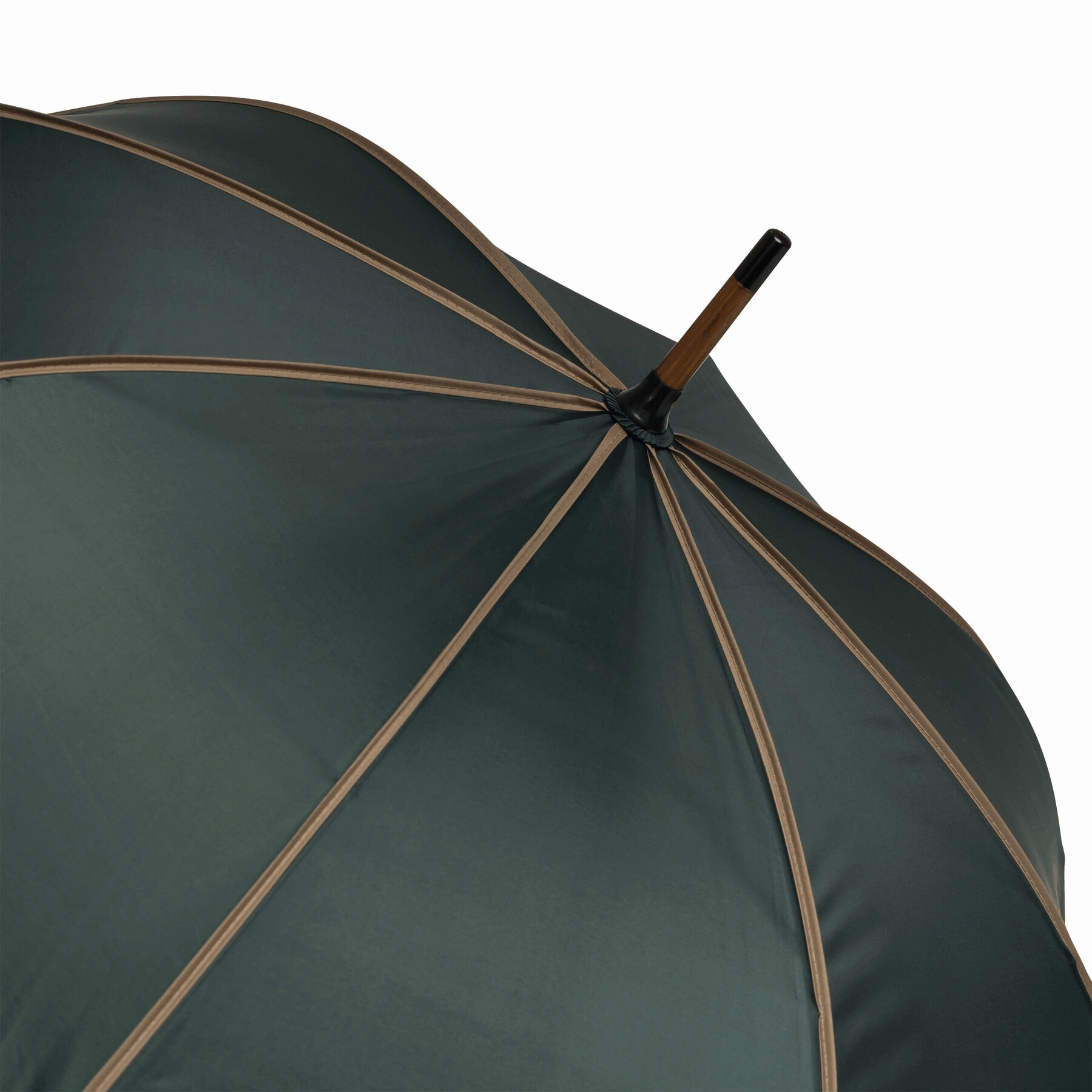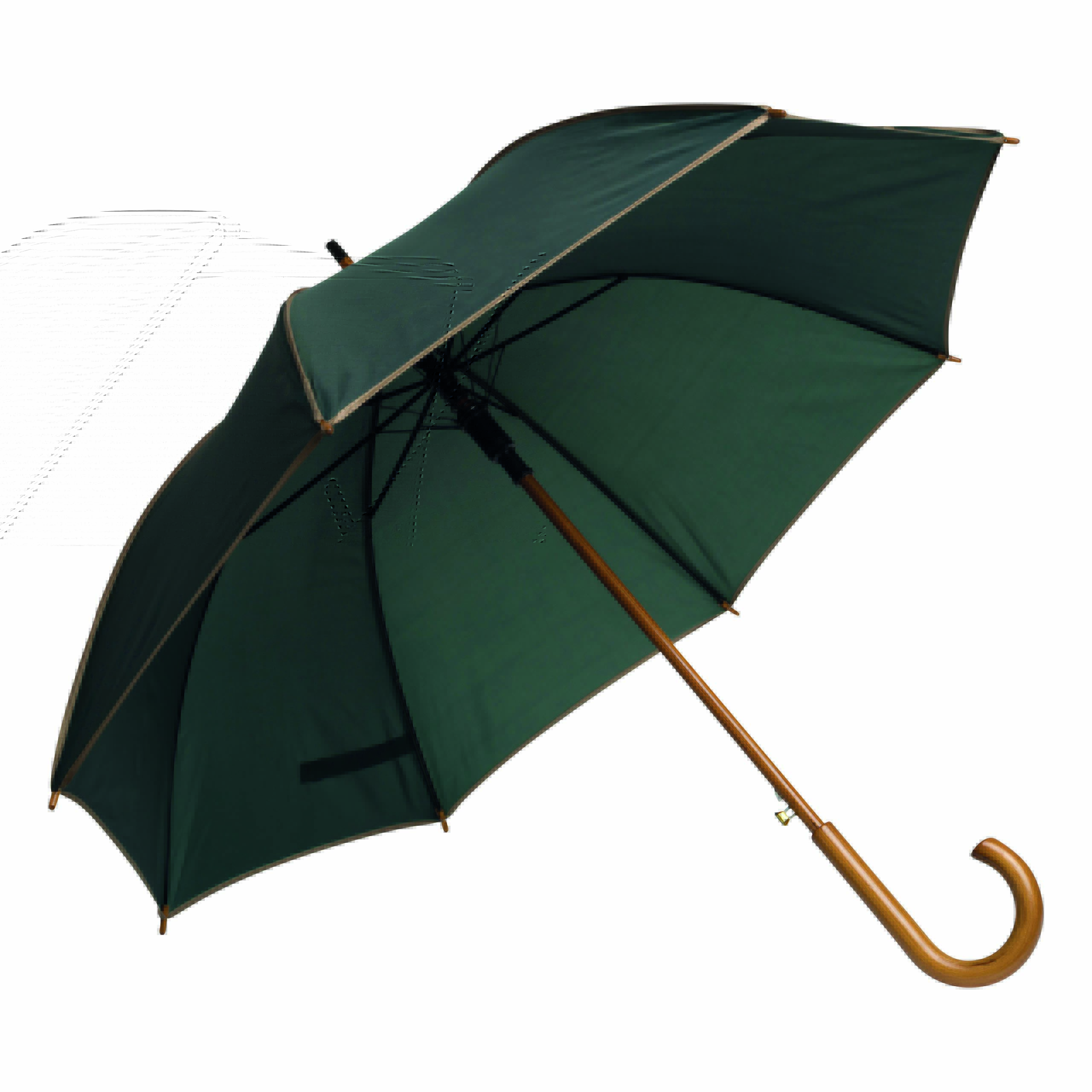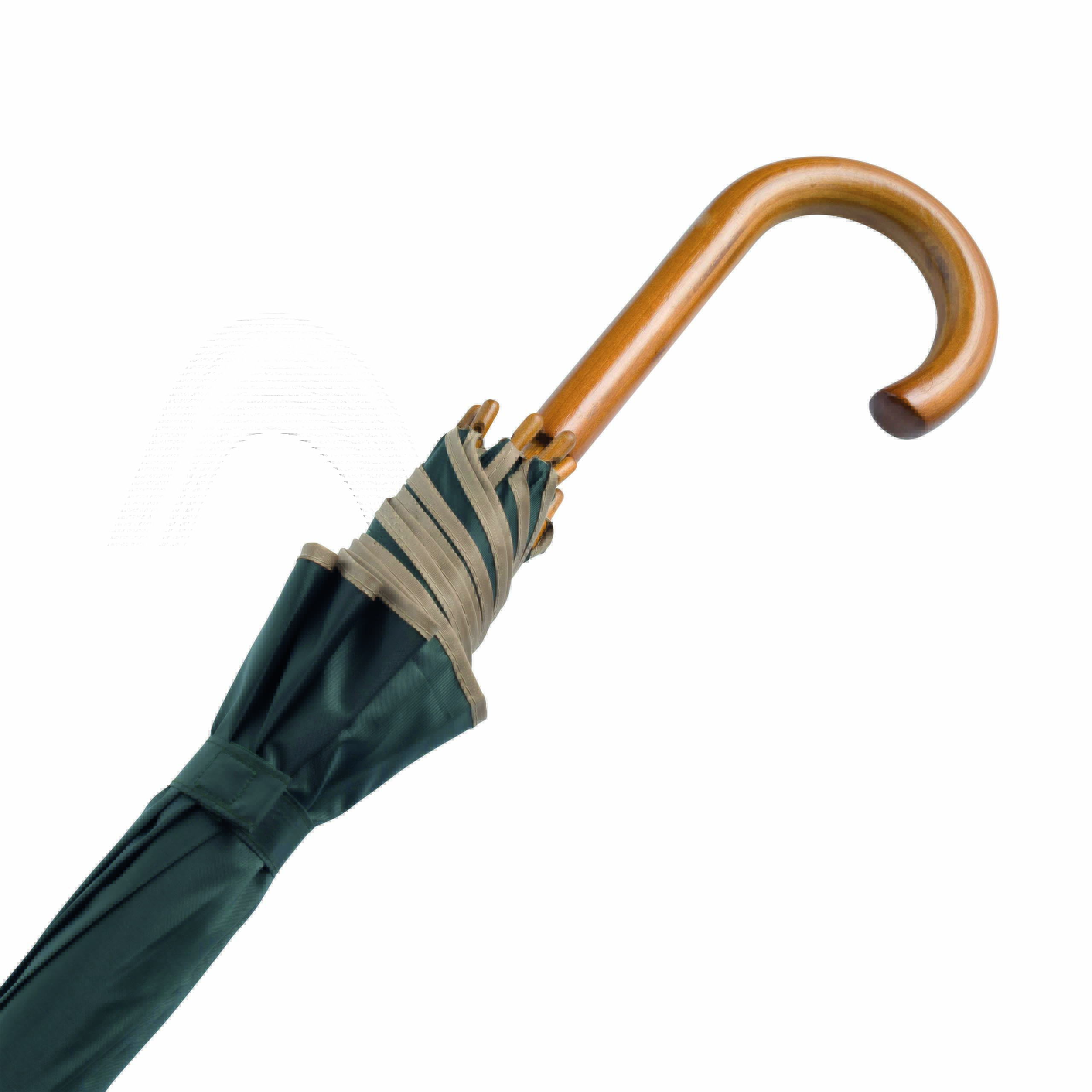 Automatyczny parasol WALTZ. Poszycie poliester 190 T, kontrastująca lamówka, czarne metalowe szyny, laska i uchwyt z drewna w kolorze orzecha włoskiego.