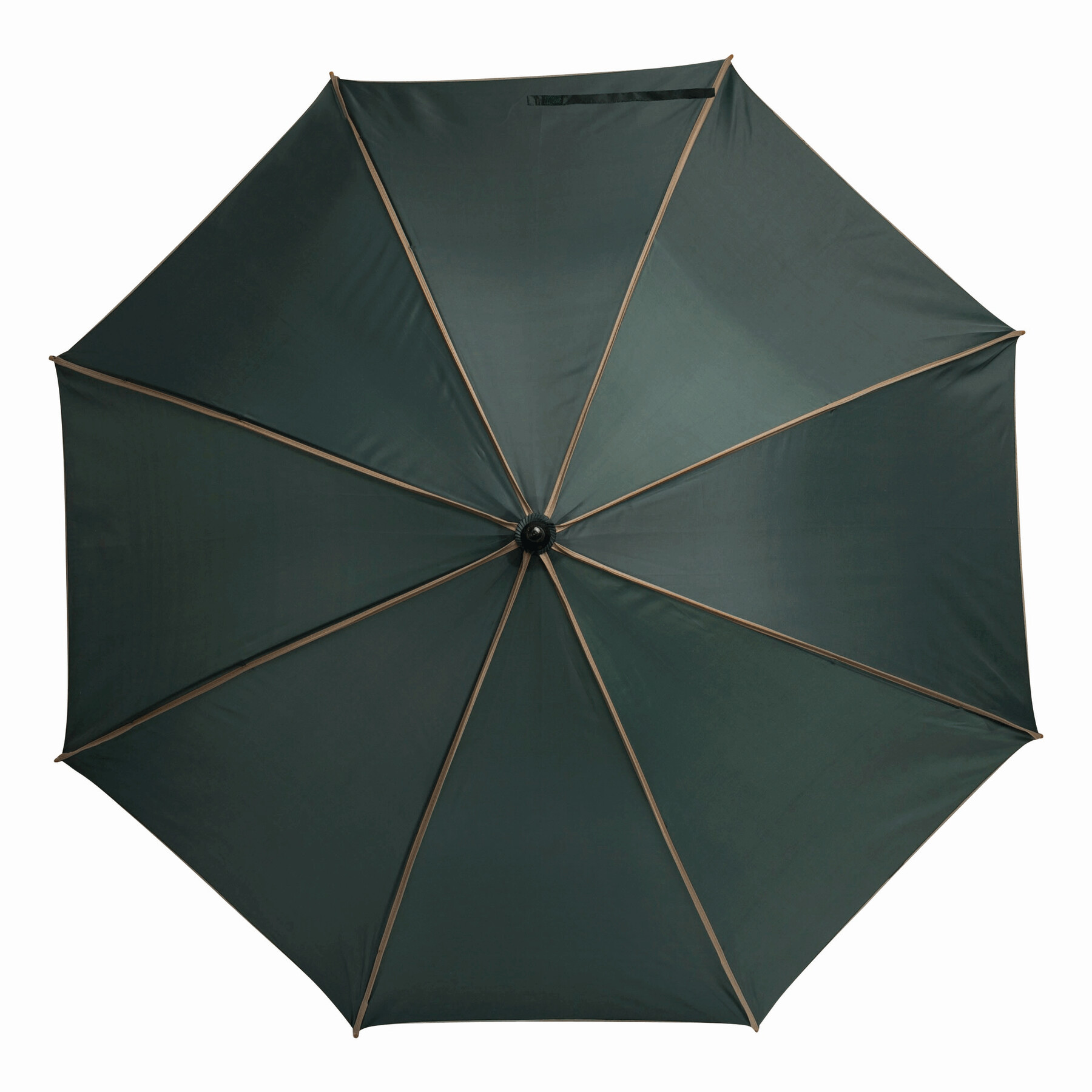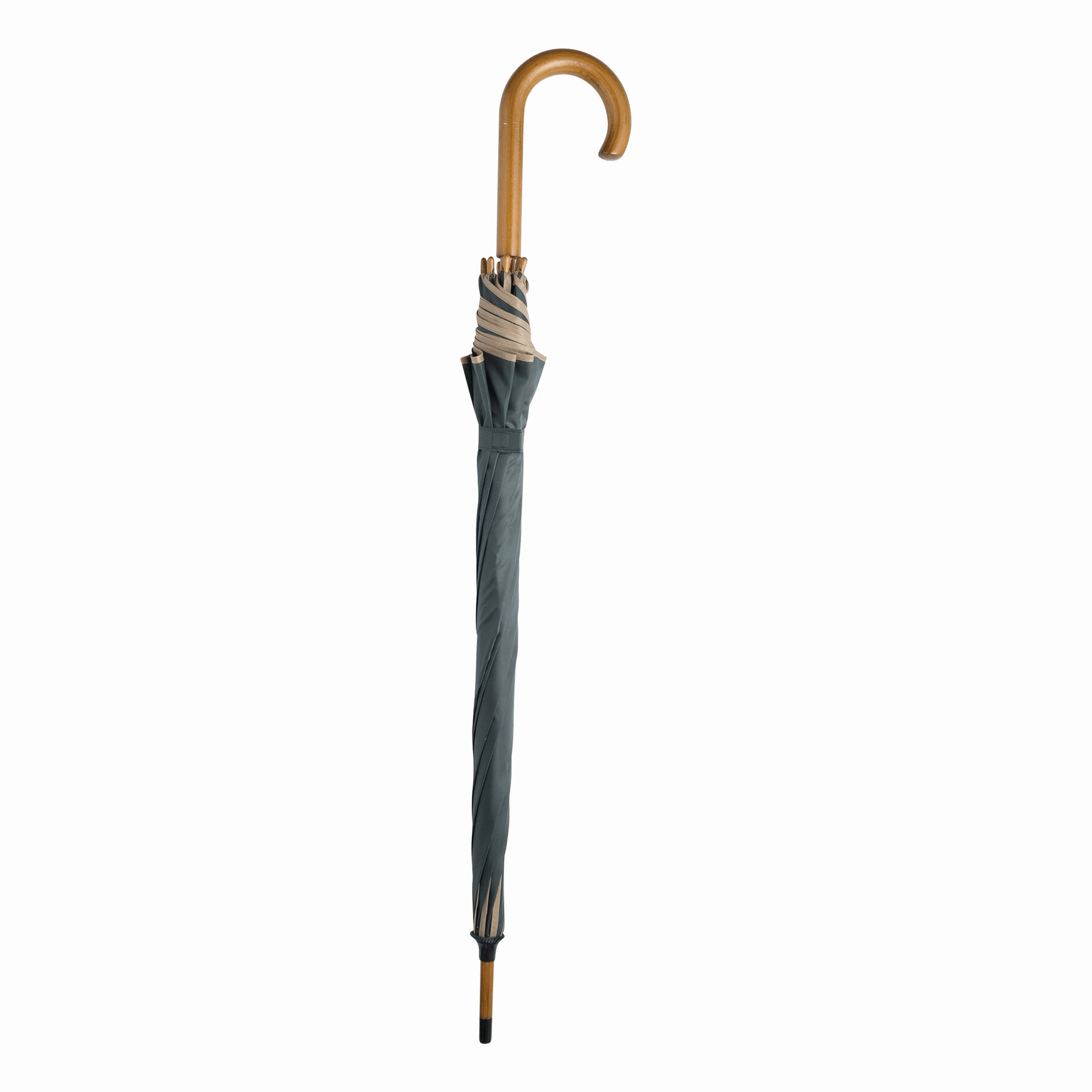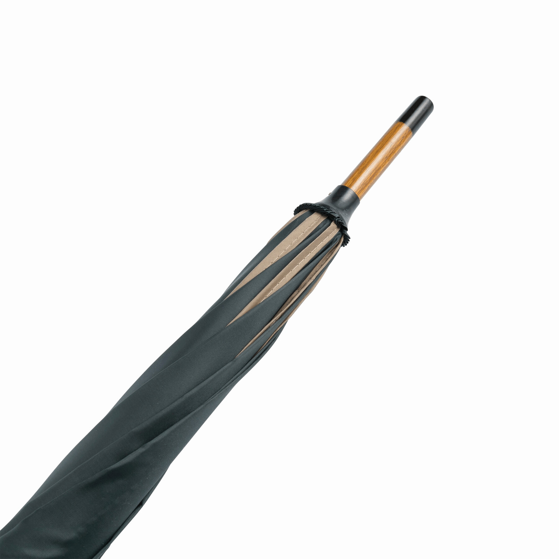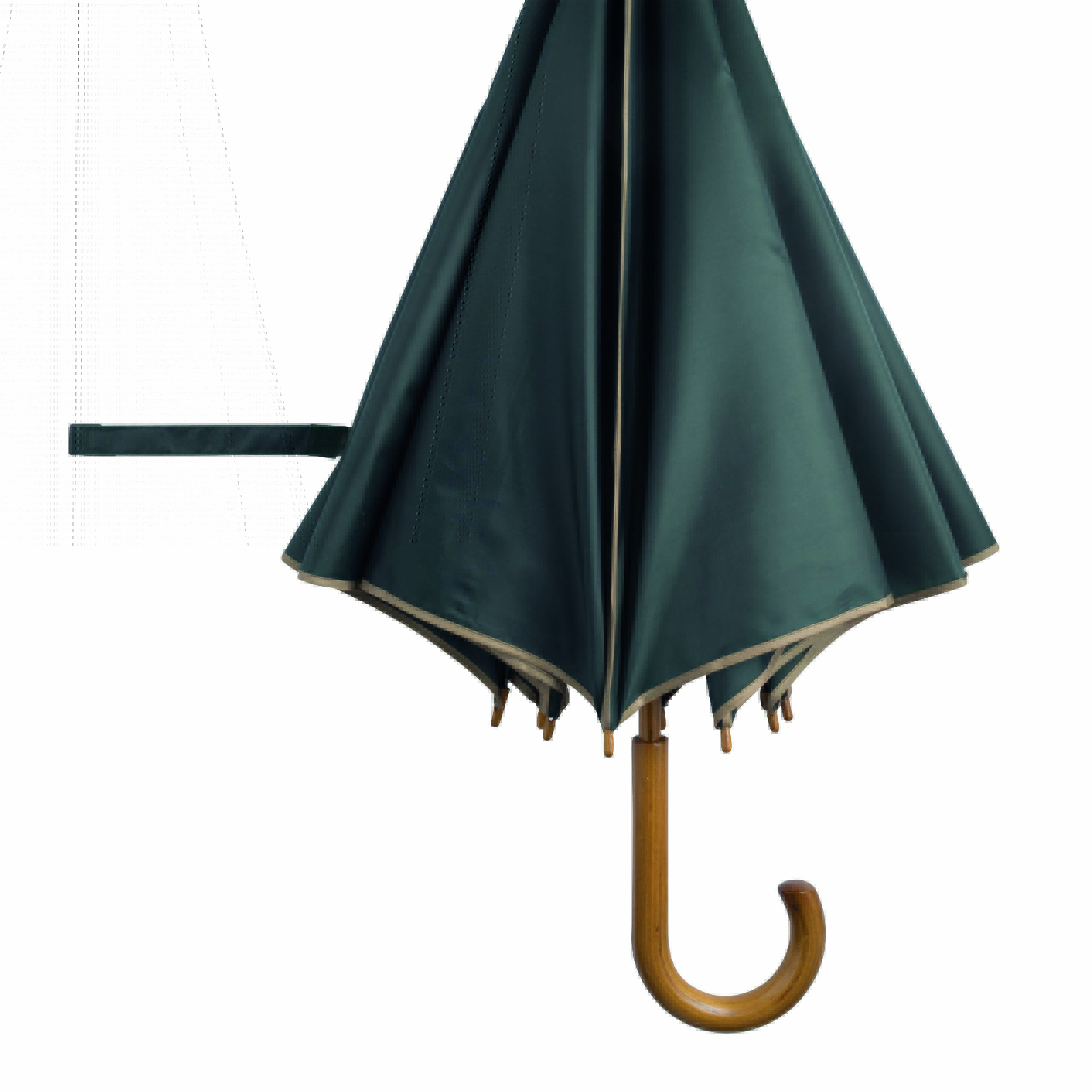 Automatyczny parasol WALTZ. Poszycie poliester 190 T, kontrastująca lamówka, czarne metalowe szyny, laska i uchwyt z drewna w kolorze orzecha włoskiego.