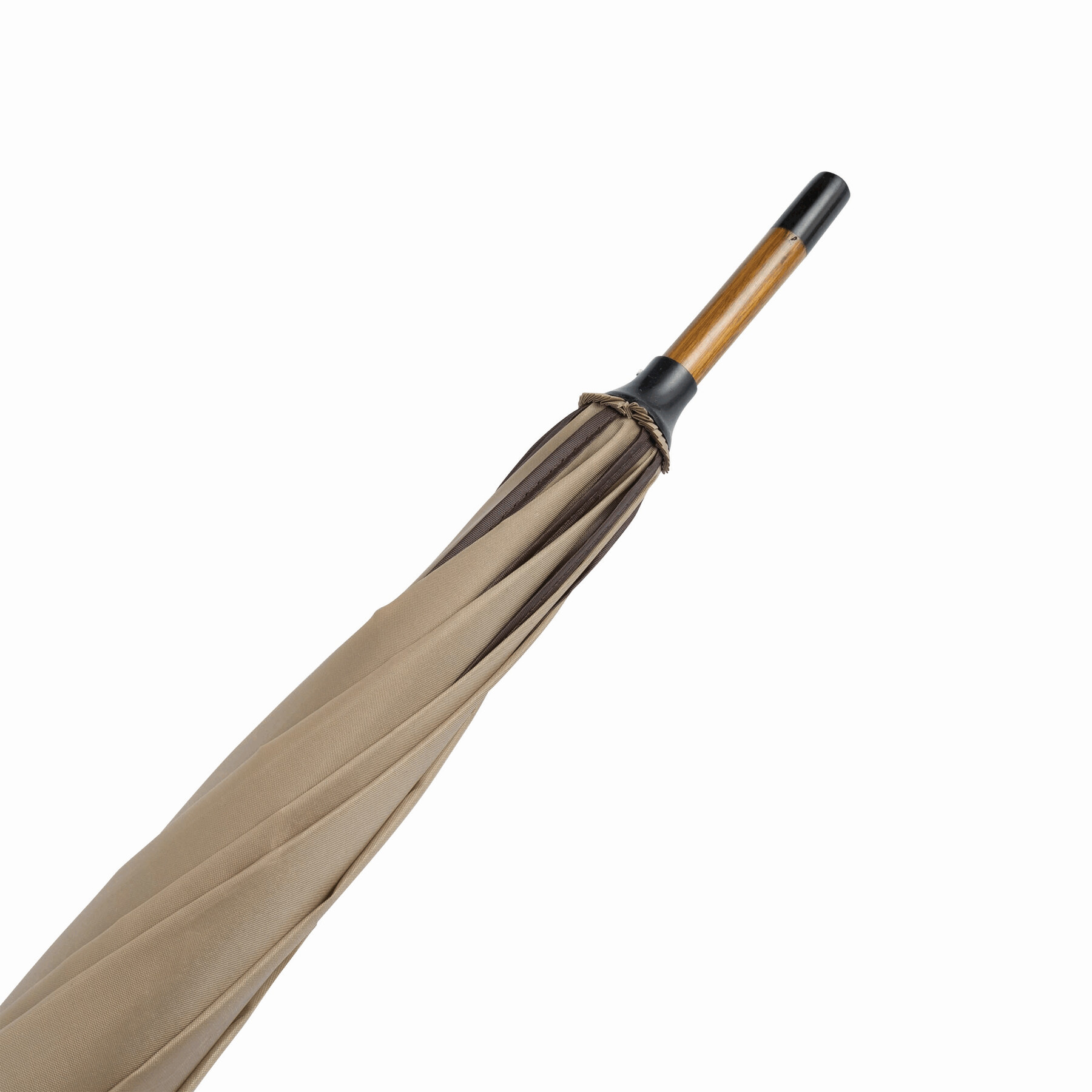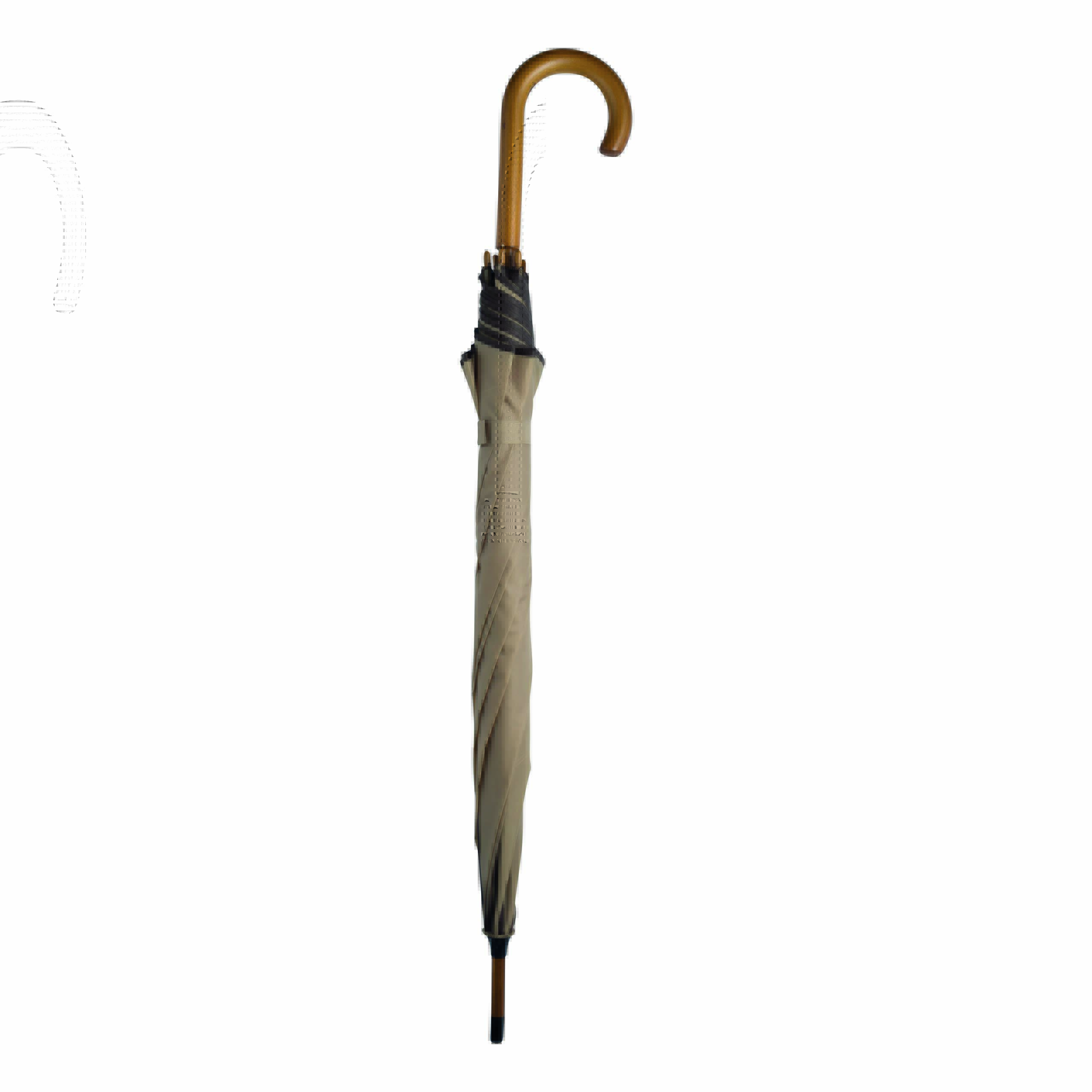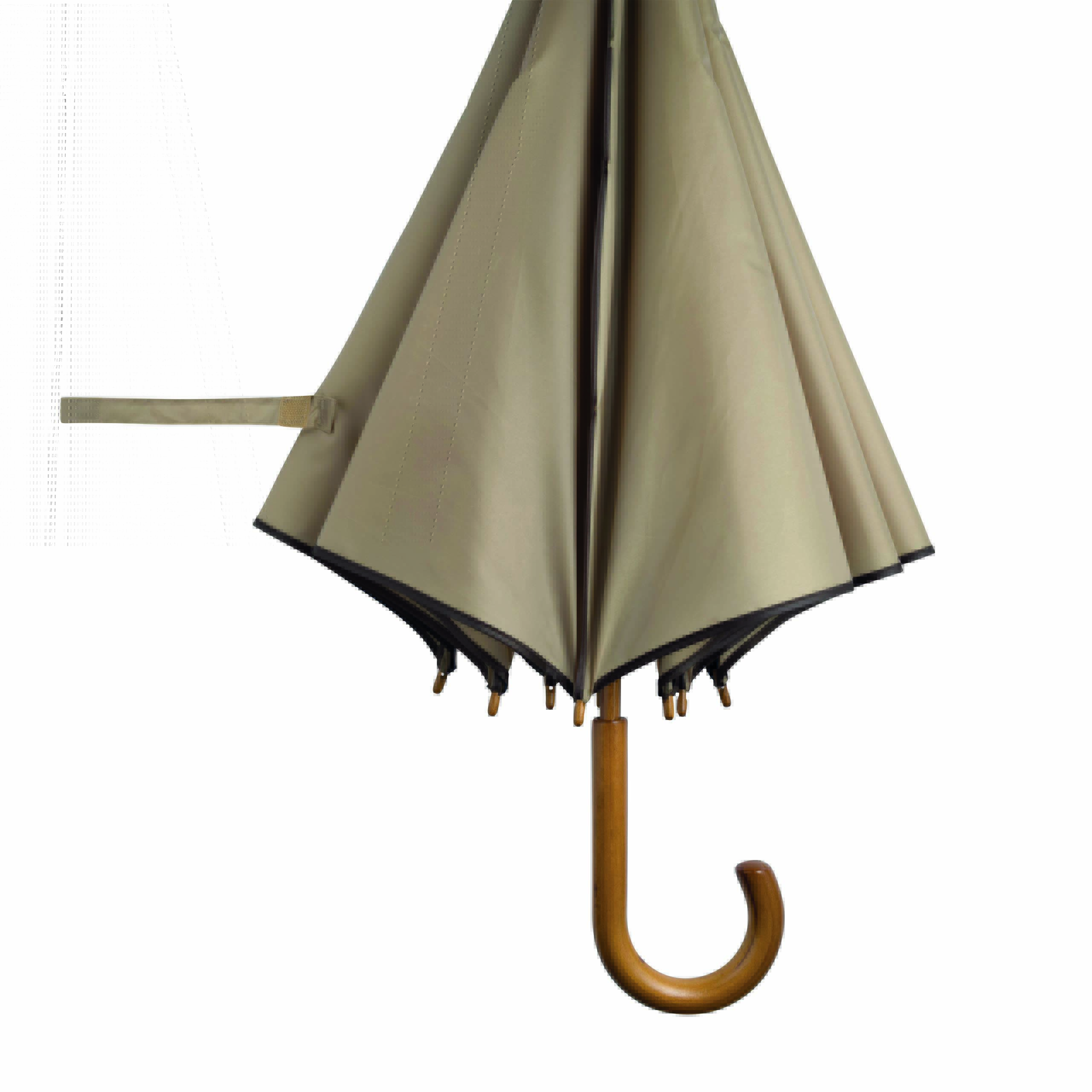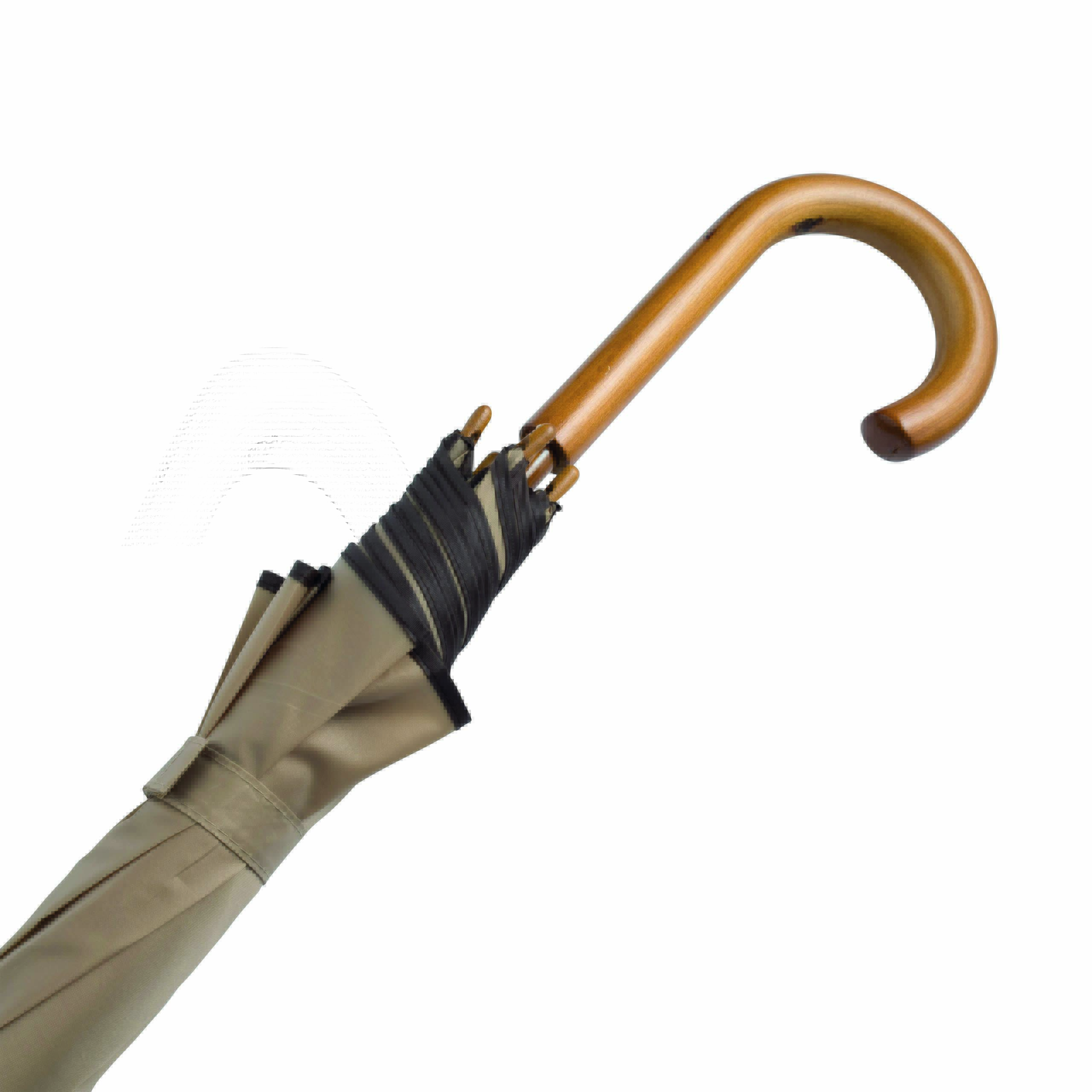 Automatyczny parasol WALTZ. Poszycie poliester 190 T, kontrastująca lamówka, czarne metalowe szyny, laska i uchwyt z drewna w kolorze orzecha włoskiego.