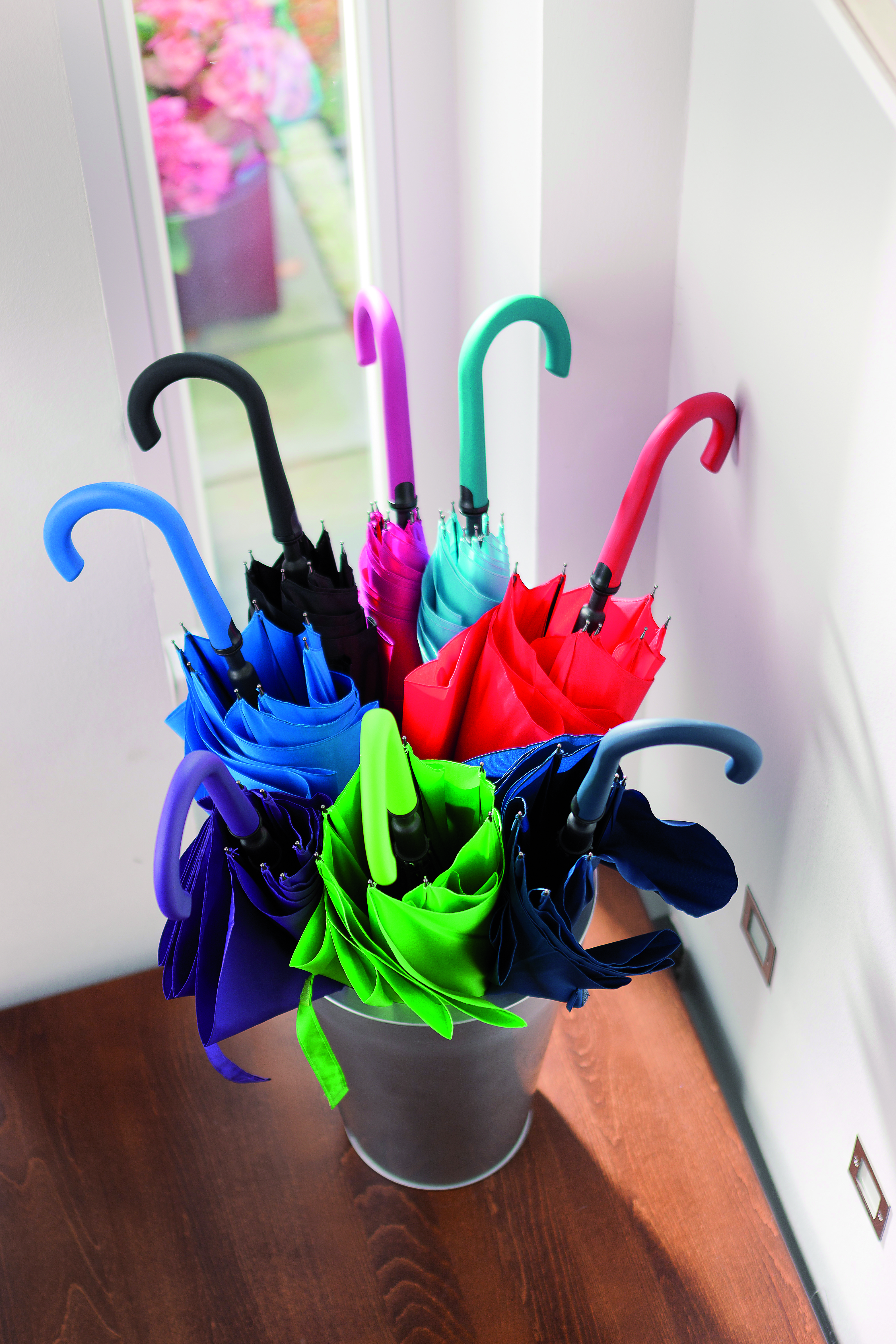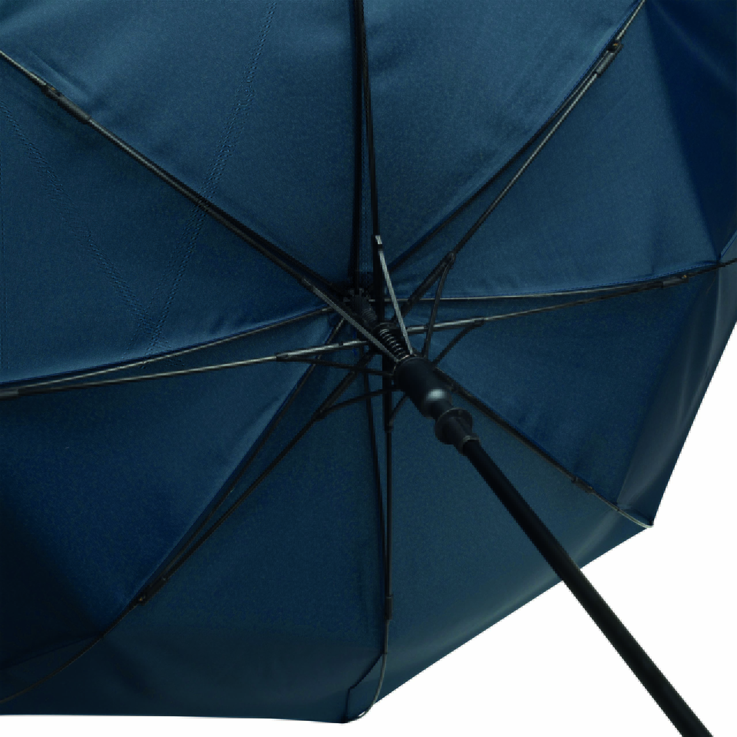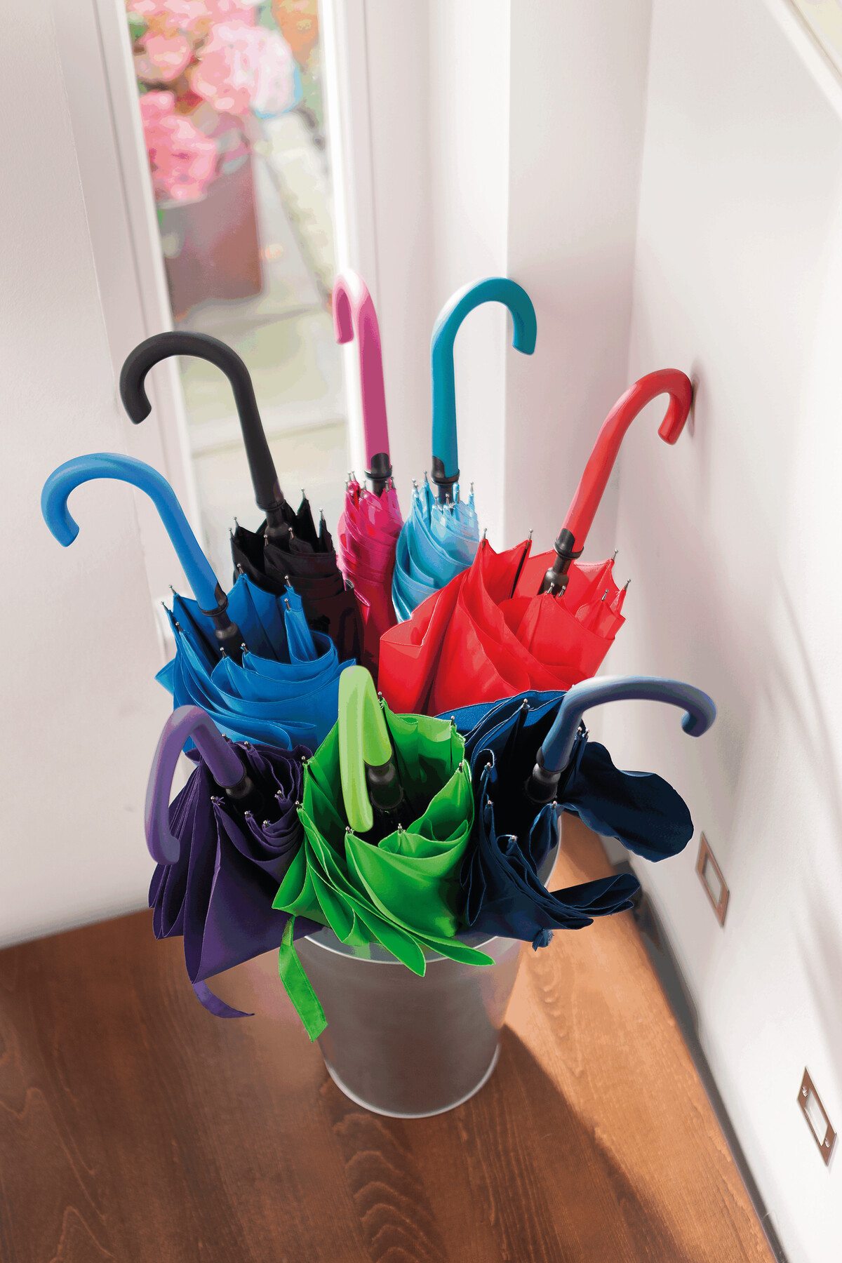 Parasol automatyczny LAMBARDA z metalową laską, szynami z włókna szklanego, metalowymi kolcami, uchwytem pokrytym gumą, z wbudowanym przyciskiem, poszycie z poliestru pongee ze specjalną wodoodporną powłoką, zapięcie na rzep. Wiatroodporny.