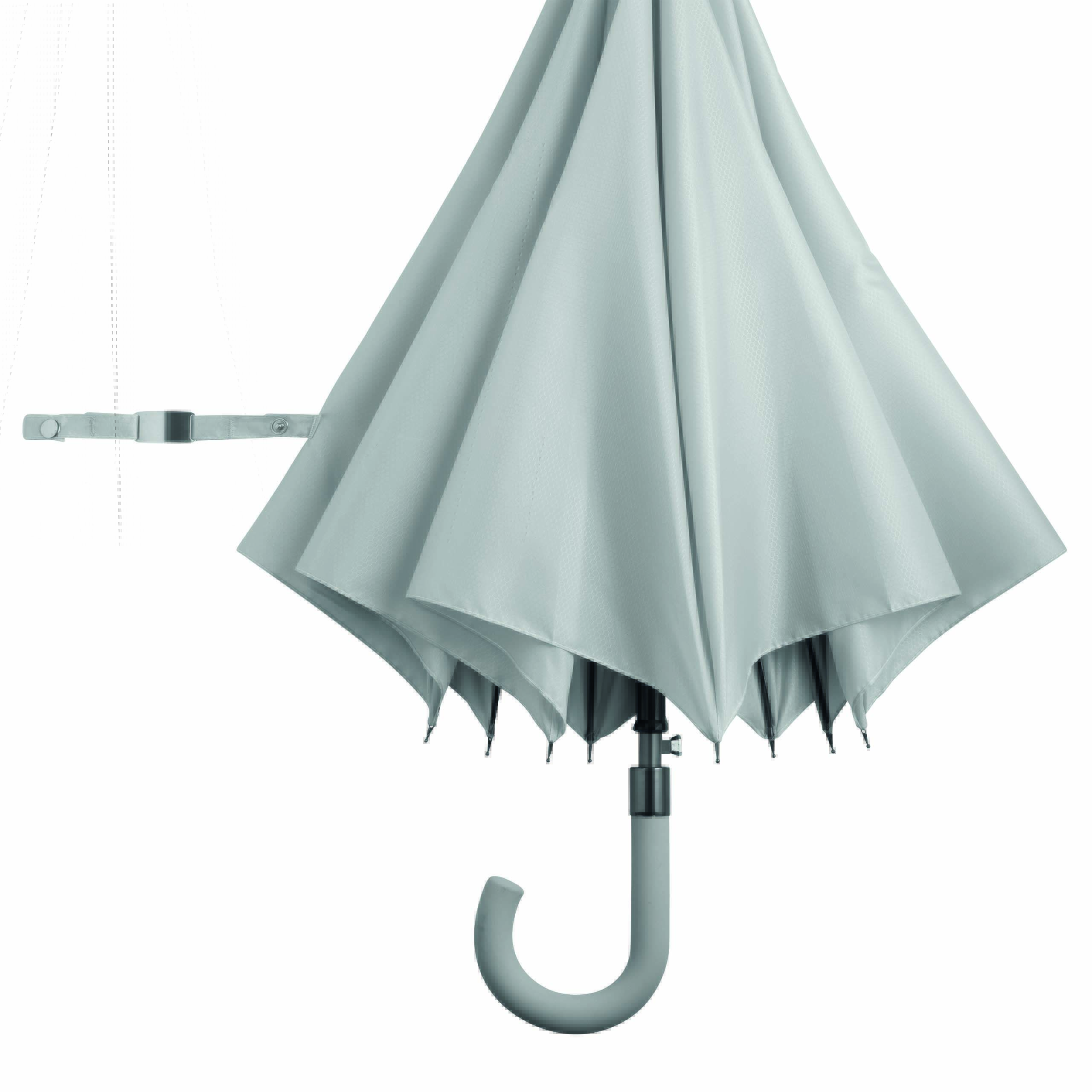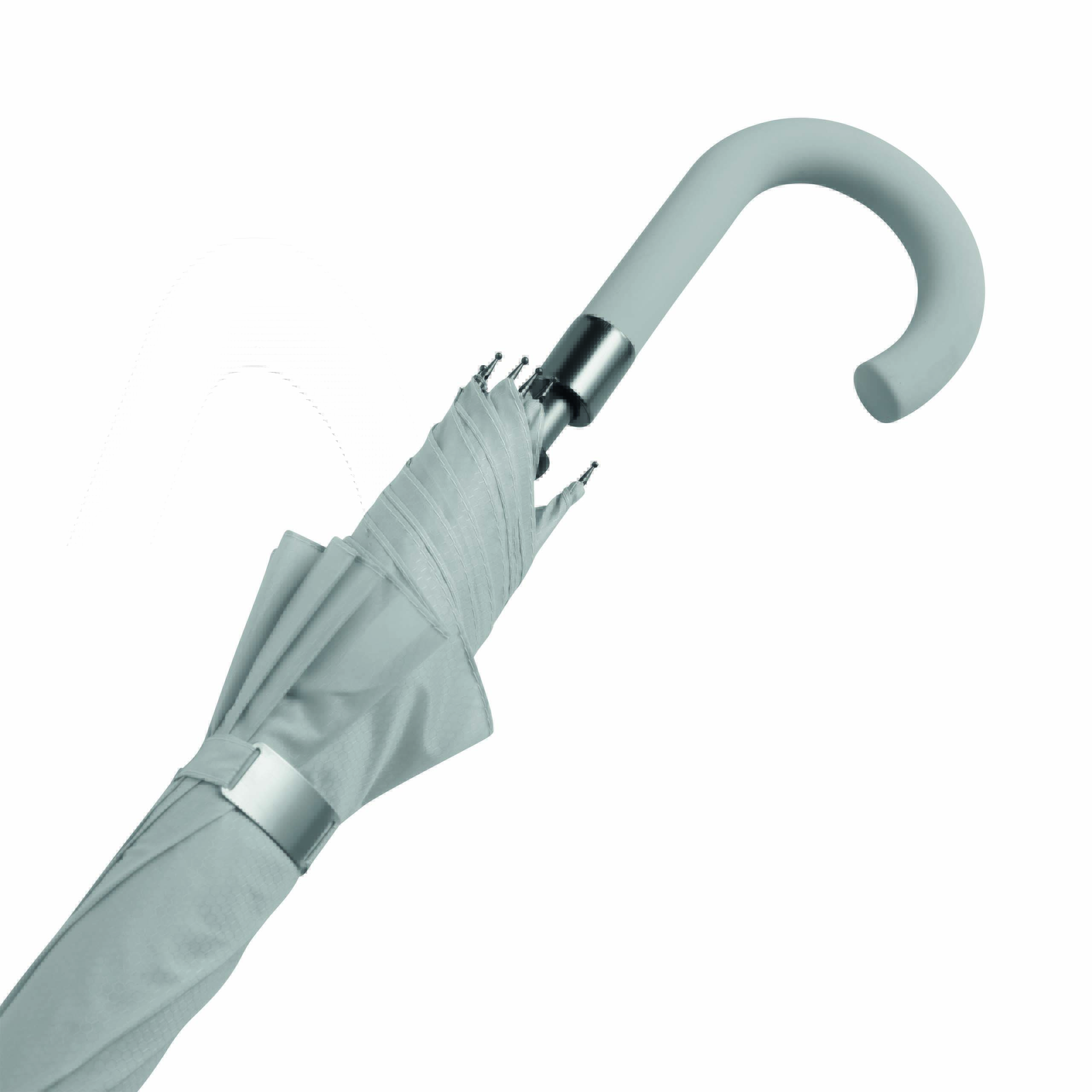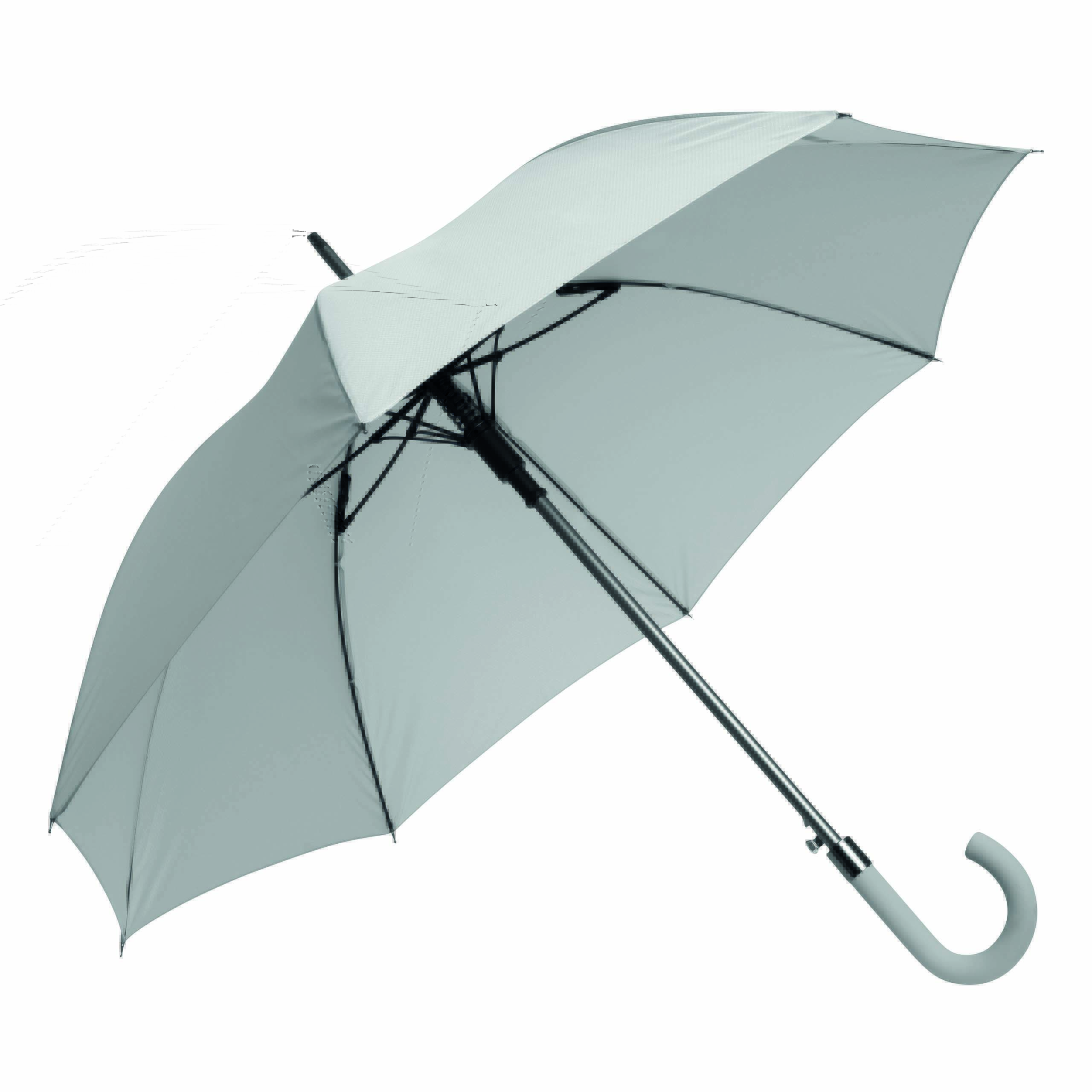 Automatyczny parasol JUBILEE. Aluminiowa laska, szyny z włókna szklanego, metalowe kolce, dopasowany kolorystycznie, gumowany, zaokrąglony uchwyt, poszycie z poliestru z pokrowcem o strukturze plastrów miodu, pasek spinający z zapięciem na zatrzask i metalową płytką na logo.