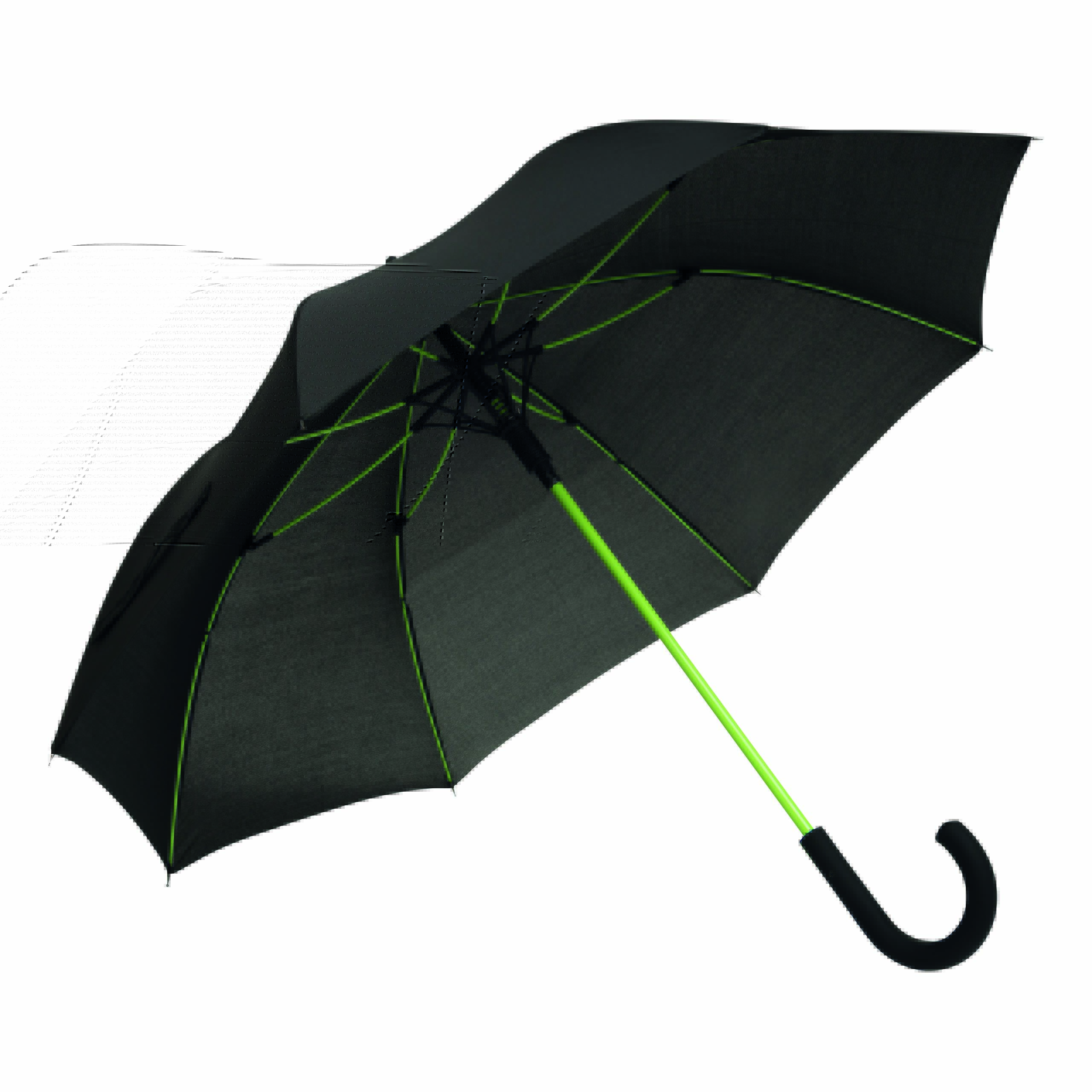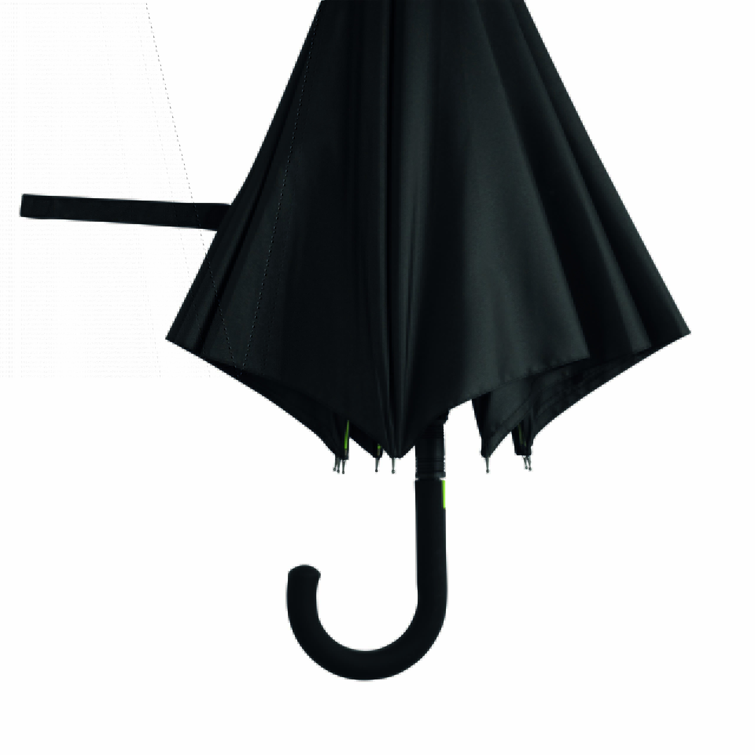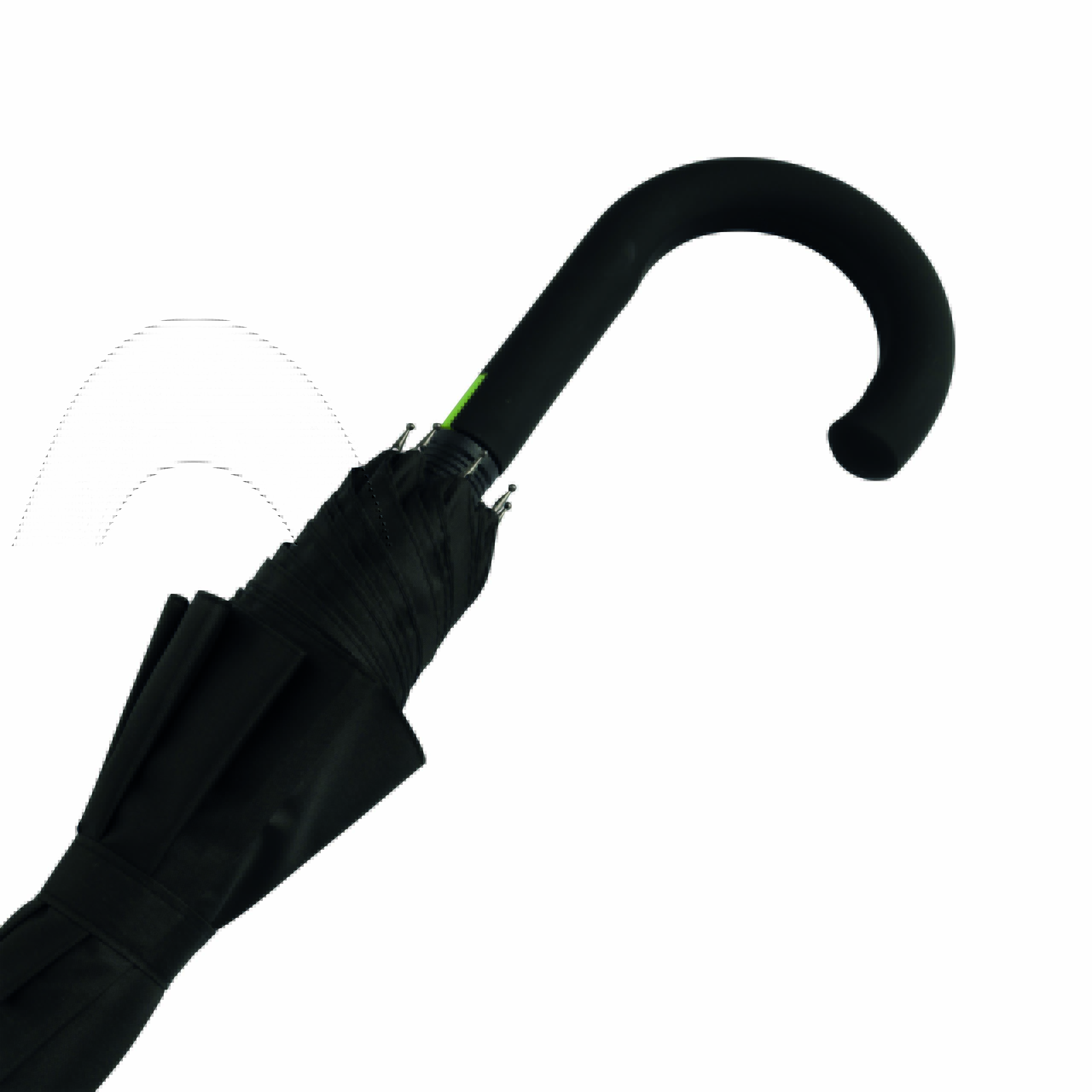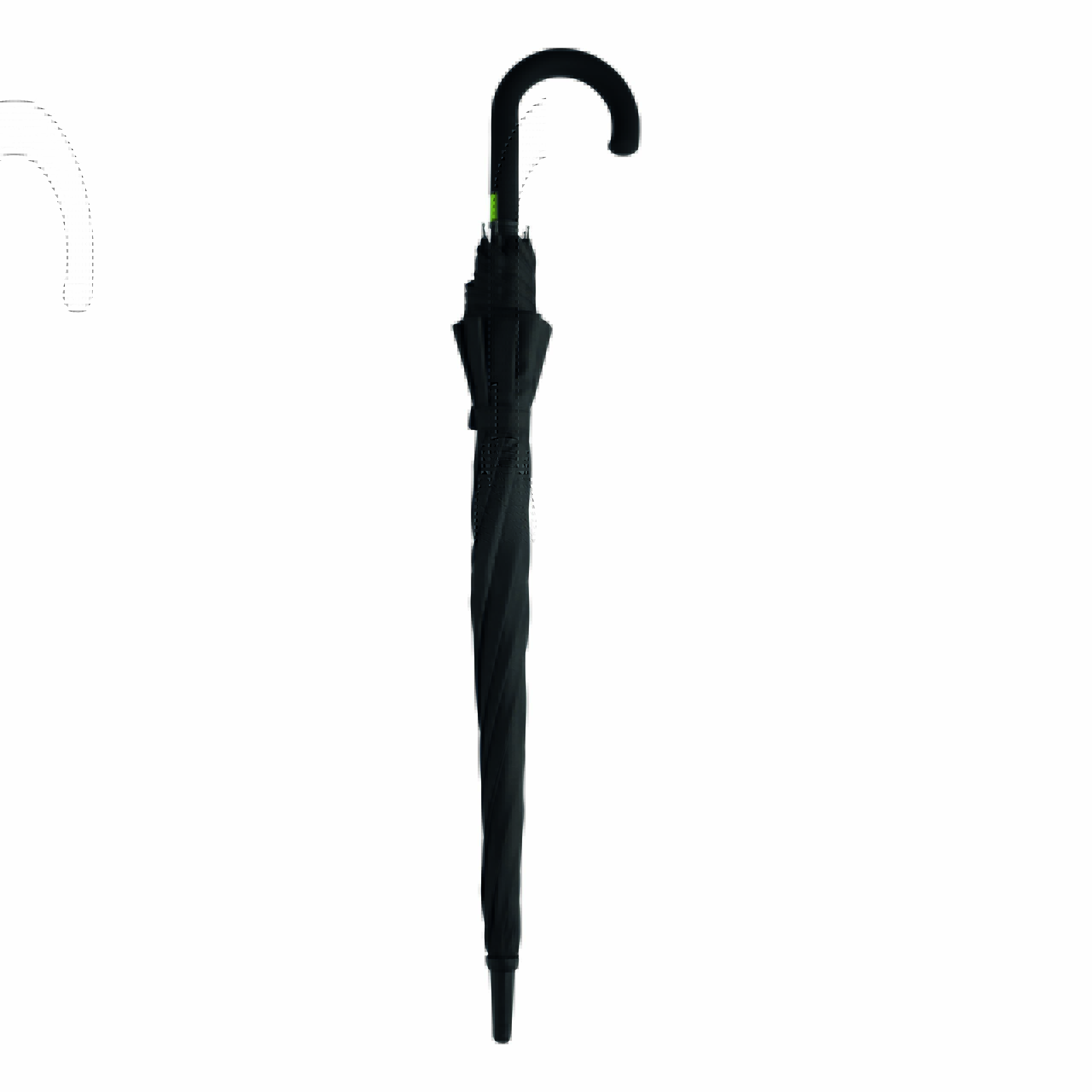 Automatyczny parasol CANCAN z metalową laską oraz kolorowymi szynami z segmentami z włókna szklanego, metalowymi kolcami, wykończona gumą laska z wbudowanym kolorowym automatycznym przyciskiem, poszycie z poliestru pongee i paskiem spinającym zapinanym na rzep.