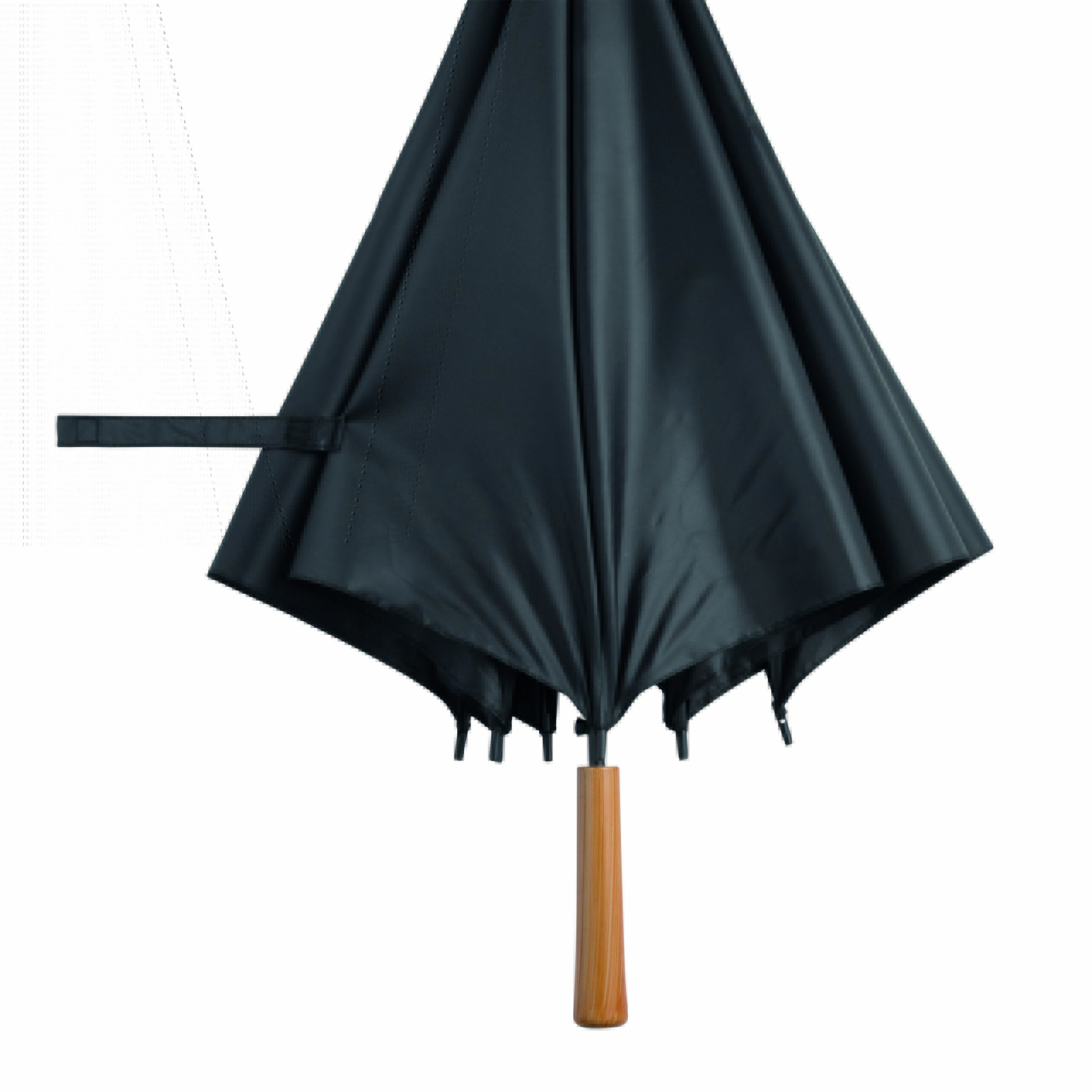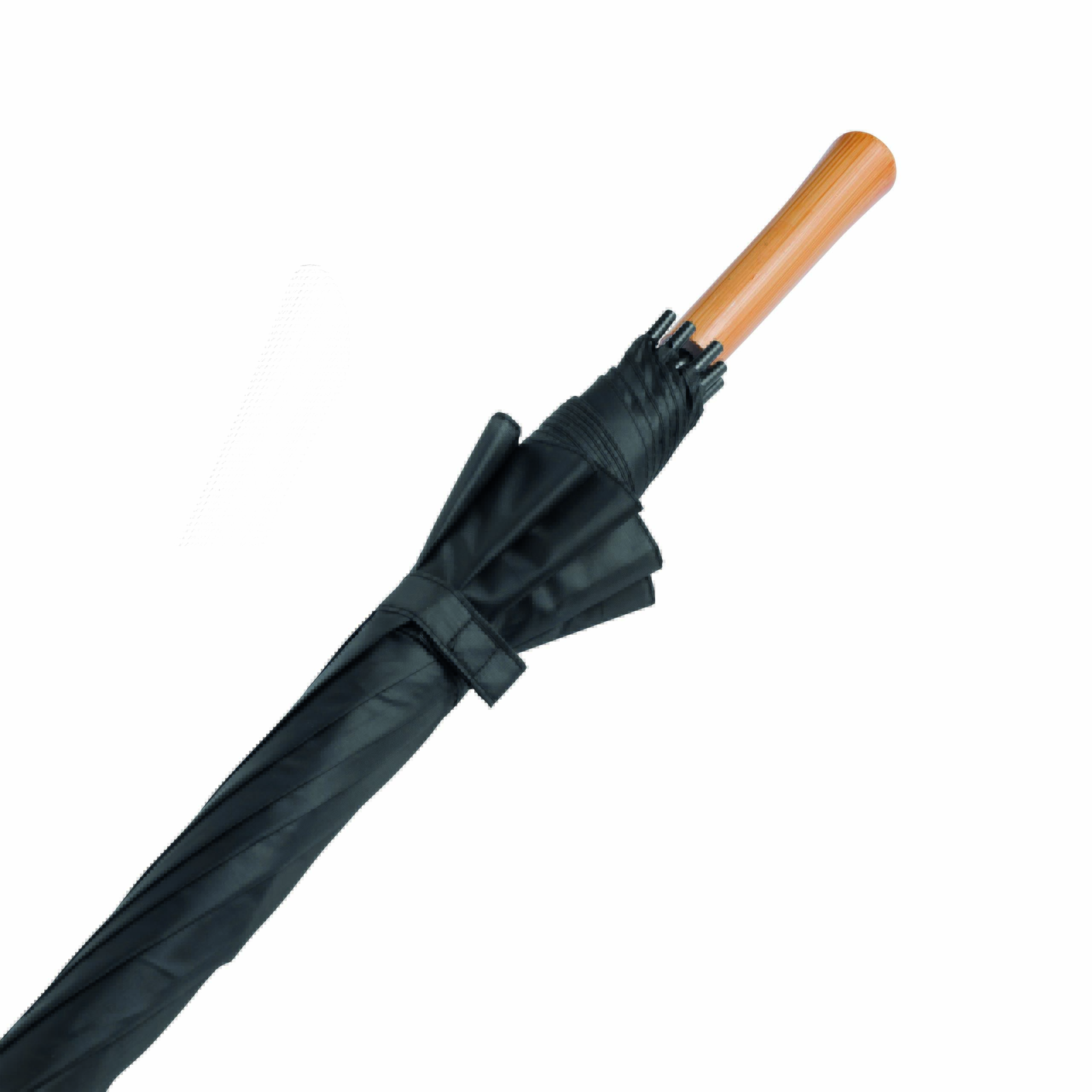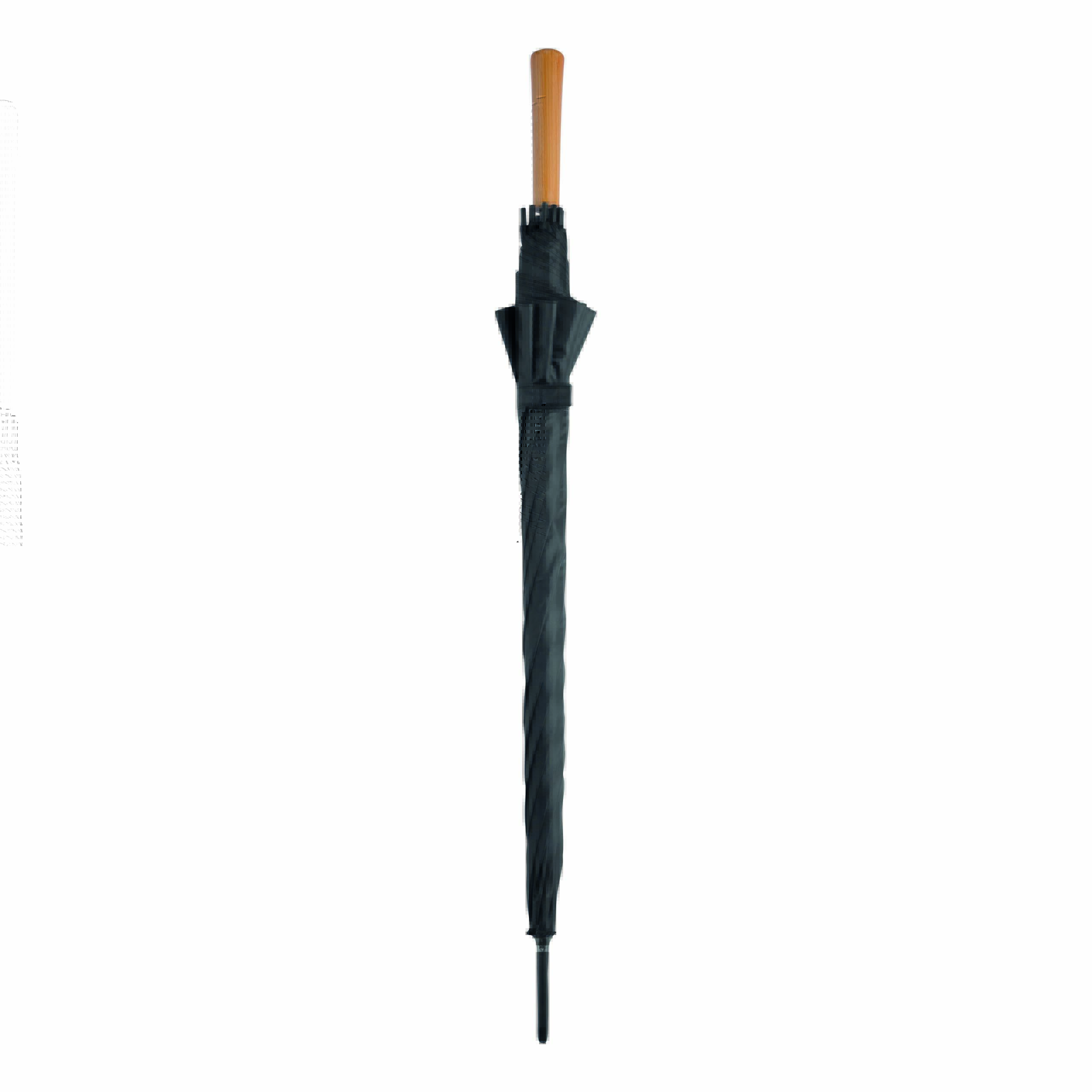 Automatyczny parasol LIMBO z metalową laską i szynami oraz plastikowymi kolcami dopasowanymi kolorystycznie, uchwyt z drewnopodobnym wykończeniem, poszycie poliestrowe, zamknięcie na rzep Velcro.